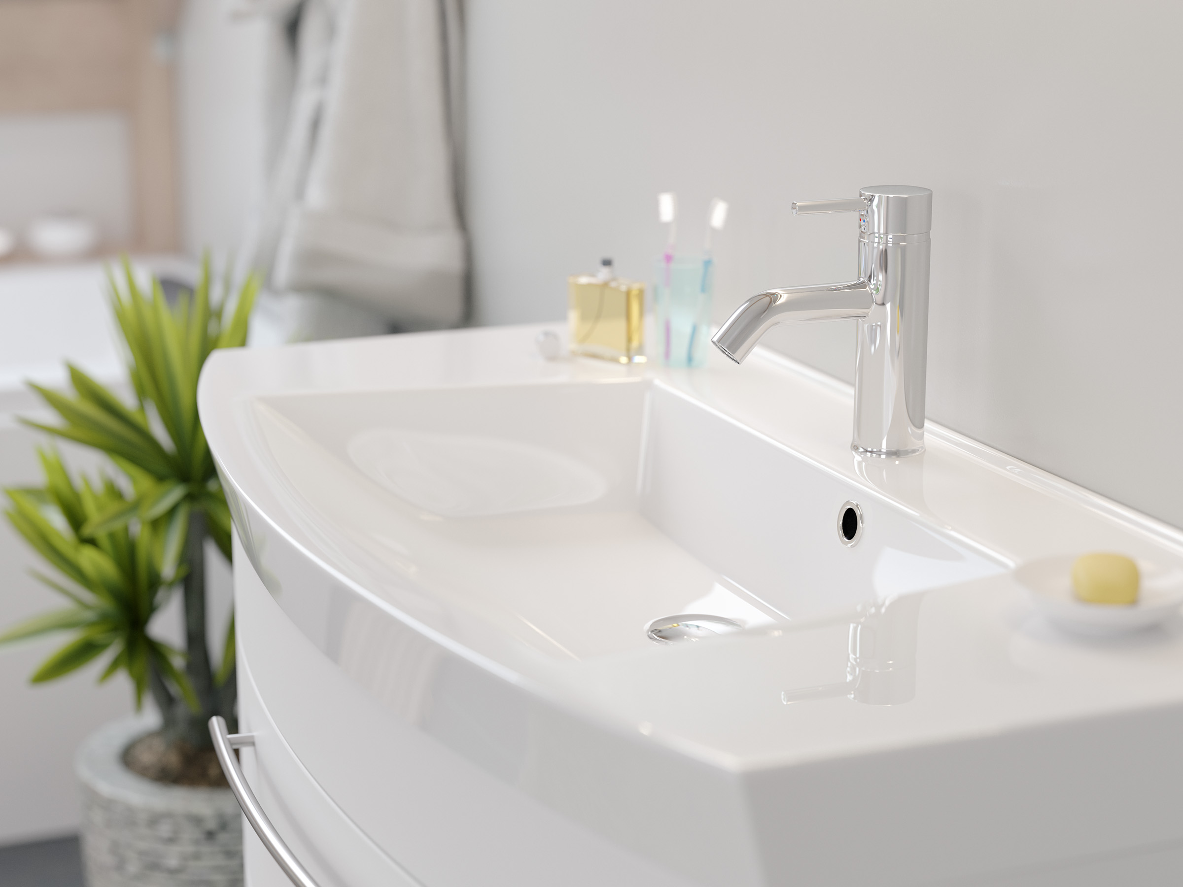 Mineralguss Waschbecken: Im praktischen Gebrauch immer beliebter ist ein Mineralguss-Waschbecken. Entstanden ist das flexible Material, weil Designer neue Formen ausprobieren wollten, die relativ einfach mit diesem inzwischen bewährten Badezimmermaterial hergestellt werden können. Auch in der Badmöbelserie BELLA kommt der Design-Aspekt groß zur Geltung in dem schönen Kontrast der abgerundeten Front mit der geraden Linienführung des Beckens.
