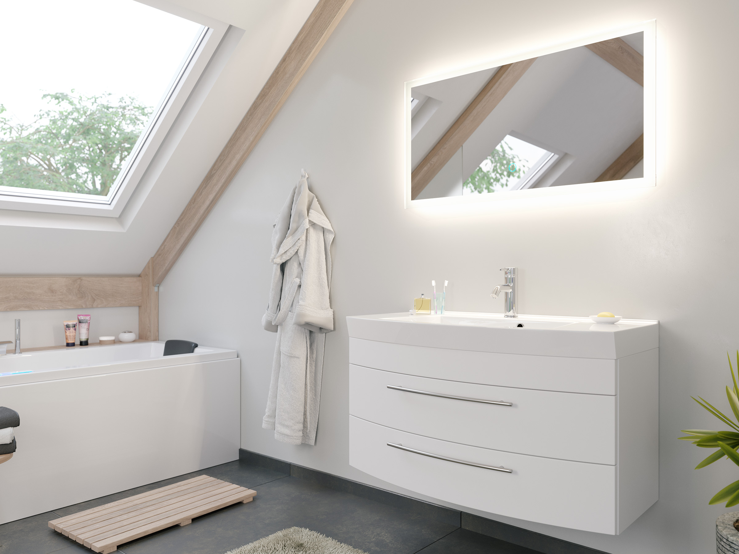 Badmöbel Bella 100 mit runder Front SoftClose lackiert weiss matt LED Spiegel