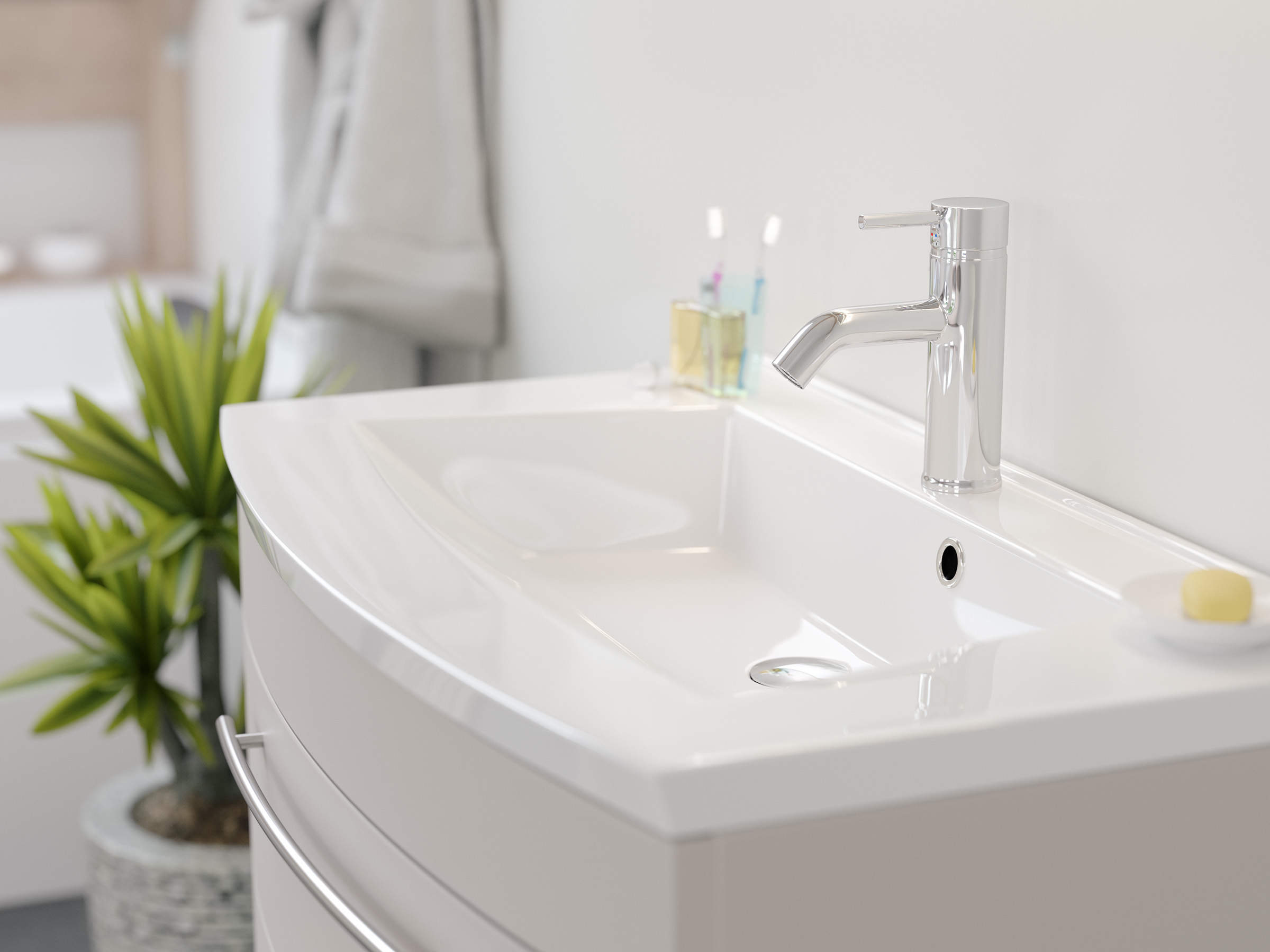Ein herausragendes Qualitätsmerkmal unserer Badmöbel sind die hervorragend verarbeiteten Oberflächen. Die Beschichtung ist - sowohl über die Frontseite, als auch über die sichtbaren Seitenteile - über die Kanten und Ecken tiefgezogen und weich abgerundet.