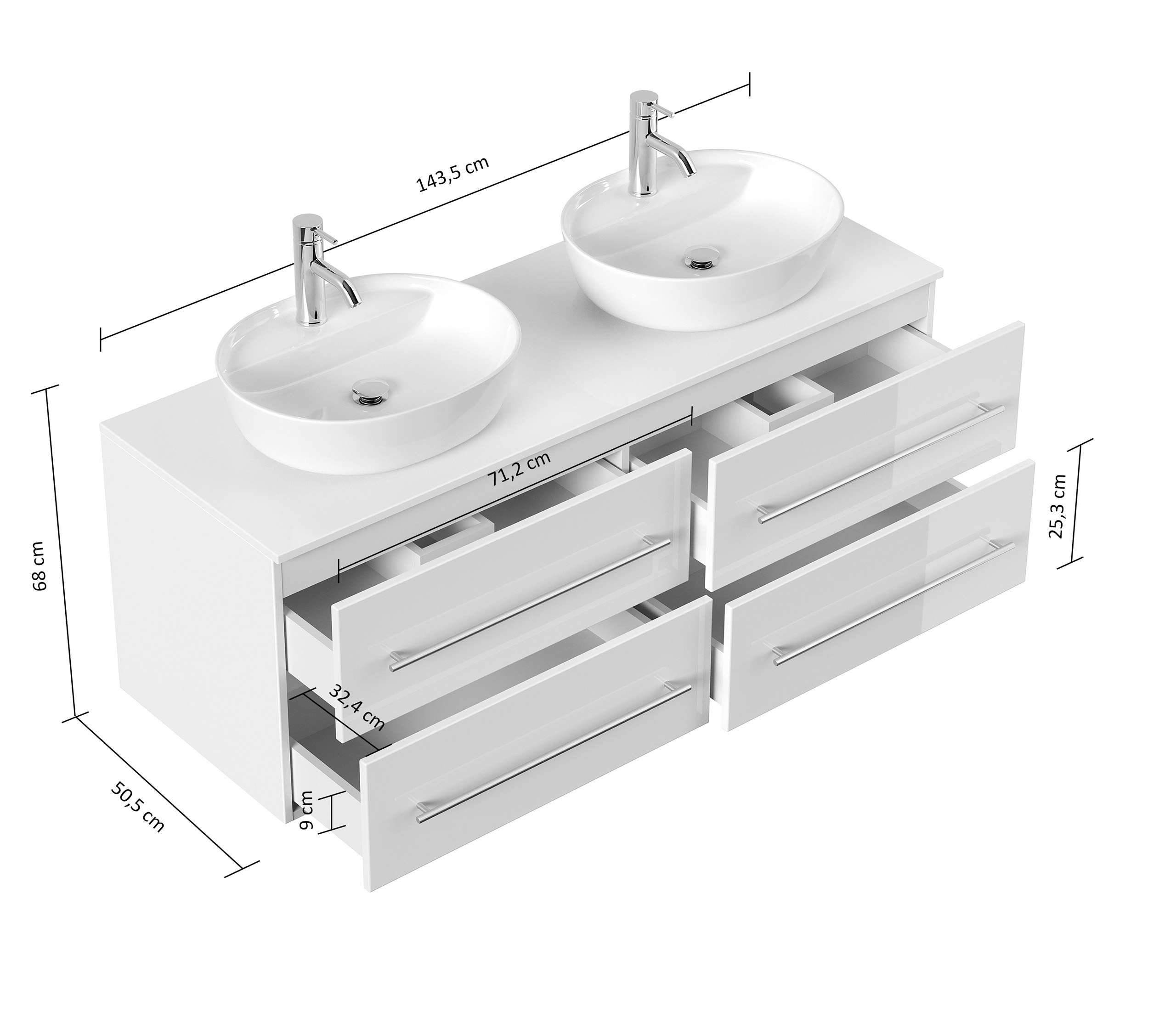 Badmöbel Waschtisch Unterschrank 4 Schubladen mit Softclose (B/H/T) 143,5/51,5/50,5 cm.