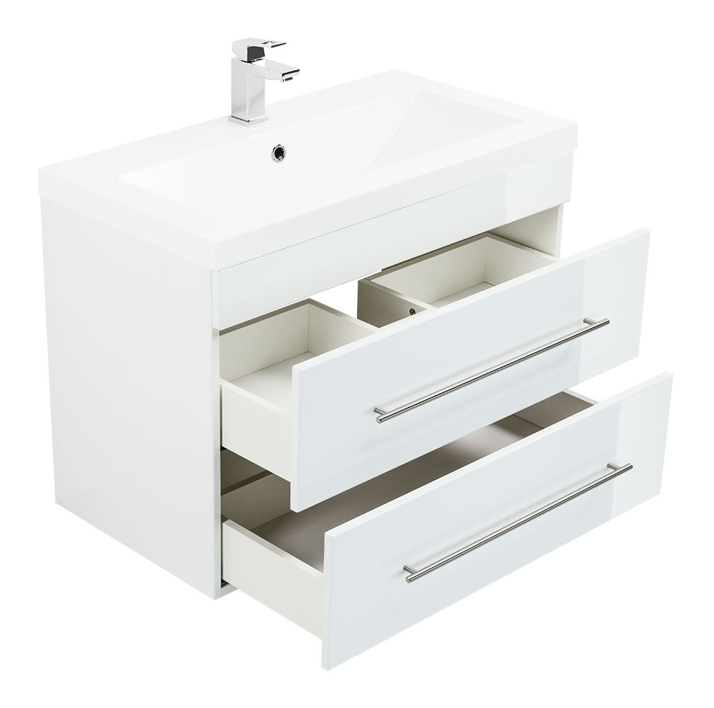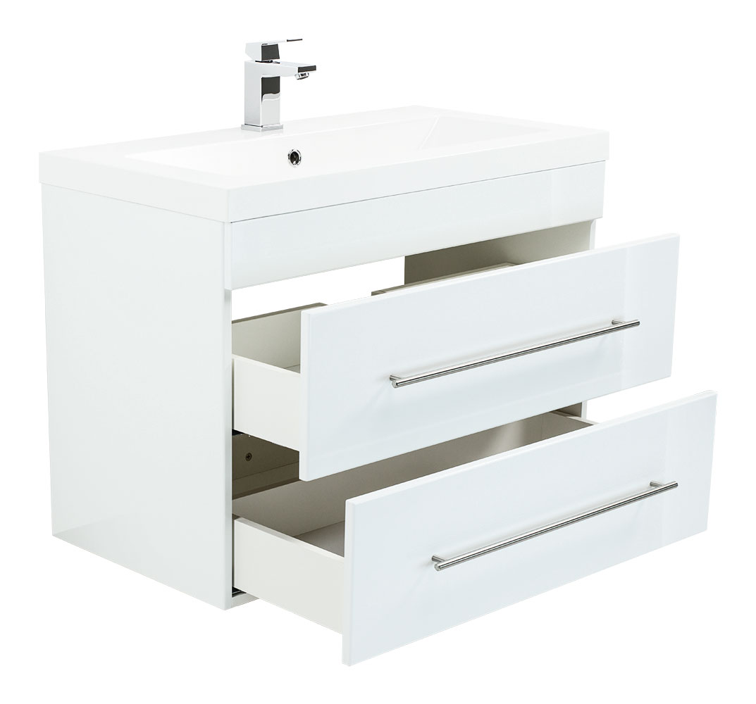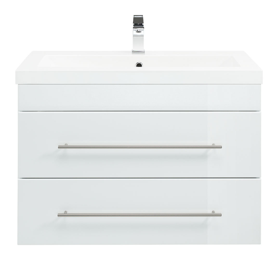 Dieser vortreffliche Waschtisch bietet Ihnen eine exzellent gelungene Kombination aus feinem Design und optimierter Funktion. Ausgestattet mit Unterschrank und Waschbecken dient das Wohnobjekt als wertvolle Ergänzung des Bad-Interieurs. Der solide Waschbeckenunterschrank aus 16mm MDF designed in Germany verfügt über widerstandsfähige Melaminbeschichtung. Die integrierten Schubladen stellen viel Platz zur Verfügung. Dank der Marken-Soft-Close Schienen lassen sich die Schubladen leichtgängig ausziehen und schließen. Die Handgriffe aus mattiertem Edelstahl perfektionieren das Einzelbadmöbel. Profitieren Sie von allen Vorzügen des hochwertigen Waschtischs Infinity 850 und bestellen Sie noch heute ein Badmöbel mit Stil!Nicht im Lieferumfang enthalten sind beispielsweise Deko, Spiegel, Armatur, Zuleitungen zum Wasserhahn, der Siphon sowie in der Regel ebenfalls nicht der Waschbeckenverschluss Popup. Diese Artikel können gesondert bei uns erworben werden.