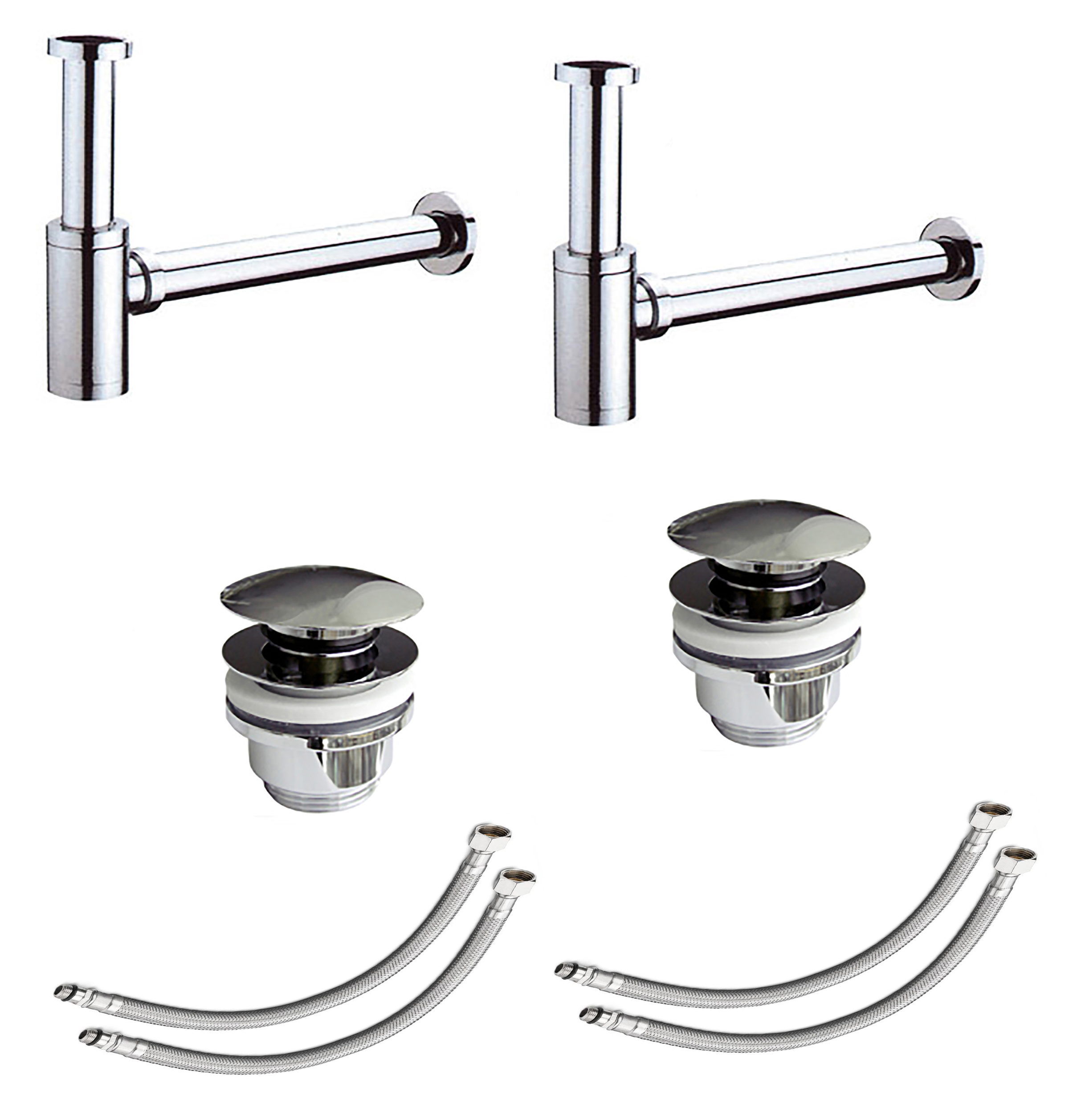 Lieferumfang: 2x Syphon2x Popup4x Zuleitungsschlauch Maße: Zuleitungen:3/8" Überwurfmutter auf M10x1 Gewinde Länge der Zuleitung: 50 cm Popup:Höhe ohne Verschluss 7,5cmHöhe mit Verschluss 8,6cmDurchmesser unten 4cmDurchmesser des Deckels 6,4cm Gewinde 1 1/4" Syphon:Höhe des Syphons 10,5cmLänge Verbindungsrohr zum Waschbecken 12,6cmLänge Verbindungsrohr zur Wand 30cm Downloads zu diesem Artikel: Download Montageanleitung Popup