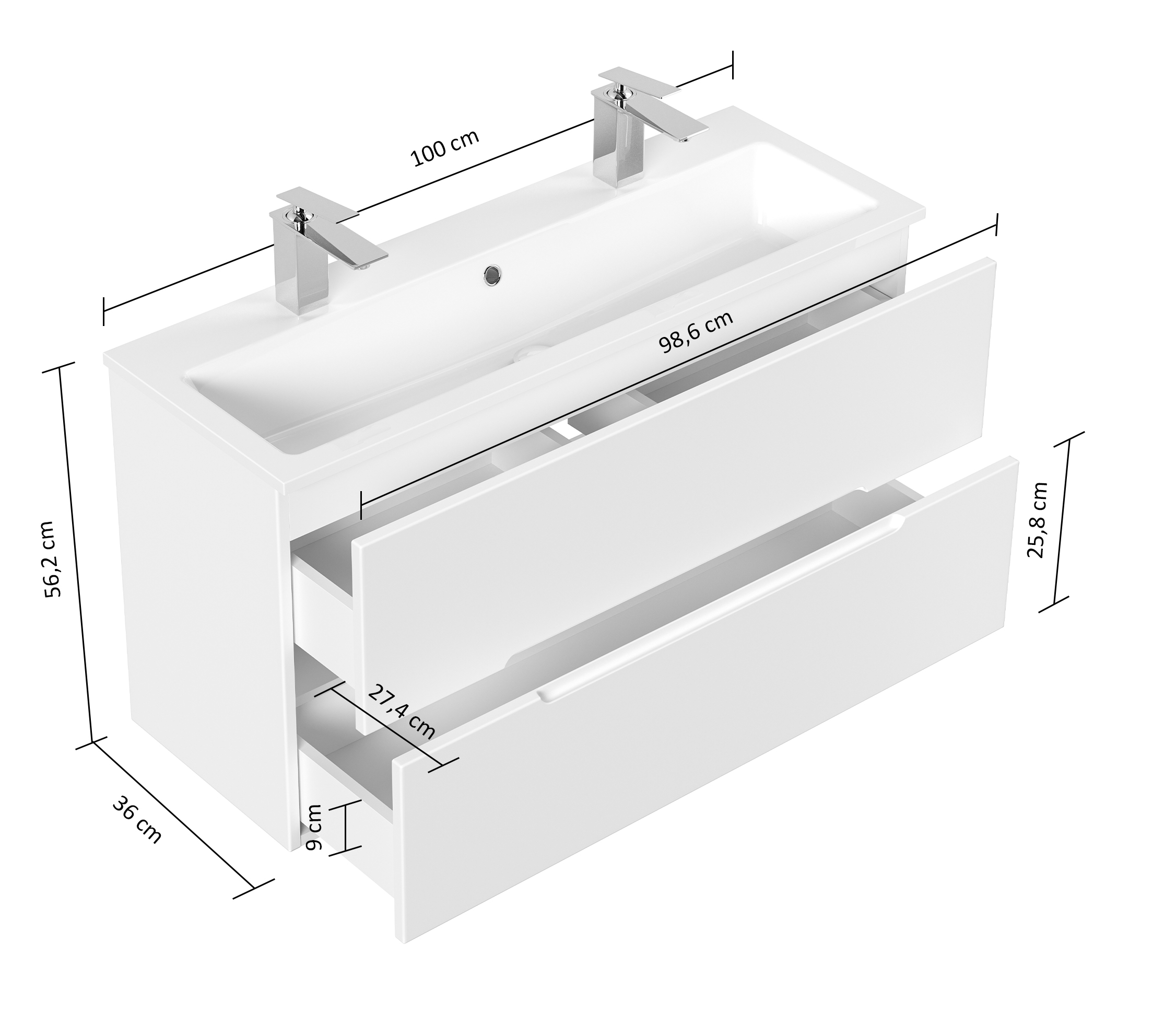 Badmöbel Waschtisch Unterschrank 2 Schubladen mit Softclose (B/H/T) 100/56,2/36 cm.
