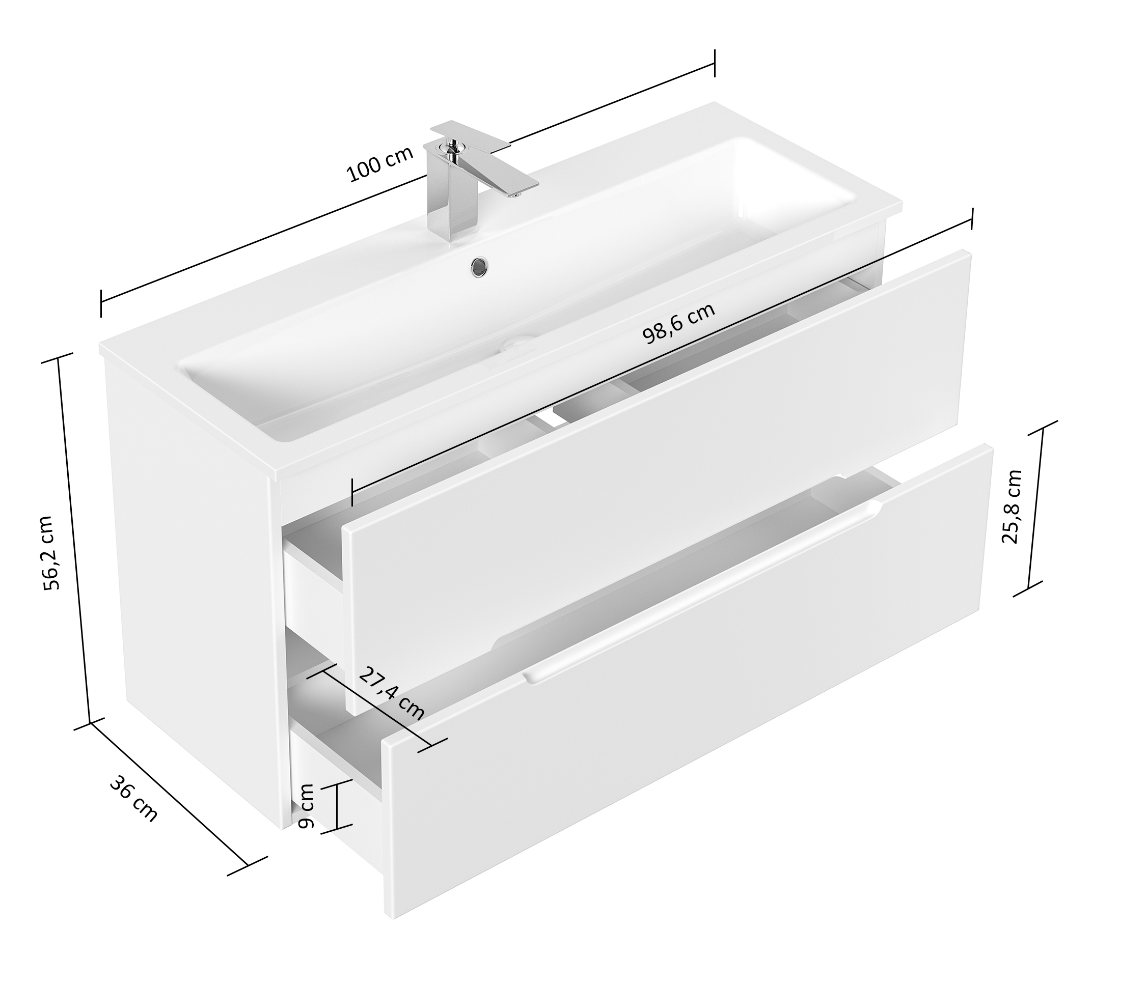 Badmöbel Waschtisch Unterschrank 2 Schubladen mit Softclose (B/H/T) 100/56,2/36 cm.