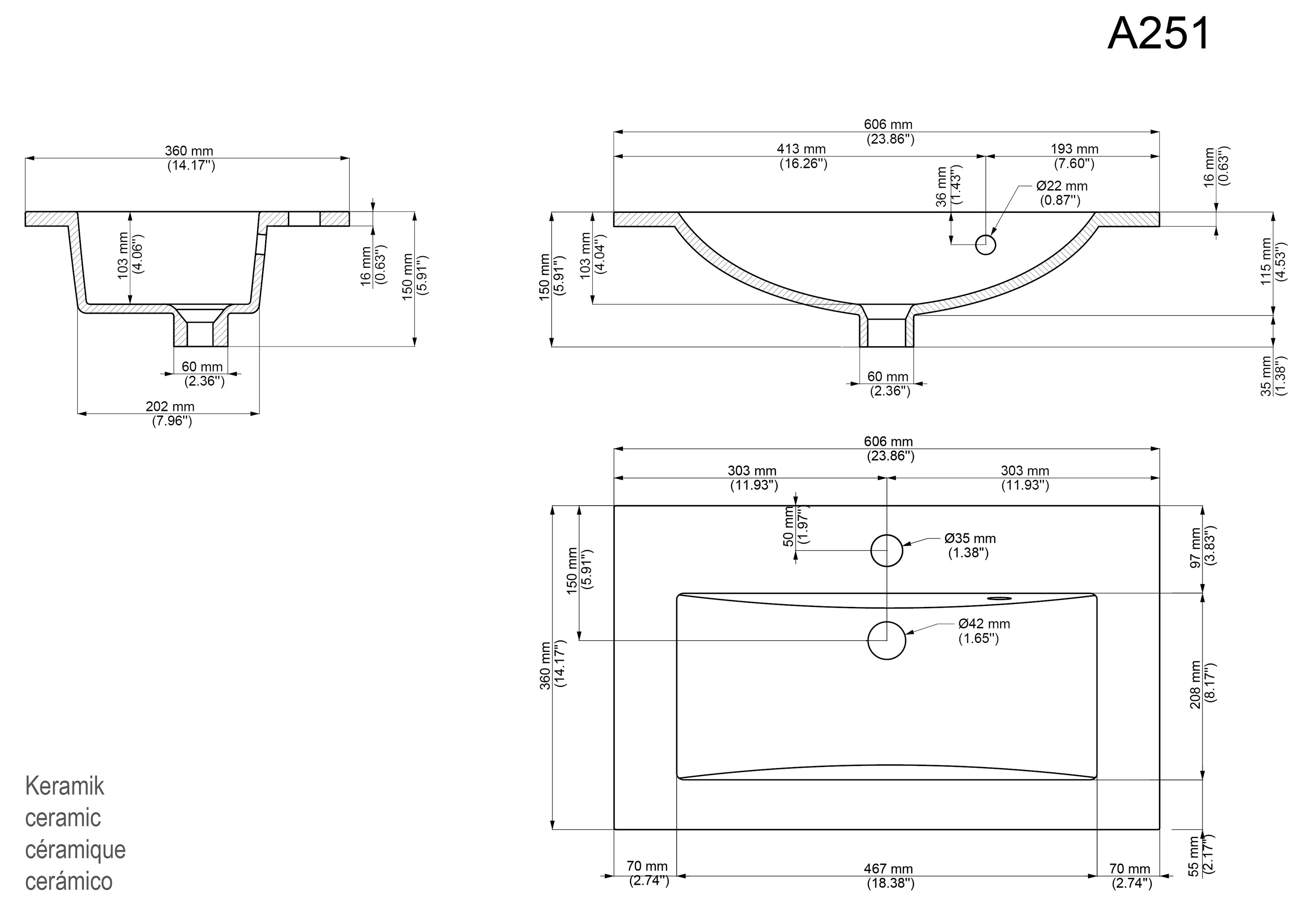 Waschbecken Keramik mit Überlauf (B/H/T) 60,6/1,6/36 cm.