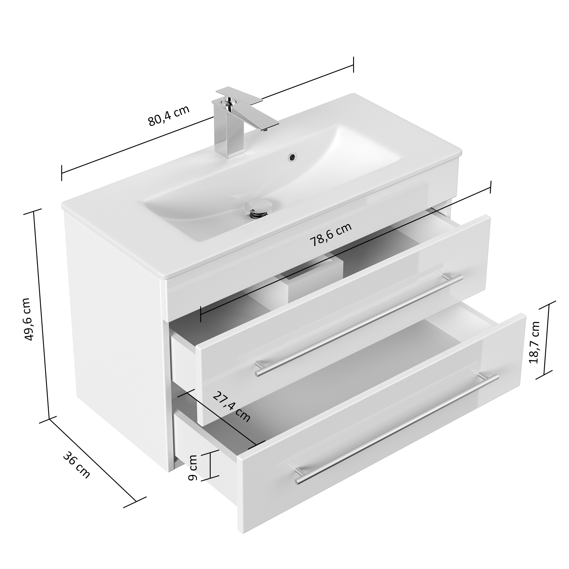Badmöbel Waschtisch Unterschrank 2 Schubladen mit Softclose (B/H/T) 79/48/35,5 cm.