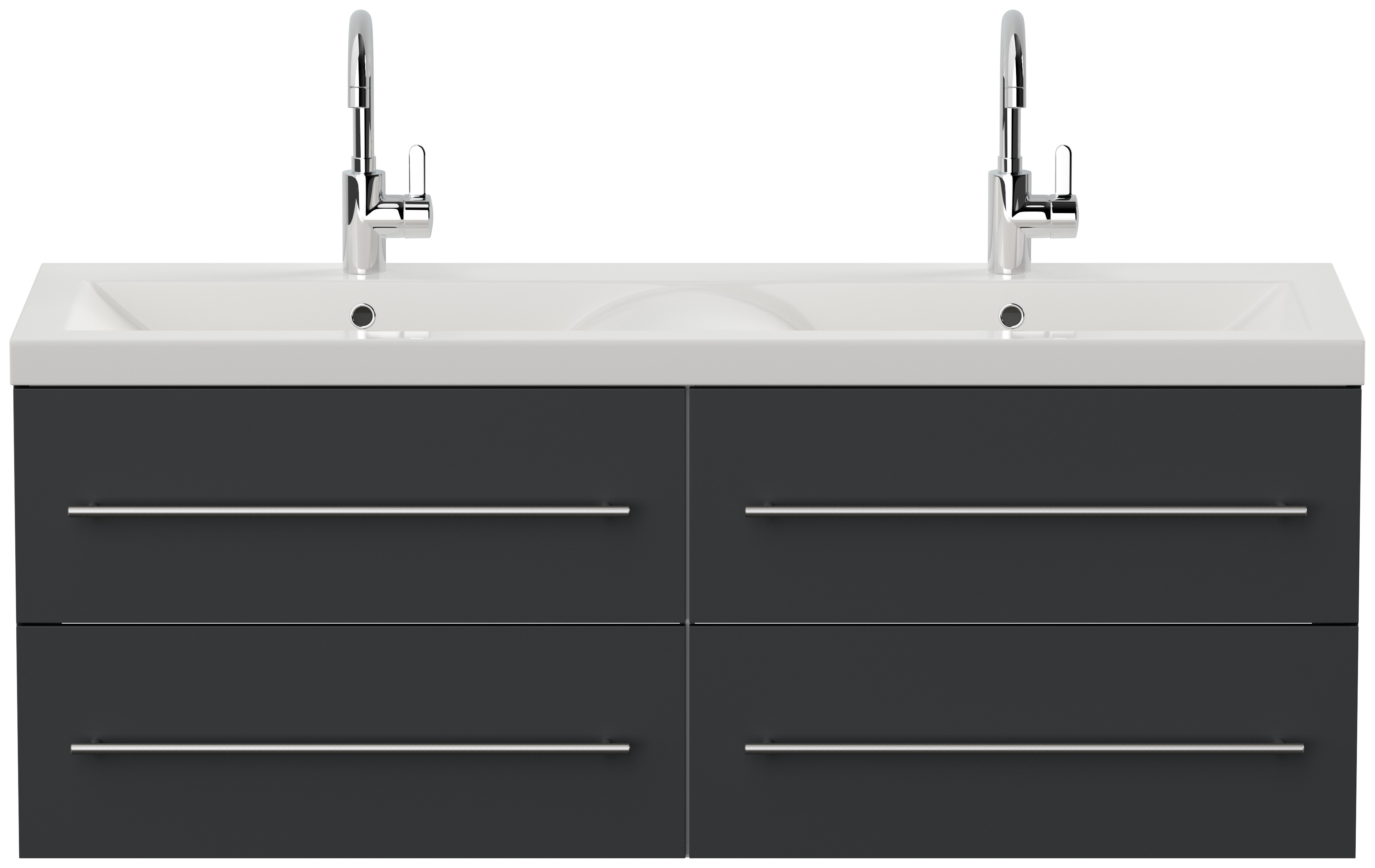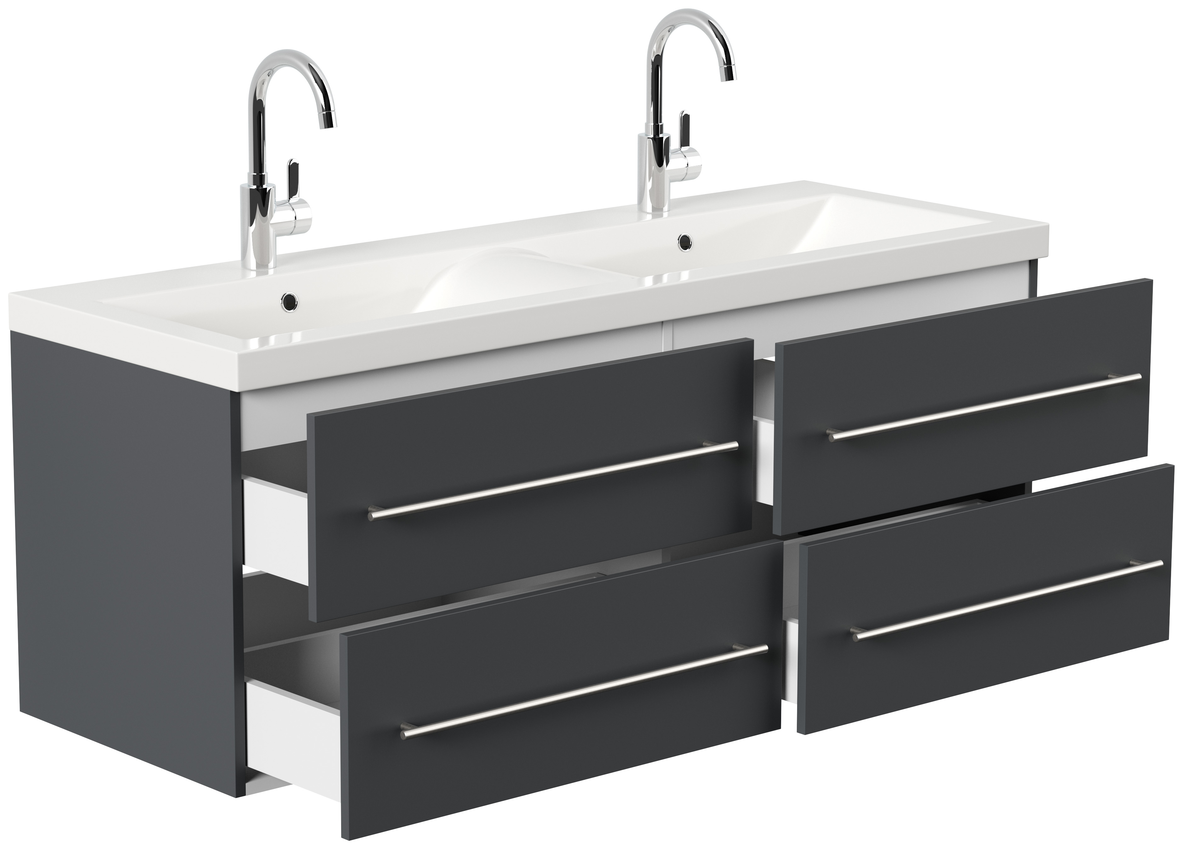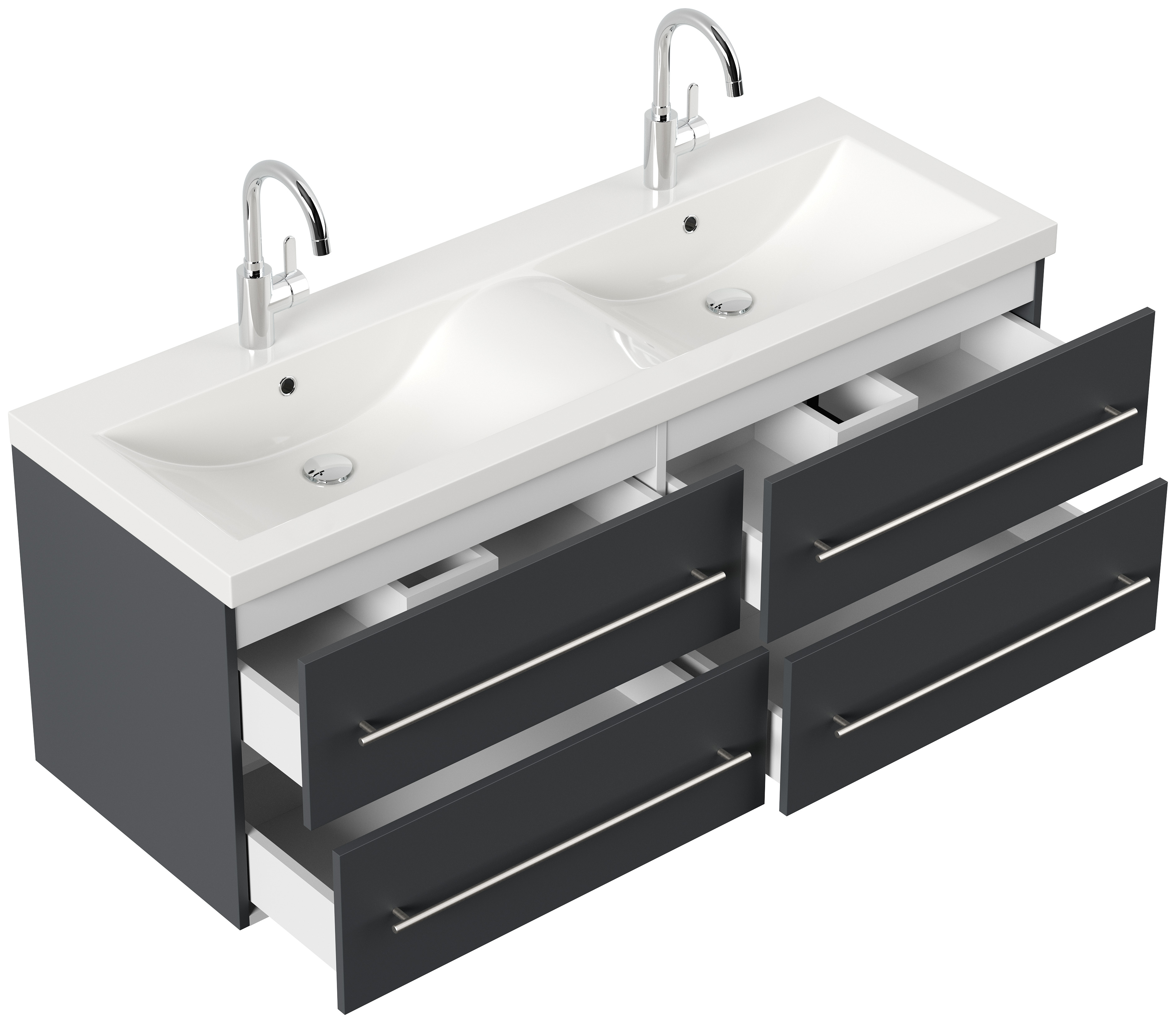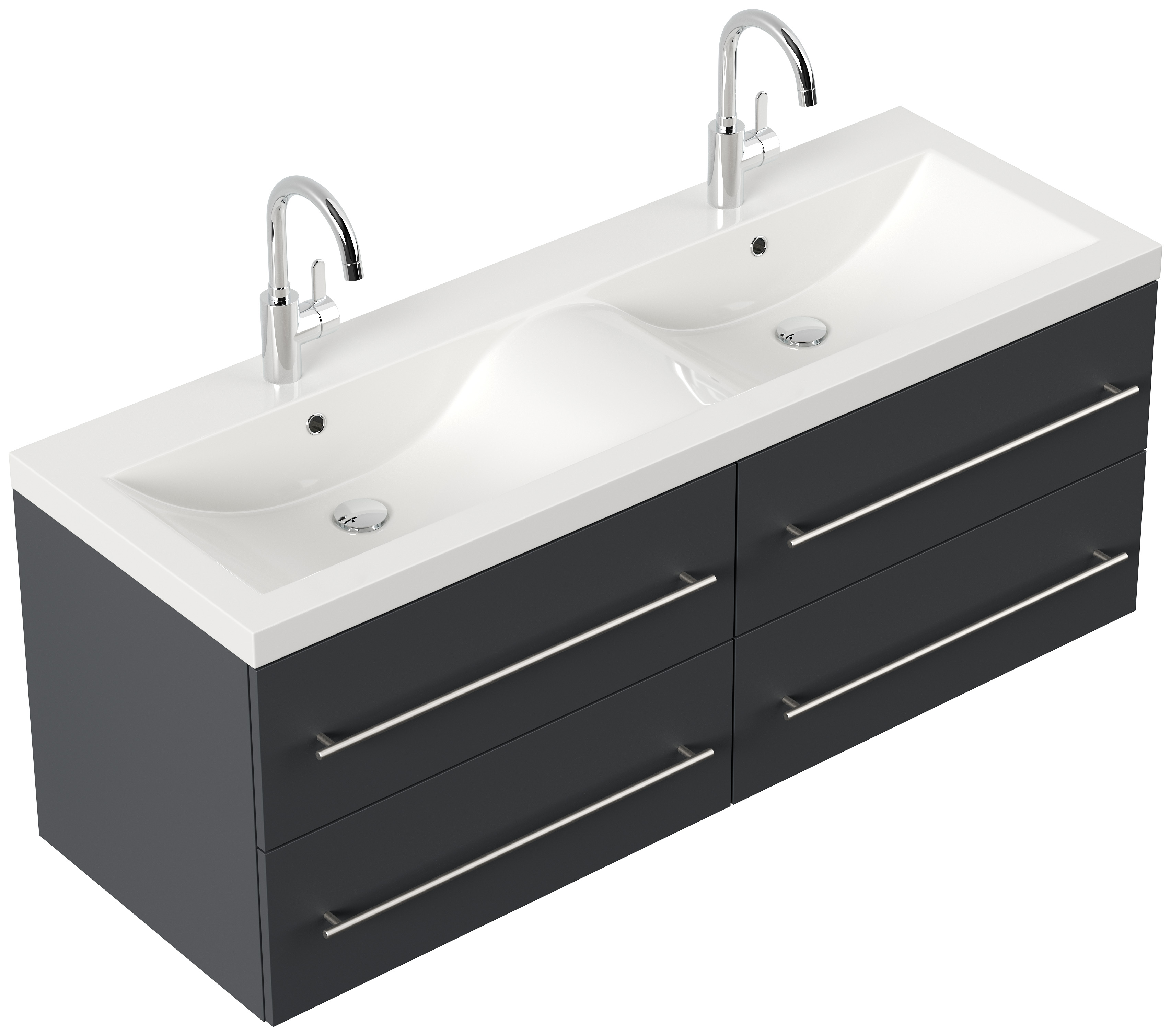 Badmöbel inkl. Waschbecken (B/H/T) 143,2/56,6/50,5 cmWaschtischunterschrank ohne Becken mit 4 Softclose Schubladen (B/H/T) 143/51,6/50,2cm Mineralguss Waschbecken in geschwungenem Design (B/H/T) 143,2/5/50,5cmMontage-Empfehlung: