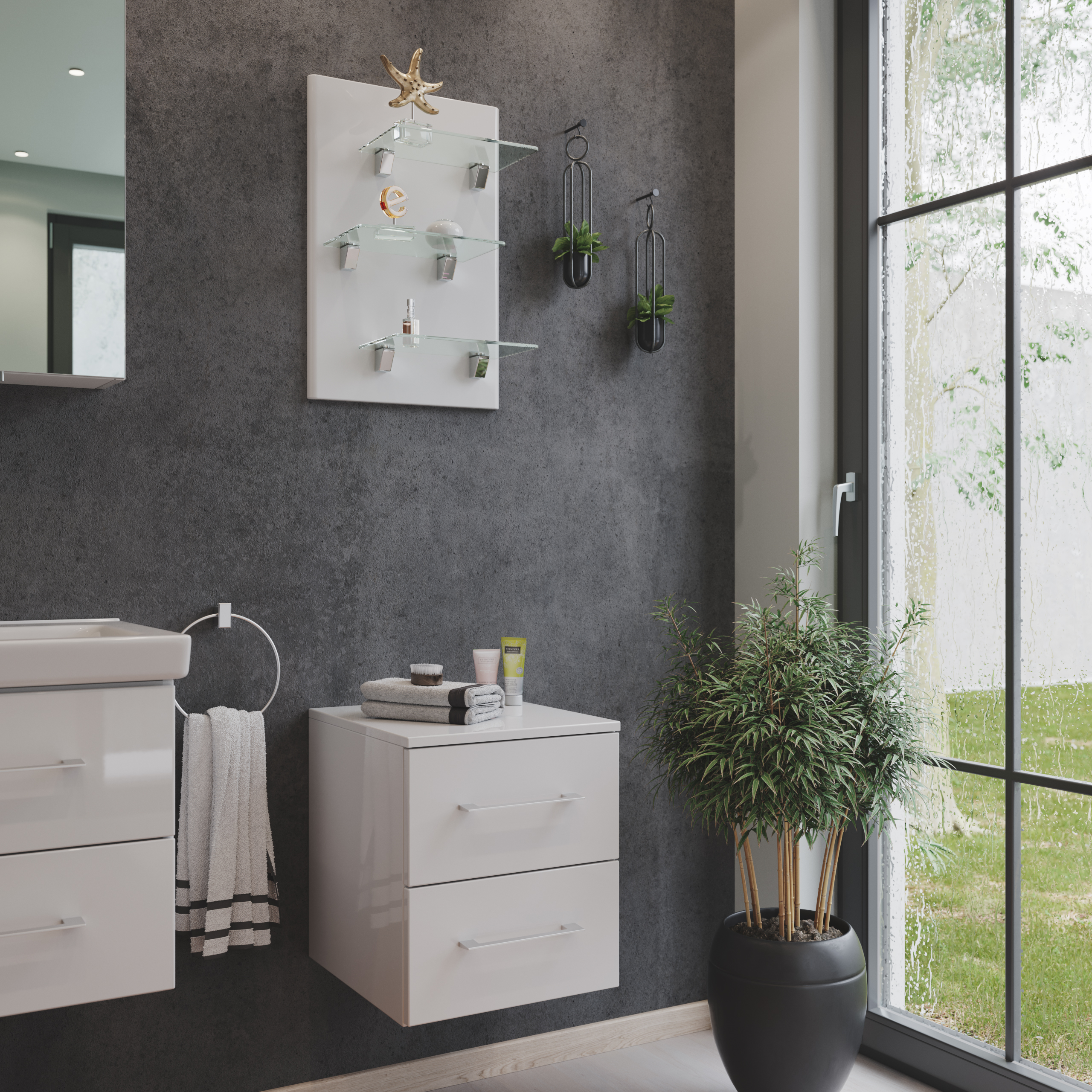 Badmöbel Qualitätsprodukt direkt ab Werk - Designed in Germany: Wir bieten ein sehr gutes Preis-Leistungsniveau, denn Sie kaufen direkt ab Werk. Wir lassen für Sie die Badmöbel nur von ausgewählten Partnern fertigen. Wir sind stolz, ausschließlich langlebige Öberflächenmaterialien zu nutzen, sowie robuste Auszüge und Beschläge Wir achten auf optimierte Versandverpackungen, damit Ihre Ware Sie heile erreicht. Montage-Empfehlung: Die Ware wird zerlegt geliefert. Eine Aufbauanleitung liegt der Ware bei. Der Badunterschrank ist für die Wandmontage vorgesehen. Etwaiges Wandmontagematerial für die Aufhängung ist in der Lieferung nicht enthalten. Bitte verwenden Sie Schrauben und Dübel, die zu den Bedingungen bei Ihnen vor Ort passen. Das Waschbecken müssen Sie nicht extra an der Wand befestigen, sondern es wird auf den Unterschrank aufgesetzt. Die Montage wird mit einem Silikonstreifen zwischen Badmöbel und Waschbecken sowie Badezimmerwand optimiert. Der Anschluss für Ab- und Zulauf erfolgt wie üblich. Wir empfehlen, den Wasseranschluss von einer Fachfirma durchführen zu lassen. Hochwertig das eigene Badezimmer aufpimpen!Mit dieser schicken Kombination in der Farbe Weiß hochglanz pimpen Sie auf clevere Weise Ihr Badezimmer auf: Das Regalpanel und der Seitenschrank bieten nicht nur mehr Ablageflächen, sondern auch Staurum. Materialien Qualitätsmöbel direkt ab Werk - Designed in Germany Sie können auf unsere jahrelange Erfahrung in Zusammenarbeit mit ausgewählten Möbelhersteller vertrauen. Hochwertige Qualität, die Sie spüren können: Ein herausragendes Qualitätsmerkmal unserer Badmöbel sind die hervorragend verarbeiteten Oberflächen. Die Beschichtung ist - sowohl über die Frontseite, als auch über die sichtbaren Seitenteile - über die Kanten und Ecken tiefgezogen und weich abgerundet. Handgriffe: Die Handgriffe sind aus schwerem, matt gebürsteten Edelstahl gefertigt. Softclose für Schubladen sowie Türen: Für maximalen Komfort statten wir die Schublade/n und Tür/en aus mit hochwertigen Softclose Schienen der Marke DTC. Auf den letzten Zentimetern schließen sie besonders sanft und ziehen sich wie von allein in ihre Grundposition. Die Schubladen verfügen über einen butterweichen Teilauszug, mit dem Sie dauerhaft die volle Übersicht behalten. Auch etwaige Türen sind mit dem Softclose-Schließsystem ausgestattet. Maße und Lieferumfang: Regalpanel inkl. 3 Glasablagen (B/H/T) 40/60/20,1 cm, Seitenschrank "Cube" mit Softclose Schubladen (B/H/T) 40/46,6/44,6 cm. Nicht im Lieferumfang enthalten sind beispielsweise Deko, Spiegel, Armatur, Zuleitungen zum Wasserhahn, der Siphon sowie in der Regel ebenfalls nicht der Waschbeckenverschluss Popup. Diese Artikel können gesondert bei uns erworben werden. Downloads zu diesem Artikel: Download Montage-Anleitung Badmöbel