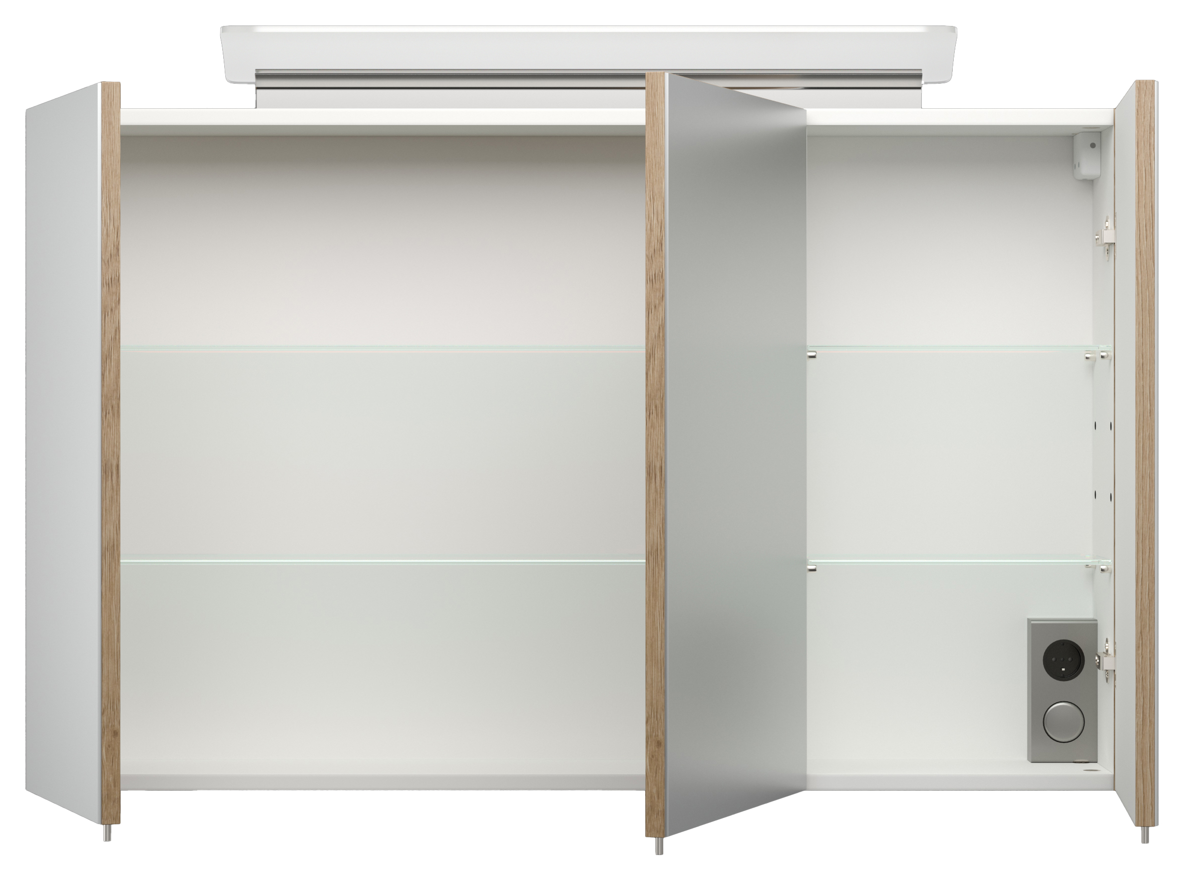 Spiegelschrank 100, inkl. Soft-Close-Türe/n mit Spiegel, 2 Regalböden aus Glas, Kombibox im Spiegelschrank mit Lichtschalter und Steckdose (B/H/T) 100/62/17 cm.