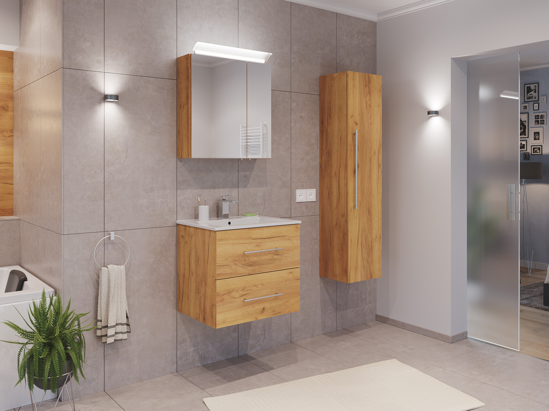 Badmöbel Set Firenze 60 3tlg. Spiegelschrank & Hochschrank eiche gold