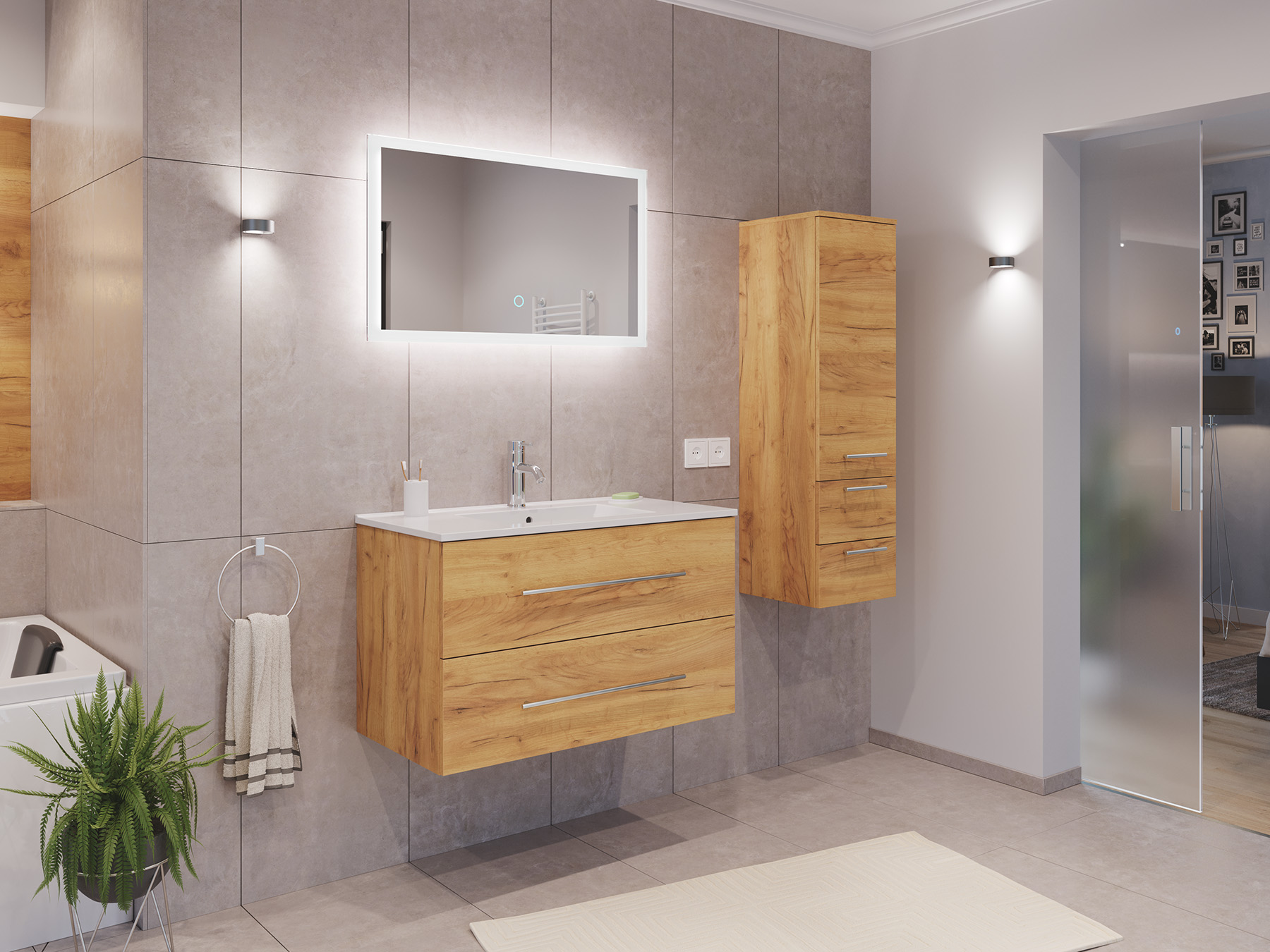 Badmöbel Set Firenze 90 3tlg. LED Spiegel und Seitenschrank eiche gold