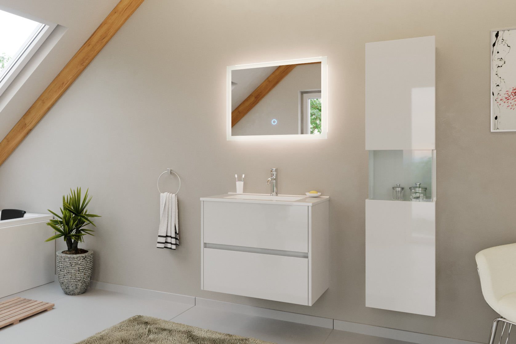 Badmöbel Set Taifun 3tlg. 70cm mit LED Spiegel & Hochschrank weiß Hgl