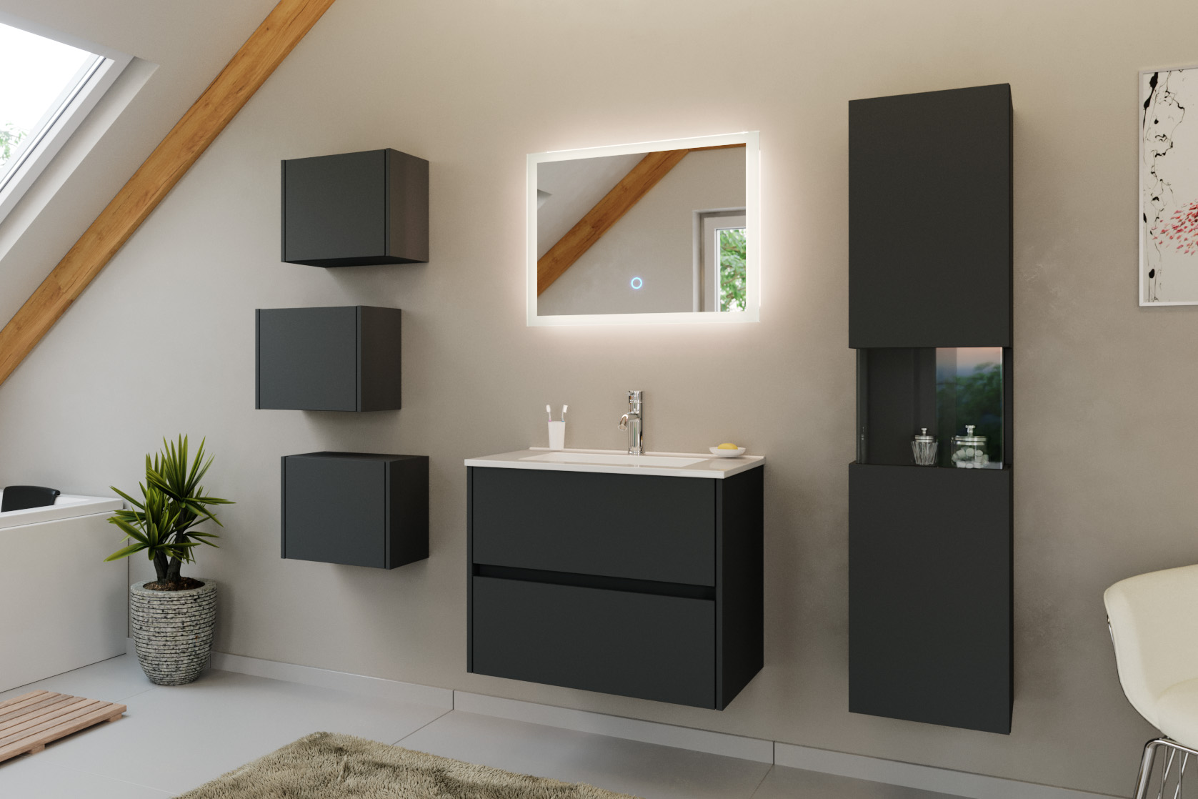 Badmöbel Set Taifun 4tlg. 70cm mit LED Spiegel 3er Boxen & Hochschrank Grafit