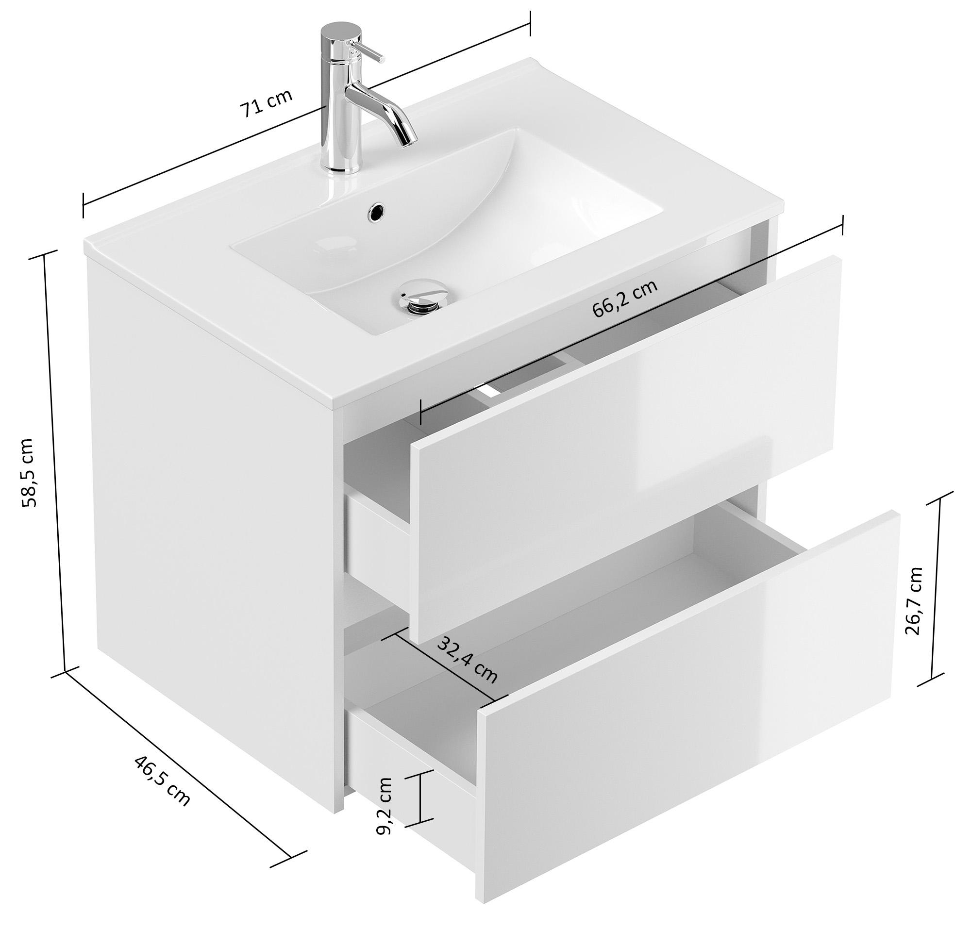 Badmöbel-Unterschrank Taifum mit 2 Softclose Schubladen und Waschbecken Keramik mit Überlauf. Maße Unterschrank mit Waschbecken (B/H/T) 71/58,7/46,5 cmUnterschrank (B/H/T) 70/56,9/46 cm