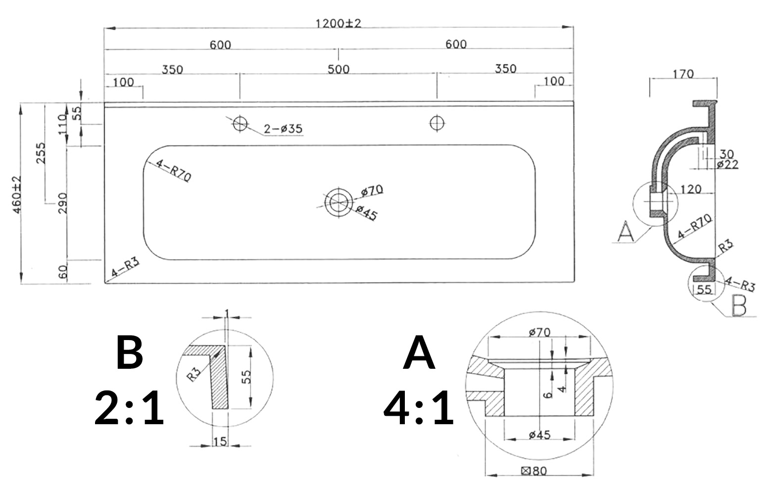 Waschbecken: (B/H/T) 120/5,5/46 cm.