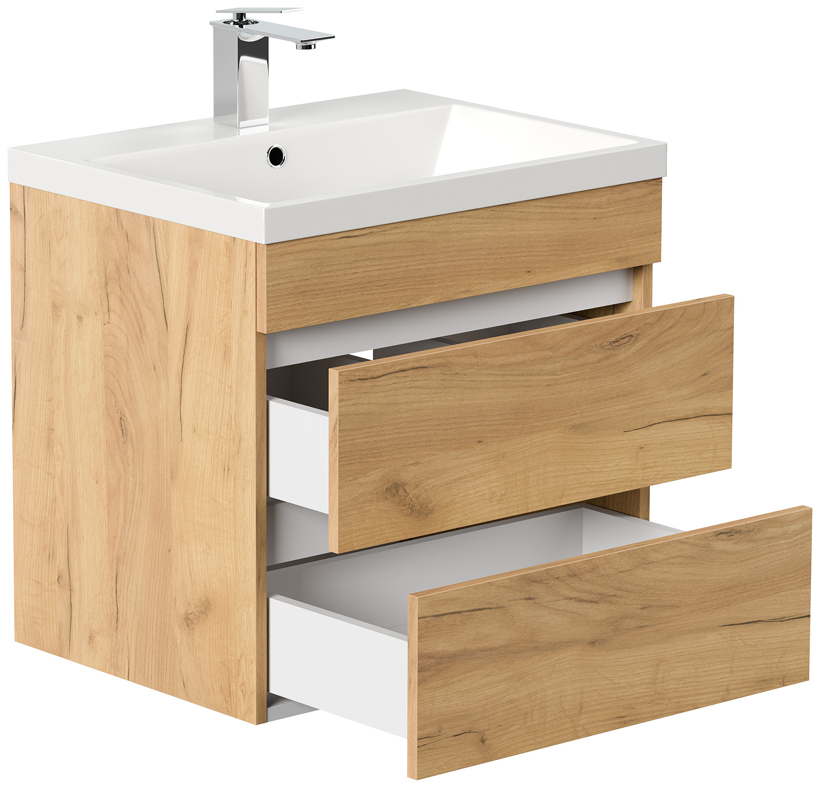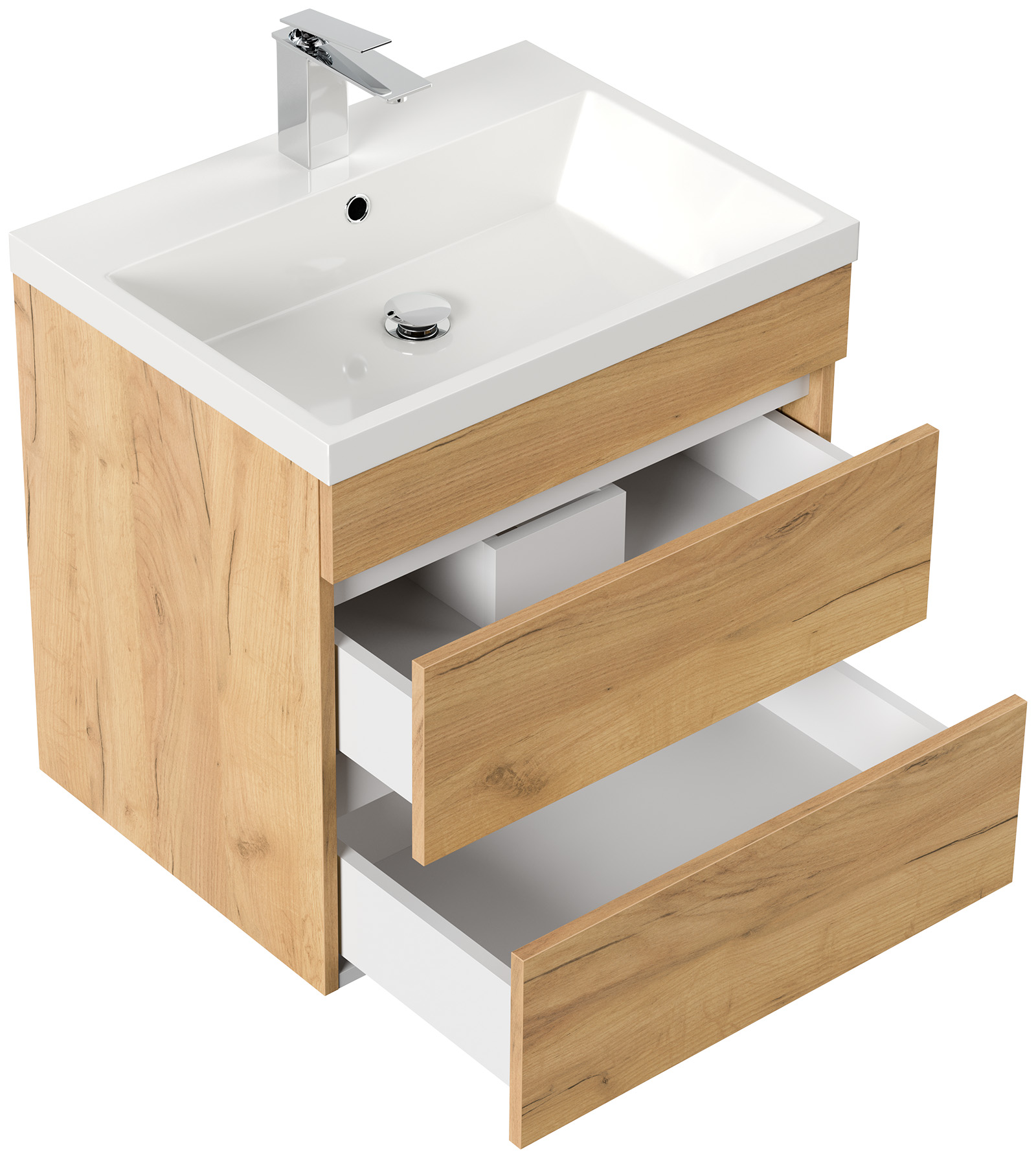 Unterschrank mit zwei grifflosen Schubladen mit Soft-Close (B/H/T) 59,4 /54,5 / 45,7 cm,Waschbecken Mineralguss: (B/H/T) 60,5/4,5/46,5 cm.