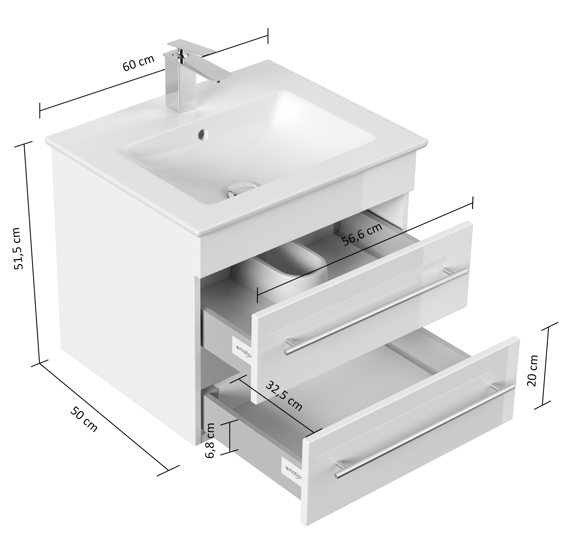 Höhe des Schrankes inkl. Waschbecken: 51,5 cm