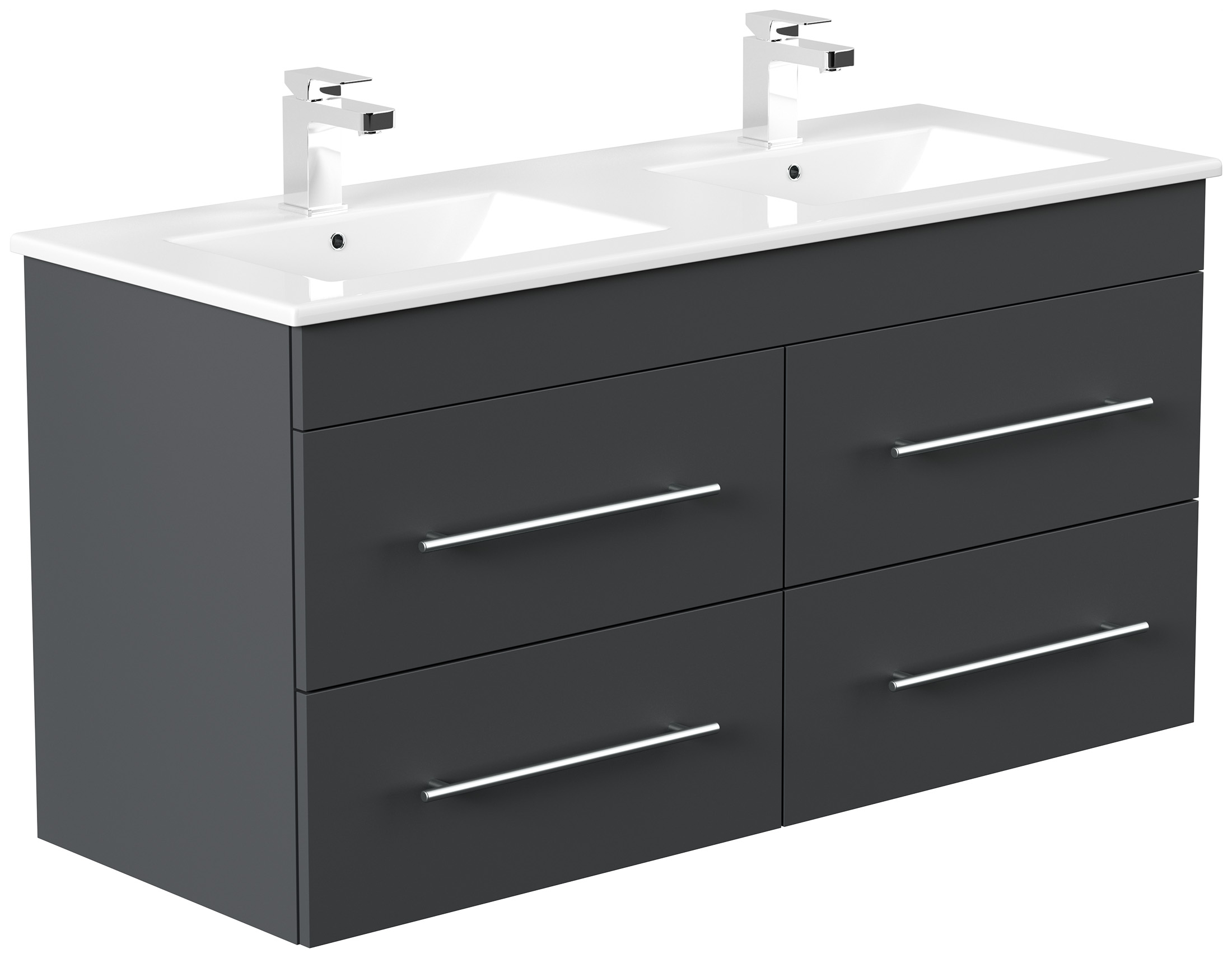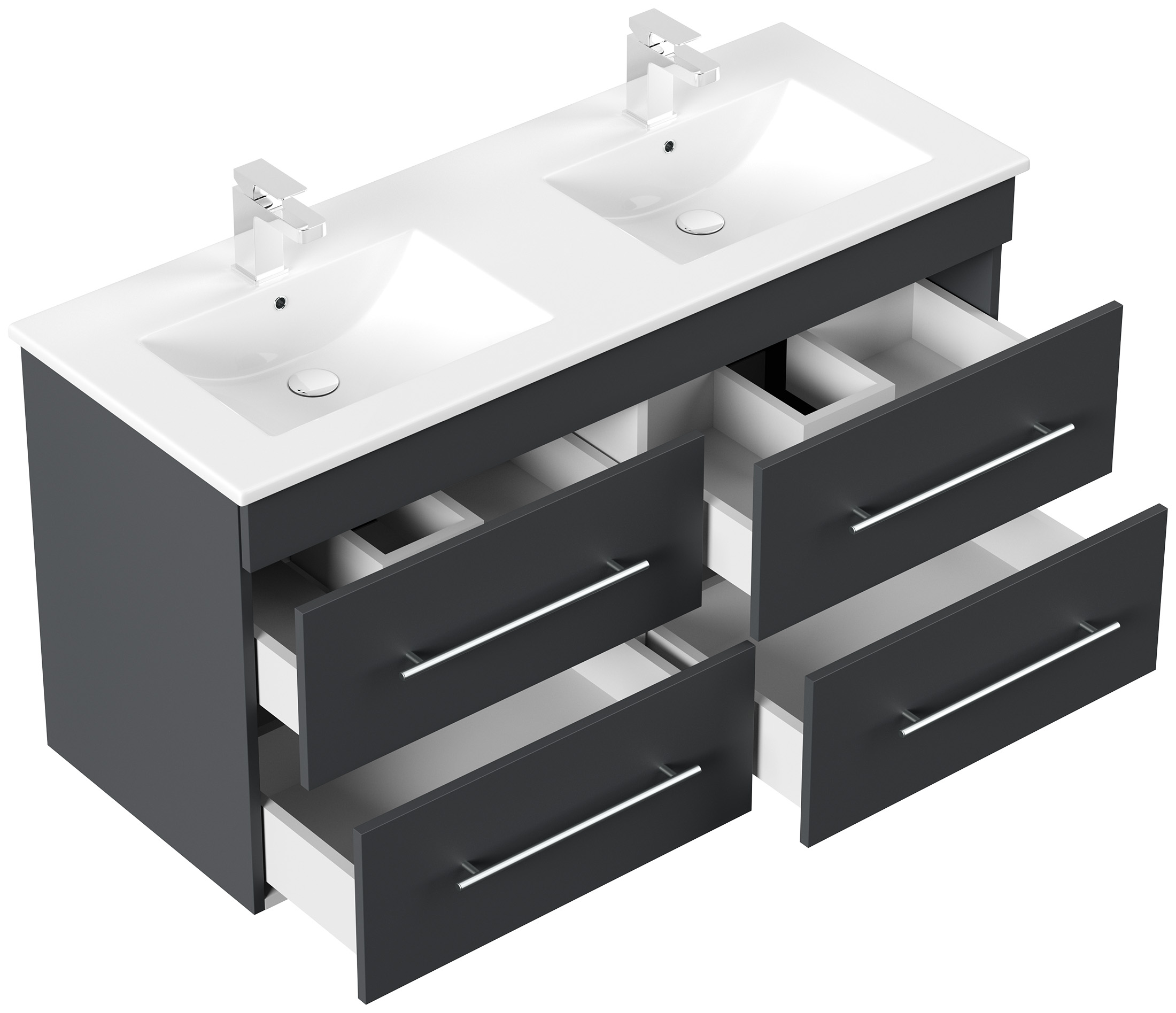 Badmöbel Waschtisch Unterschrank 2 Schubladen mit Softclose, der Abstand zwischen beiden Abflüssen ist 59cm von Mitte zu Mitte (B/H/T) 119/60/45,6 cm.Doppelwaschbecken aus Keramik mit Überlauf (B/H/T) 120/2/46 cm.2x Badhochschrank 150 inkl. Einlegeböden, Softclose-Tür, Anschlag rechts oder links möglich (B/H/T) 35/150/30 cm.