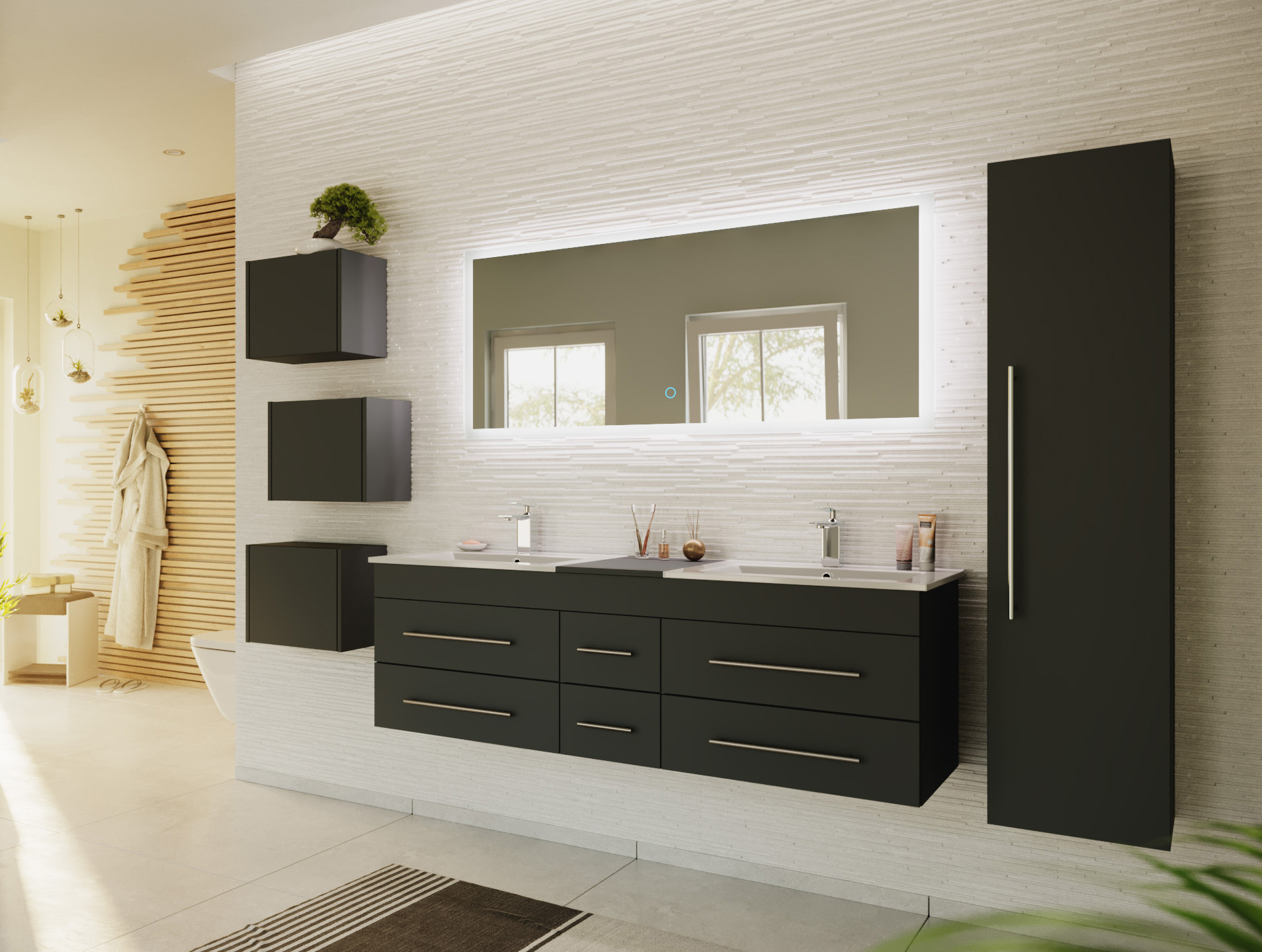 Badmöbelset Roma XL 4-teilig LED-Spiegel Hochschrank 3er Boxen grafit