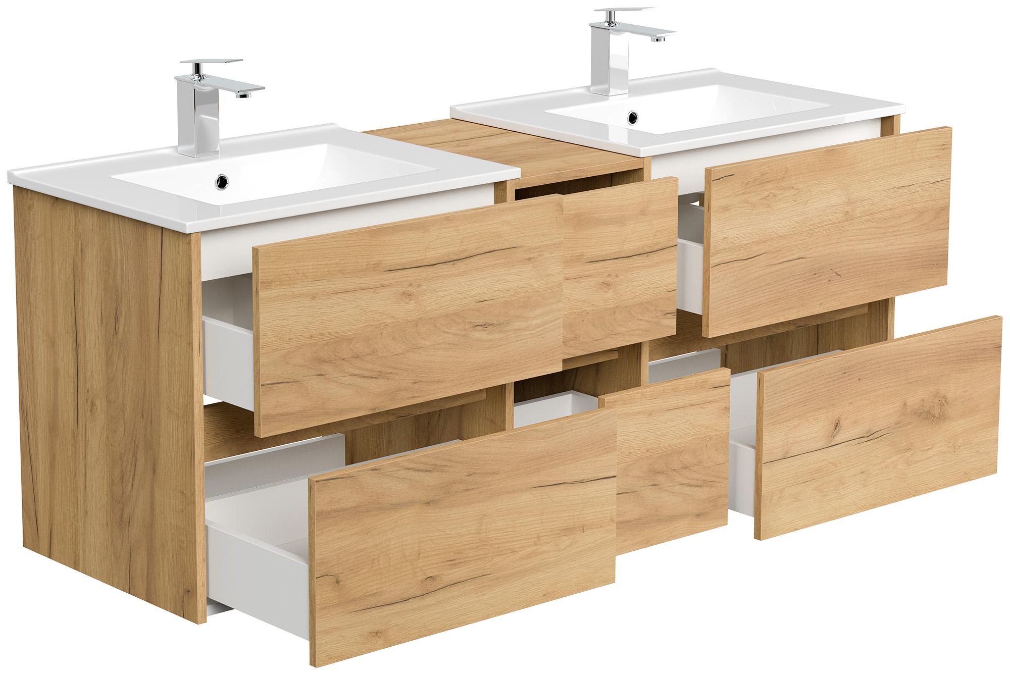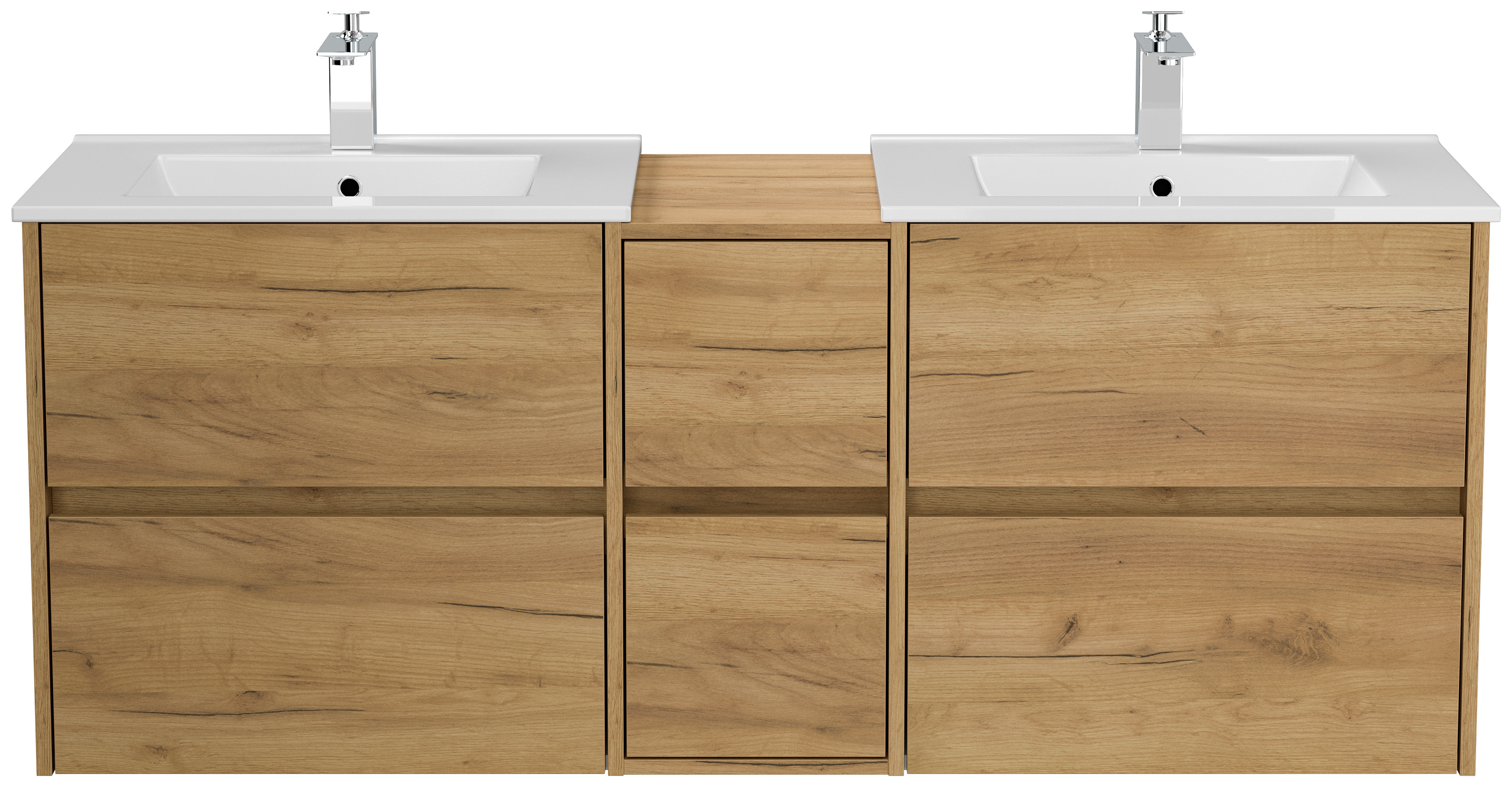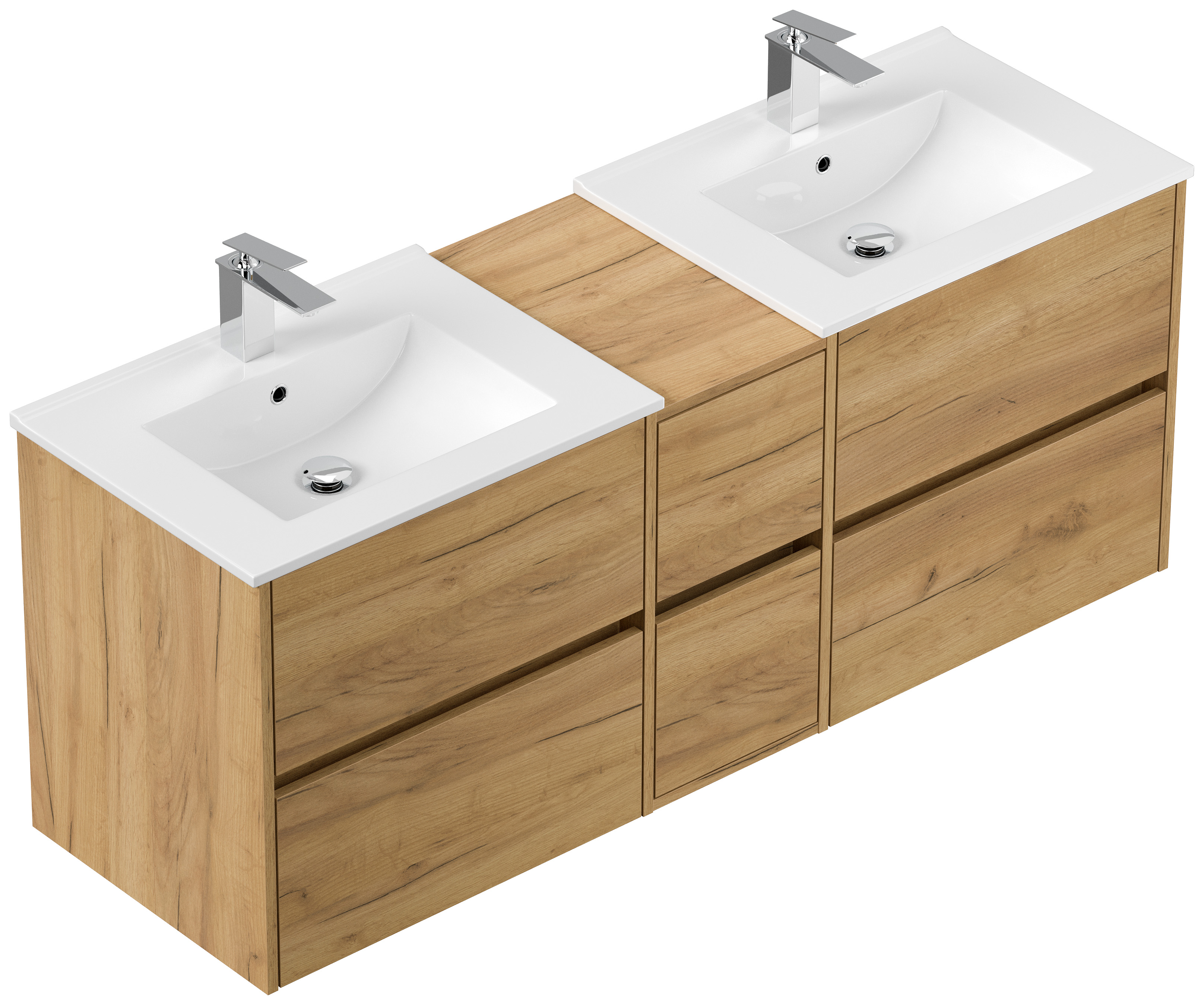 2x Badmöbel-Unterschrank Taifum mit je 2 Softclose Schubladen und Waschbecken Keramik mit Überlauf (B/H/T) 61,5/58,5/46,5 cm werden mit einer 30cm breiten Mittelkonsole zu einem großen Unterschrank kombiniert. Gesamtlänge 151cmUnterschrank (B/H/T) 59,5/56,9/46 cm