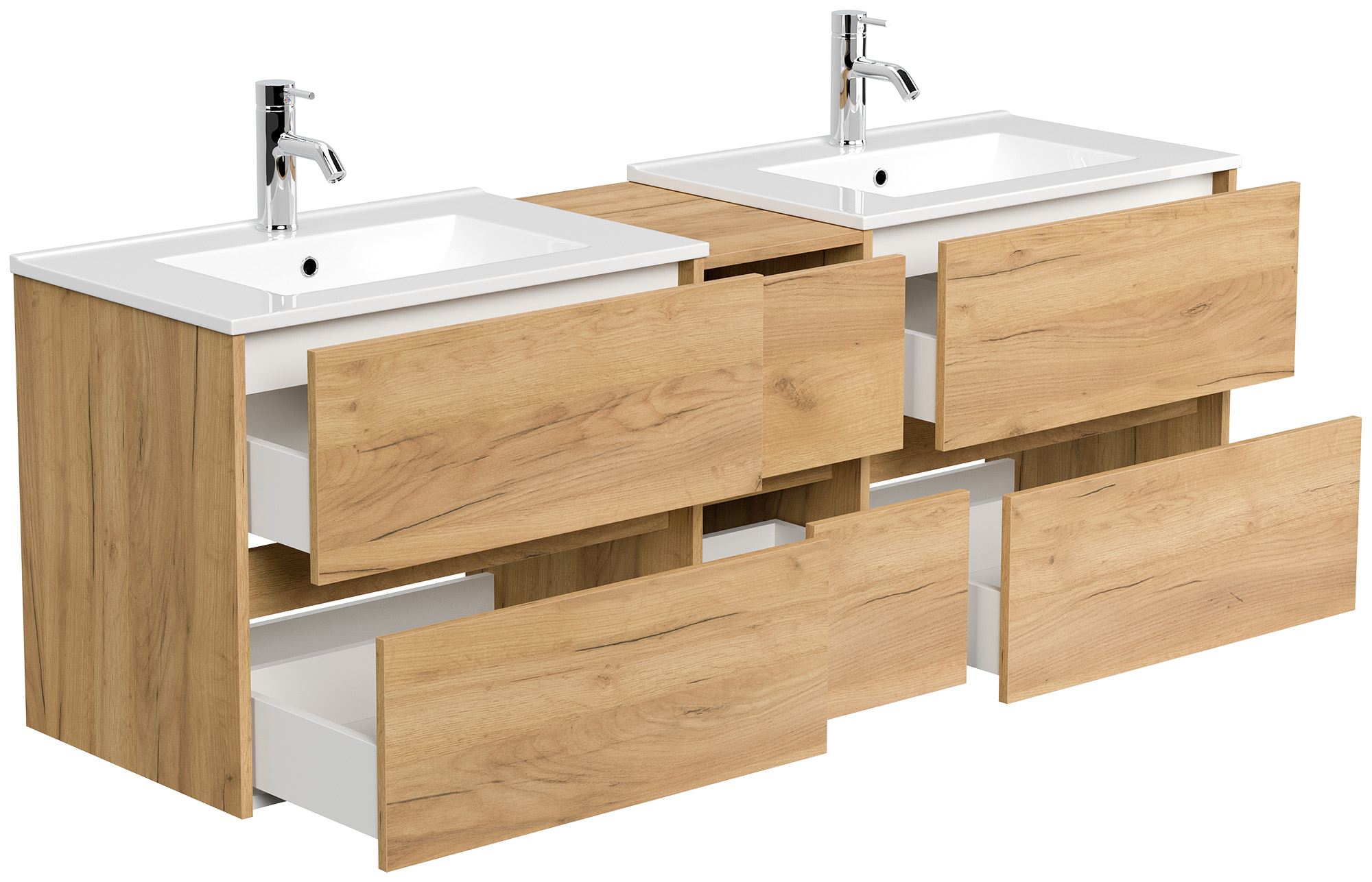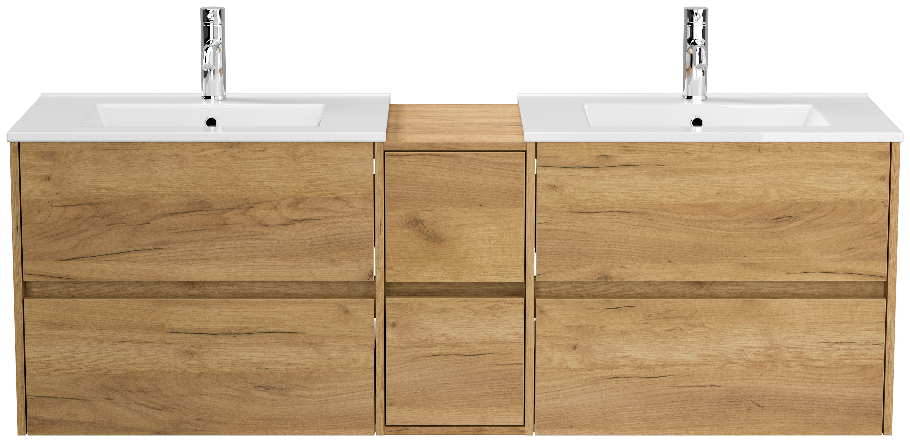 2x Badmöbel-Unterschrank Taifum mit je 2 Softclose Schubladen und Waschbecken Keramik mit Überlauf (B/H/T) 71/60,7/46,5 cm werden mit einer 30cm breiten Mittelkonsole zu einem großen Unterschrank kombiniert. Gesamtlänge 172cmEin Unterschrank (B/H/T) 70/56,9/46 cm