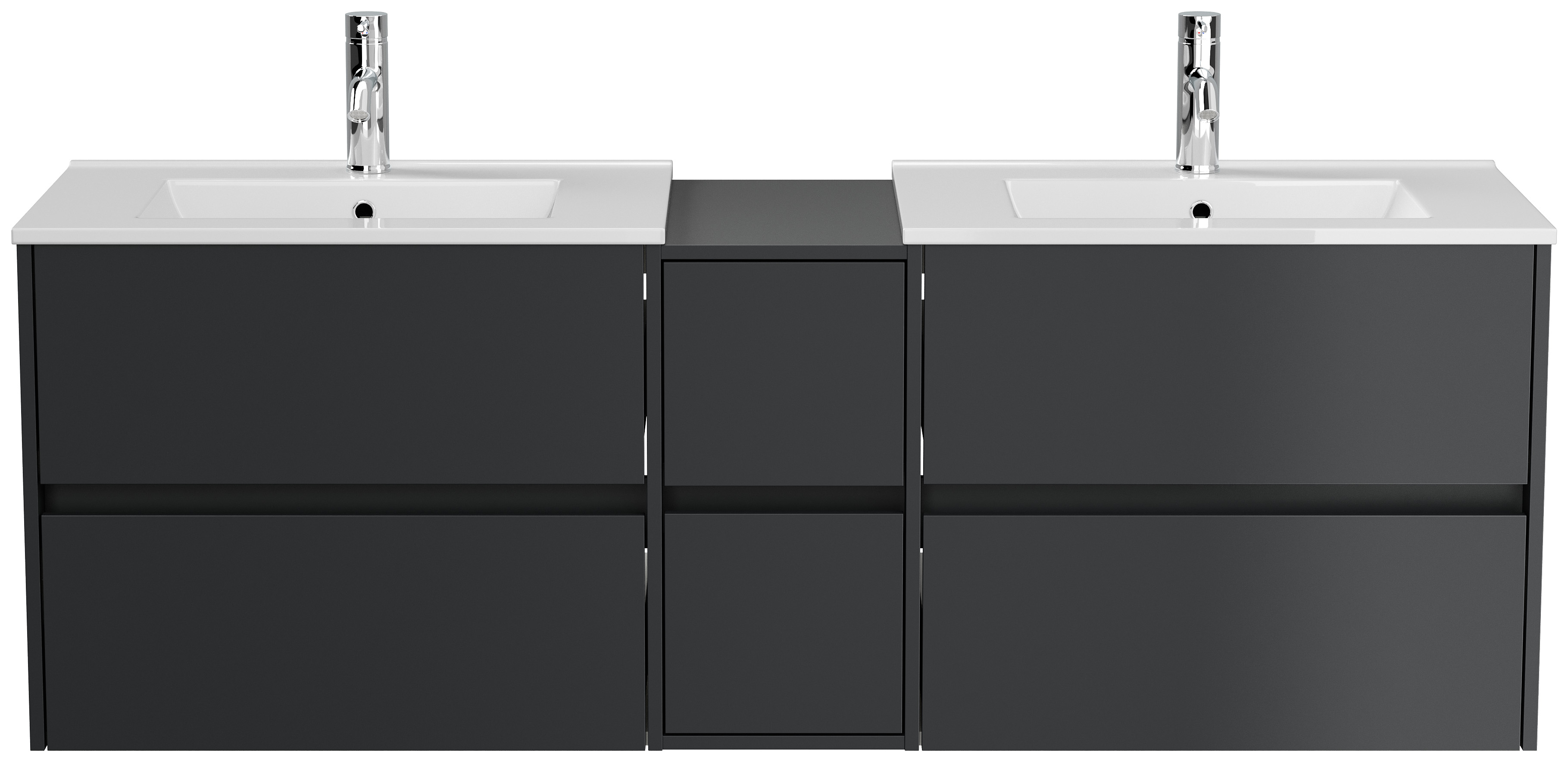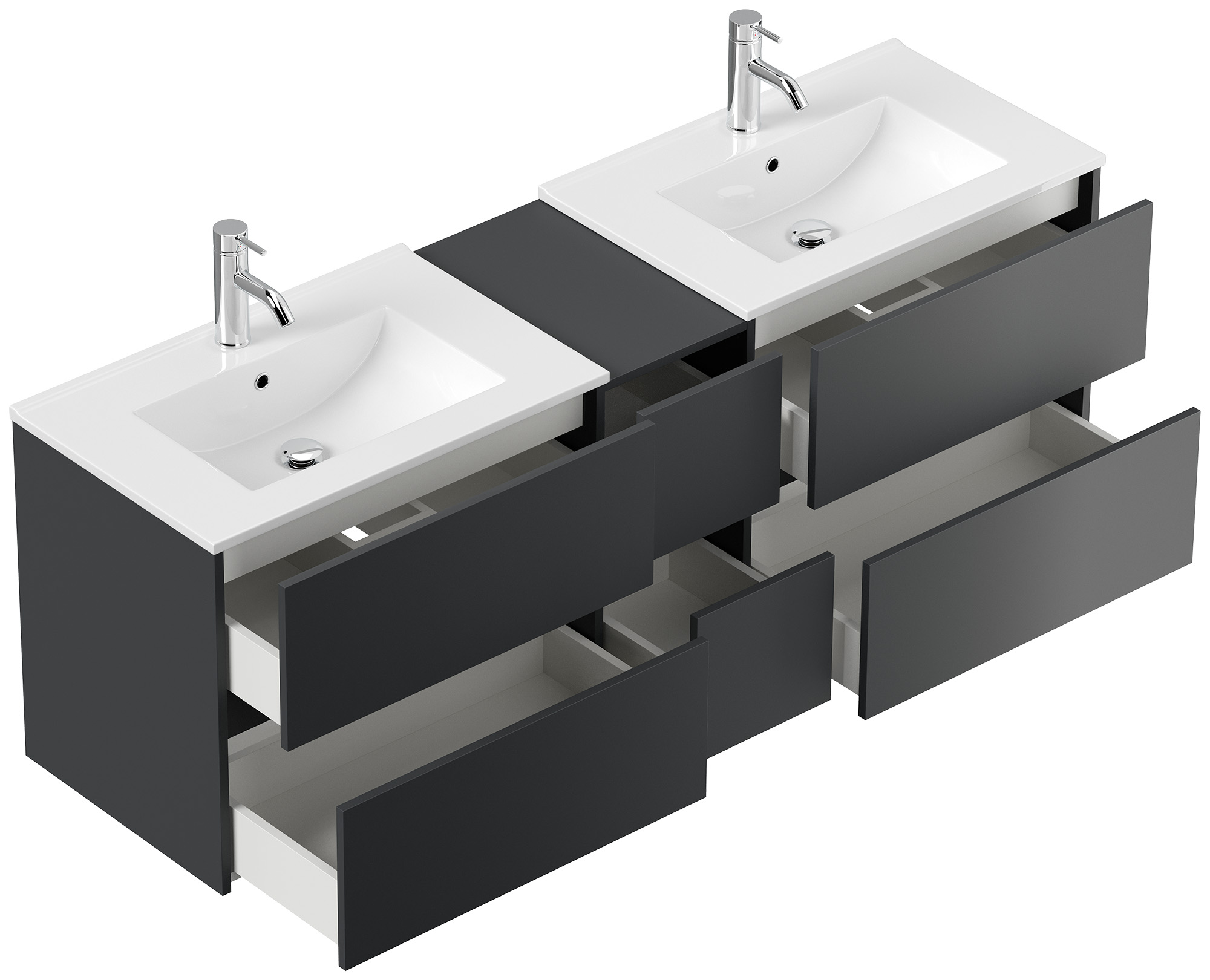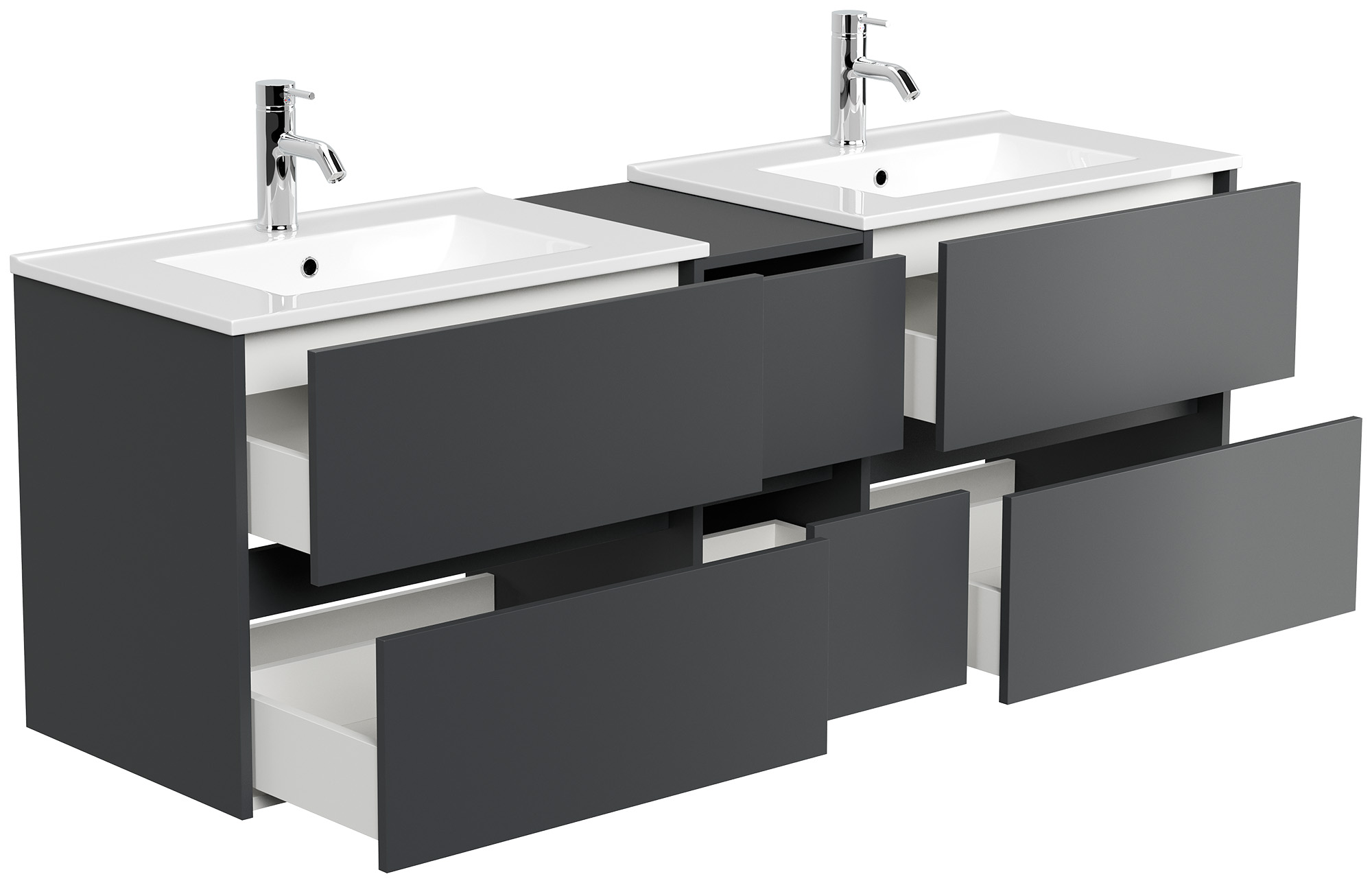 2x Badmöbel-Unterschrank Taifum mit je 2 Softclose Schubladen und Waschbecken Keramik mit Überlauf (B/H/T) 71/60,7/46,5 cm werden mit einer 30cm breiten Mittelkonsole zu einem großen Unterschrank kombiniert. Gesamtlänge 172cmEin Unterschrank (B/H/T) 70/56,9/46 cm