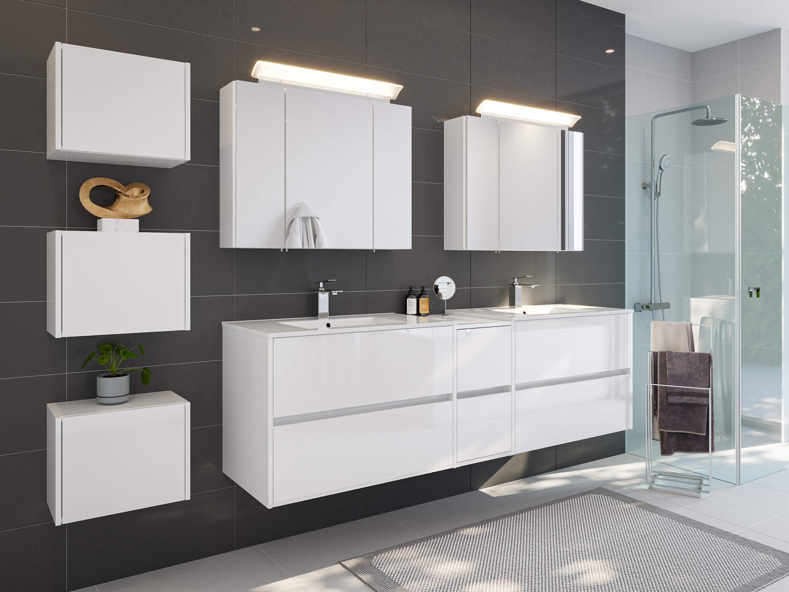 Badmöbelset Taifun 190cm 4tlg mit 2x Spiegelschrank & 3er Boxen Set weiß Hgl