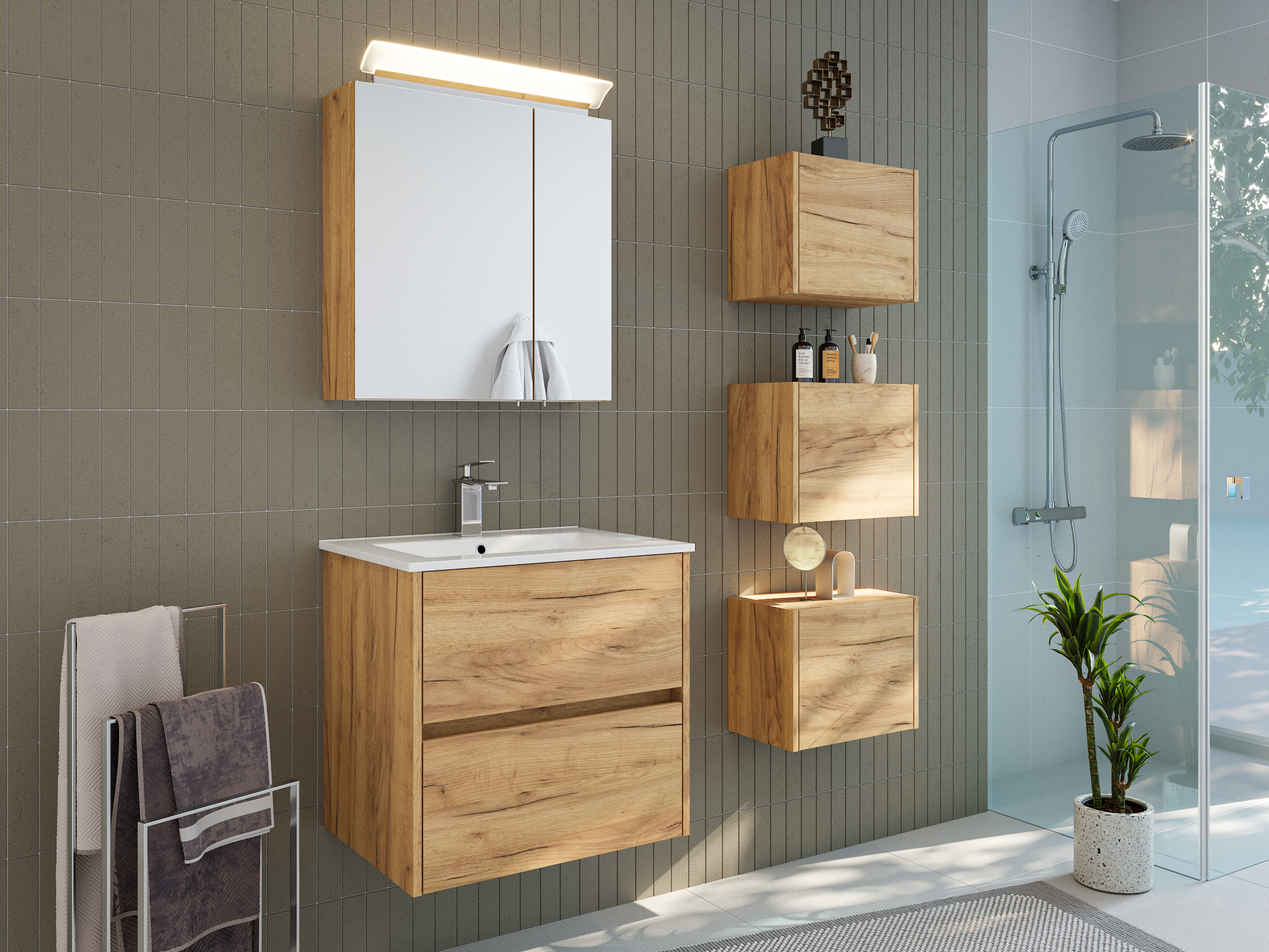 Badmöbelset Taifun 60cm 3tlg mit Spiegelschrank & 3er Boxen Set eiche gold