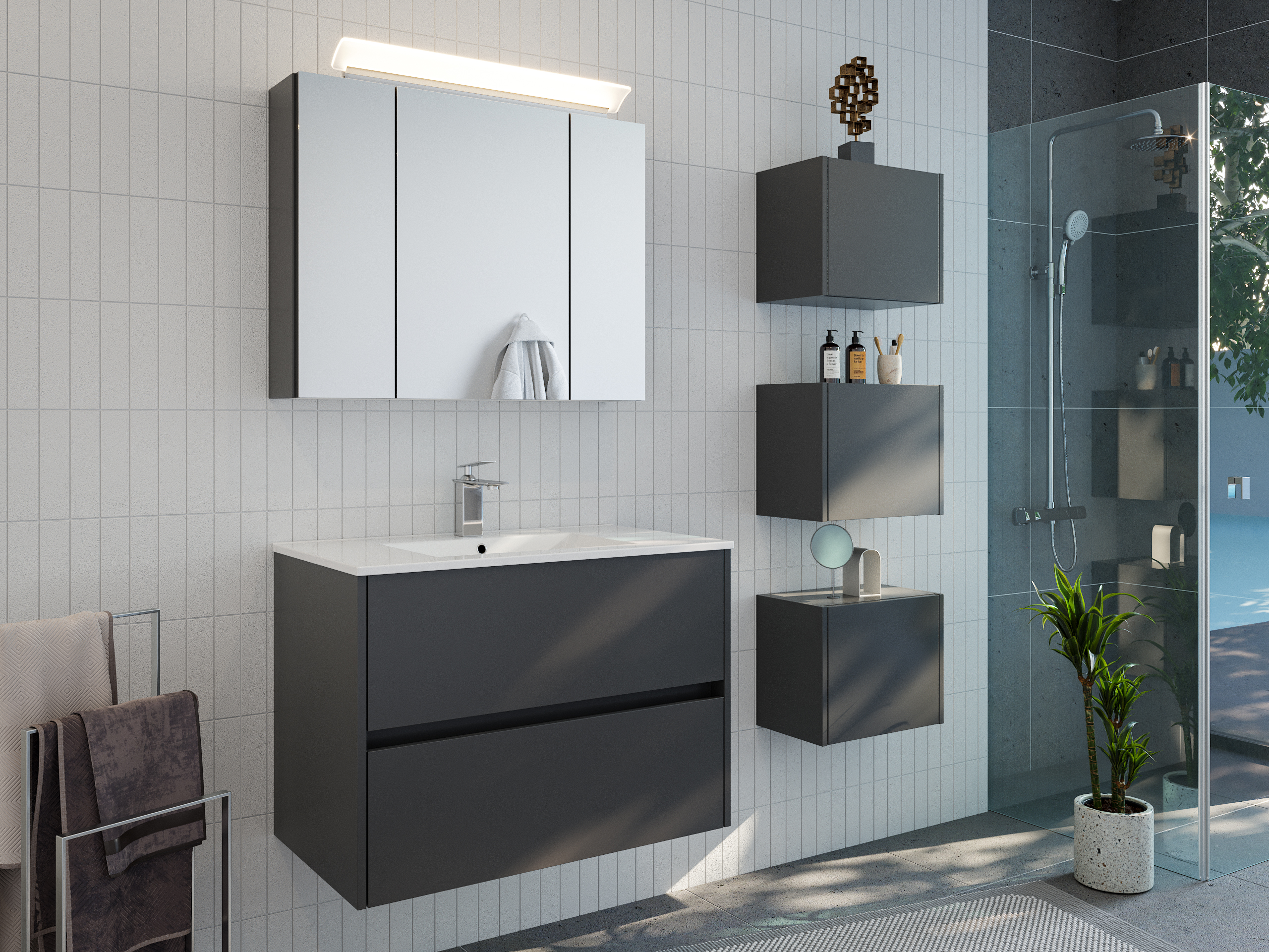 Badmöbelset Taifun 80cm 3tlg mit Spiegelschrank & 3er Boxen Set grafit