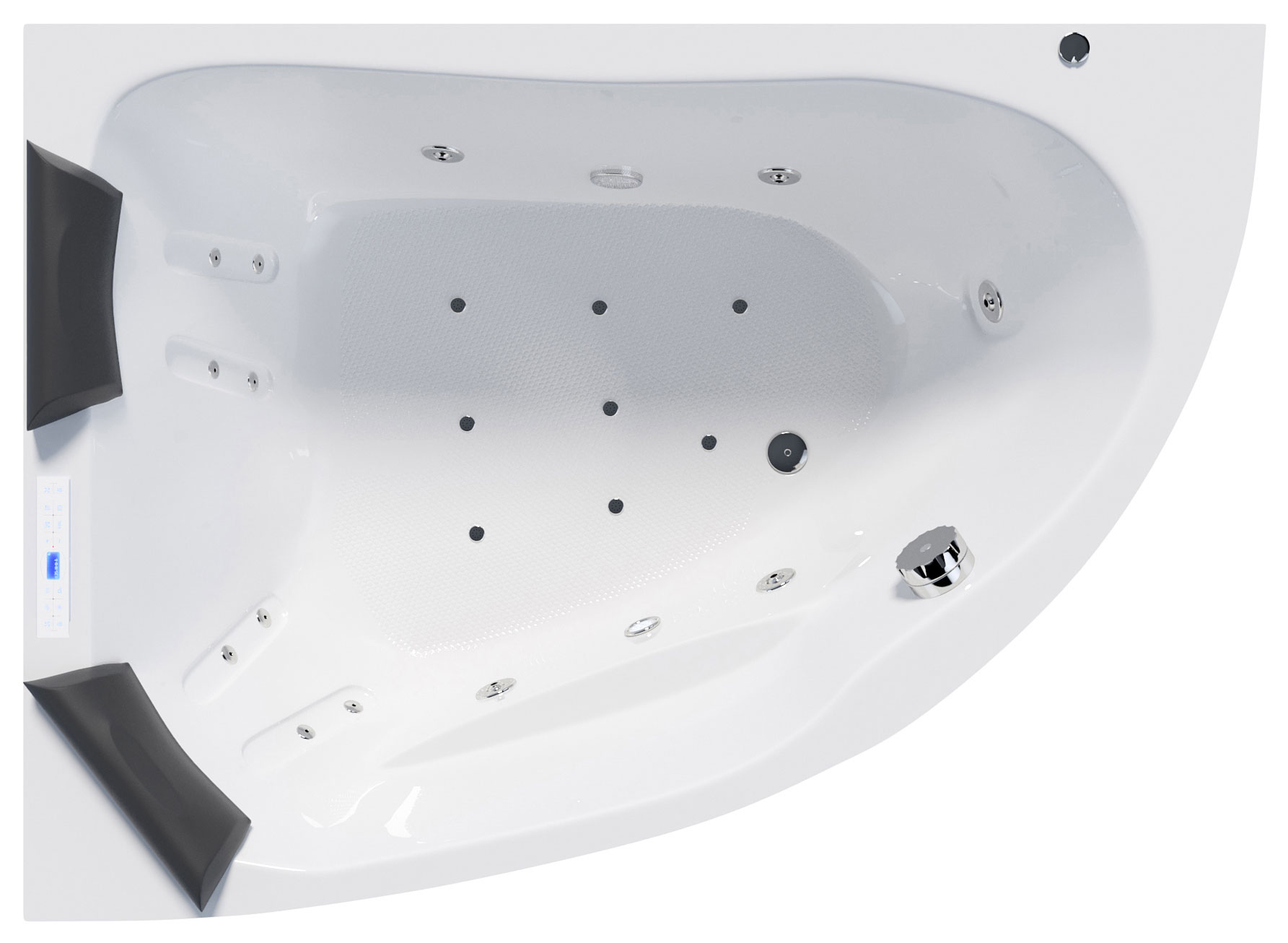 Der Royal XL 1800 mit Ein- bzw. Ausstieg links ist ein Whirlpool, der entspannende Stunden bietet. Die Wanne ist so geformt, dass zwei Personen bequem nebeneinander liegen können. Hinzu kommt, dass der Royal XL 1800 über viele Funktionen verfügt, die königliches Wohlbefinden fördern. Dazu gehören natürlich unterschiedliche Massagefunktionen. Mehrere Massagedüsen sorgen für ein Gefühl, als würden Sie nicht im Wasser liegen, sondern darin schweben. Die Massagedüsen stimulieren mit sanftem Wasserdruck die Hautoberfläche und regen dadurch die Durchblutung an. Durch den sanften Druck kann auch Wasser besser in tiefere Hautschichten eindringen, wodurch diese besser mit Feuchtigkeit versorgt werden, was sich positiv auf das Hautbild auswirken kann. Der Royal XL 1800 Whirlpool mit der Befüllung über den Überlauf hilft, gezielt zu entspannen, und unterstützt Sie dabei, Verspannungen in der Muskulatur zu lösen und den Stoffwechsel zu fördern.