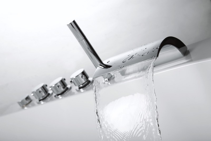 Zur kompletten Standard-Ausstattung gehören die 3er-Armatur (verchromte Messingarmatur mit Kunststoff-Kartusche), die Standard-Handbrause sowie der Wasserfall.
