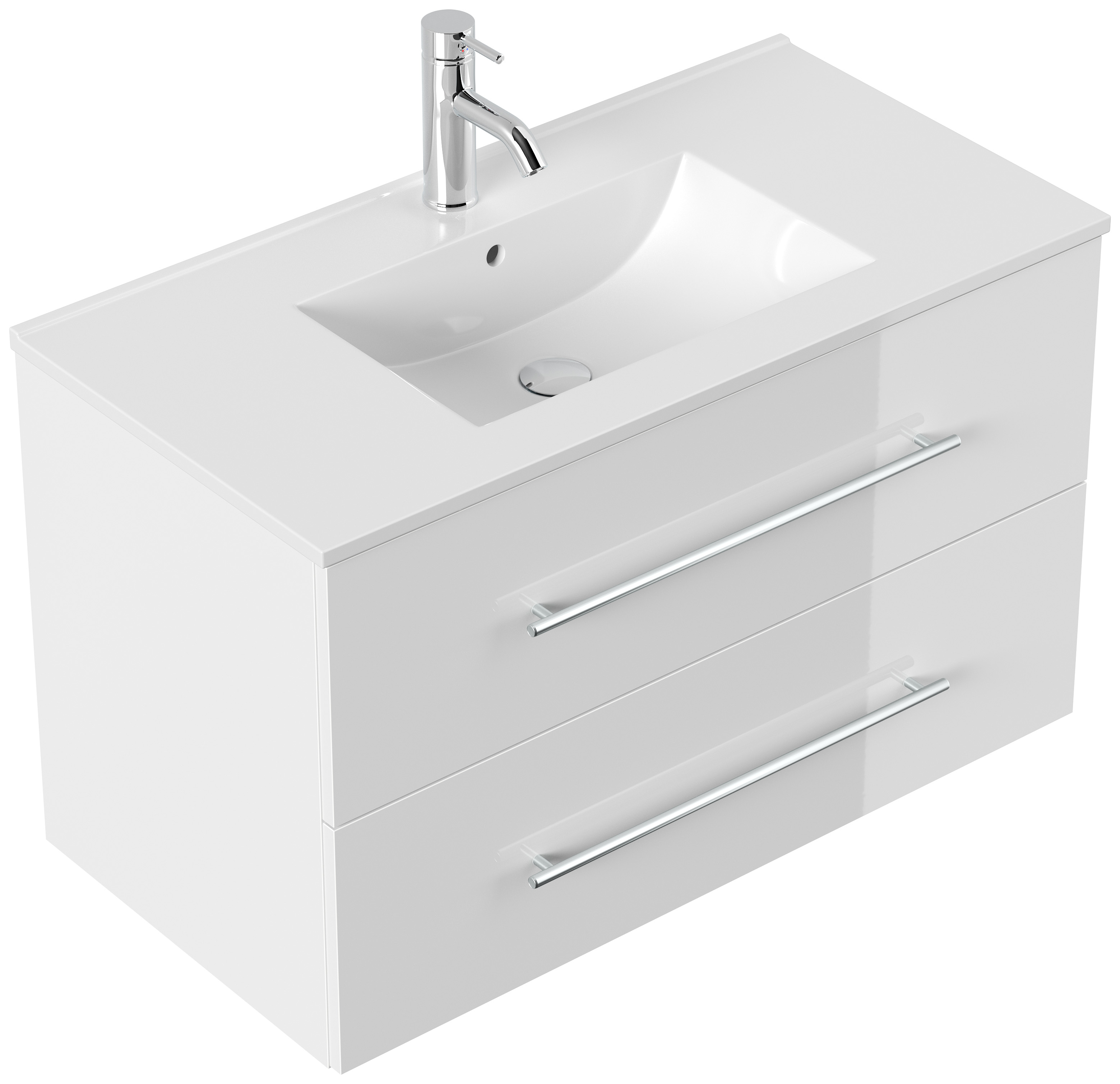 Stand Badmöbel Via 90 SoftClose weiss hochglanz mit drei grifflosen Schubladen