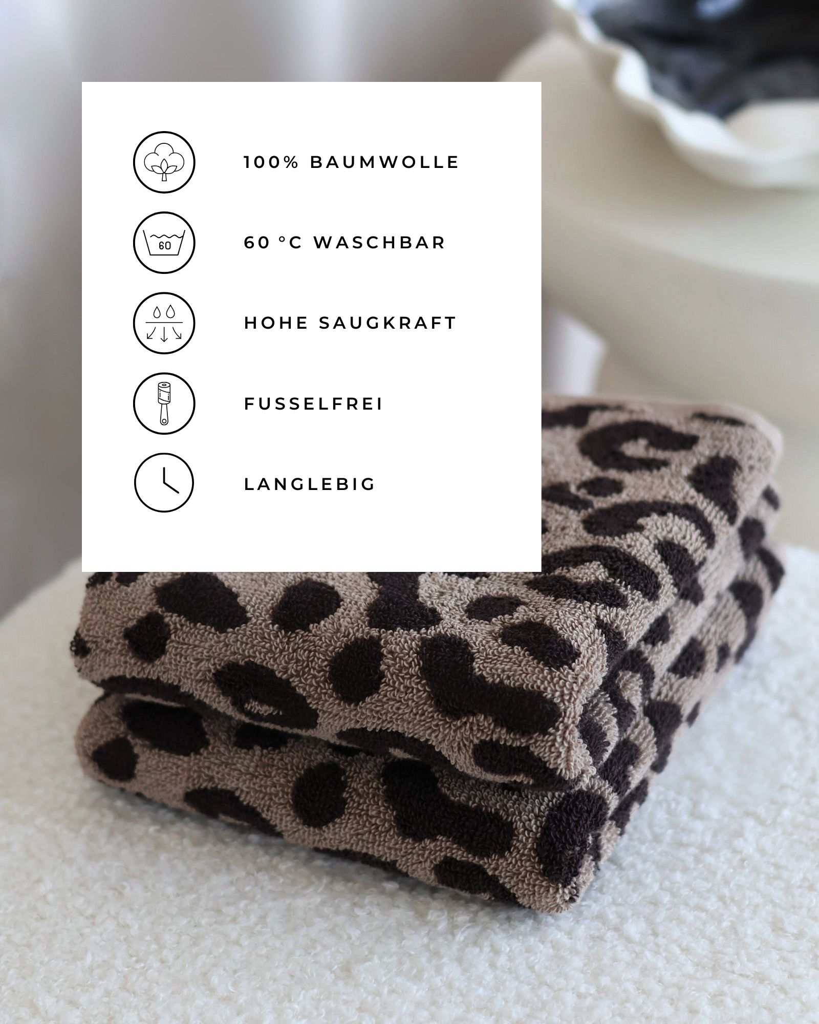 Die Gästehandtücher LEO setzen mit ihrem markanten Leoparden-Jacquard-Muster einen besonderen Akzent in Deinem Gästebad. Ganz gleich, ob Du einen modernen, verspielten oder eher zurückhaltenden Look bevorzugst – diese Handtücher lassen sich vielseitig kombinieren und verleihen Deinem Bad das gewisse Etwas. Ein Hauch von Wildnis für dein Zuhause!