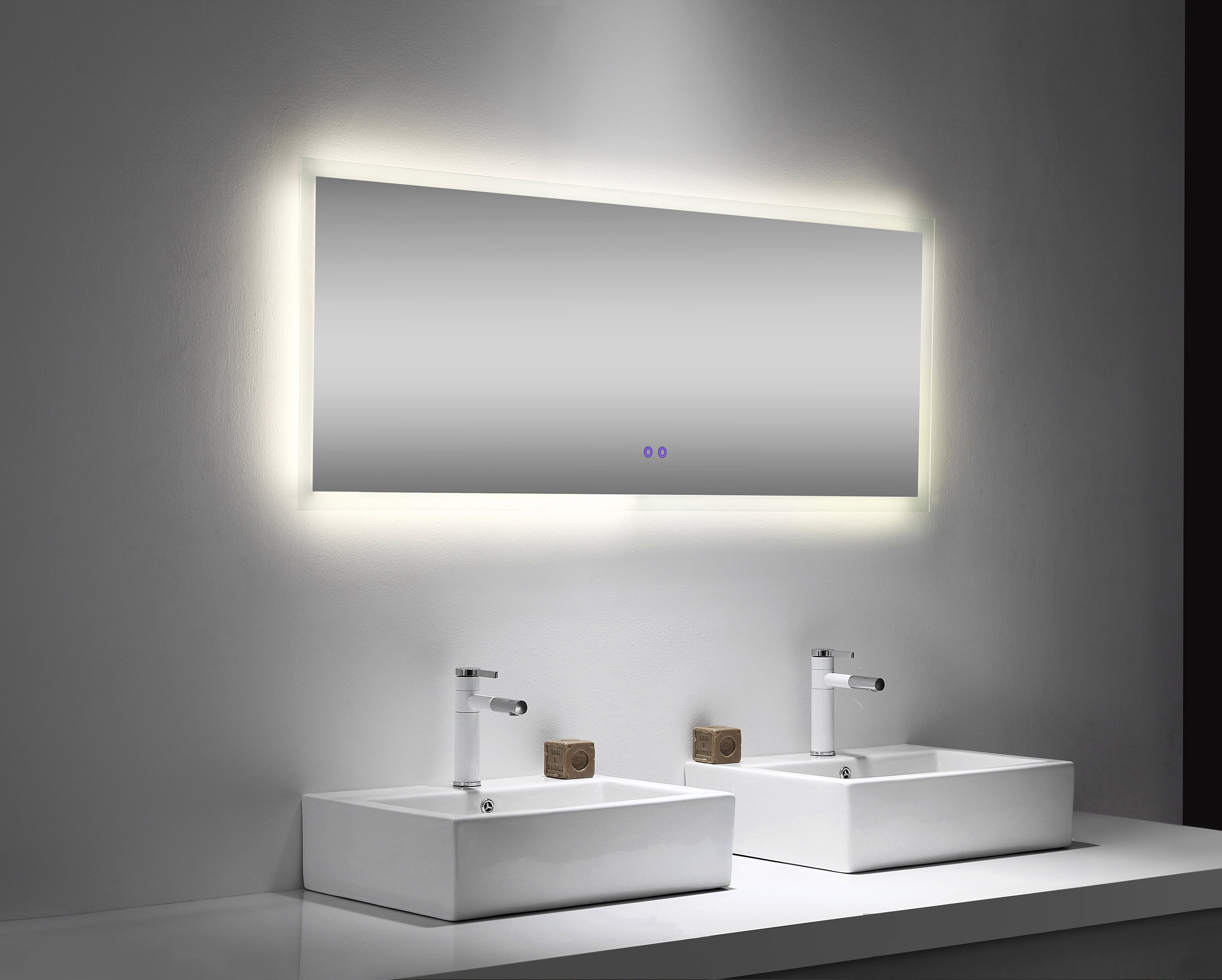 Freuen Sie sich hier einen tollen Spiegel für Badezimmer gefunden zu haben, der nicht nur schön groß ist, sondern außerdem beleuchtet ist. Die LED-Beleuchtung ist sparsam und rund um den Speigel angeordnet. Sie können mit diesen Spiegel beispielsweise einen Doppelwaschtisch überspannen oder Sie können - wie auf dem Bild - zwei kleinere Waschbeckenschränke krönen. Ein großer Spiegel sorgt für eine optische Vergrößerung des Badezimmers und bringt eine weite Atmosphäre im Bad.