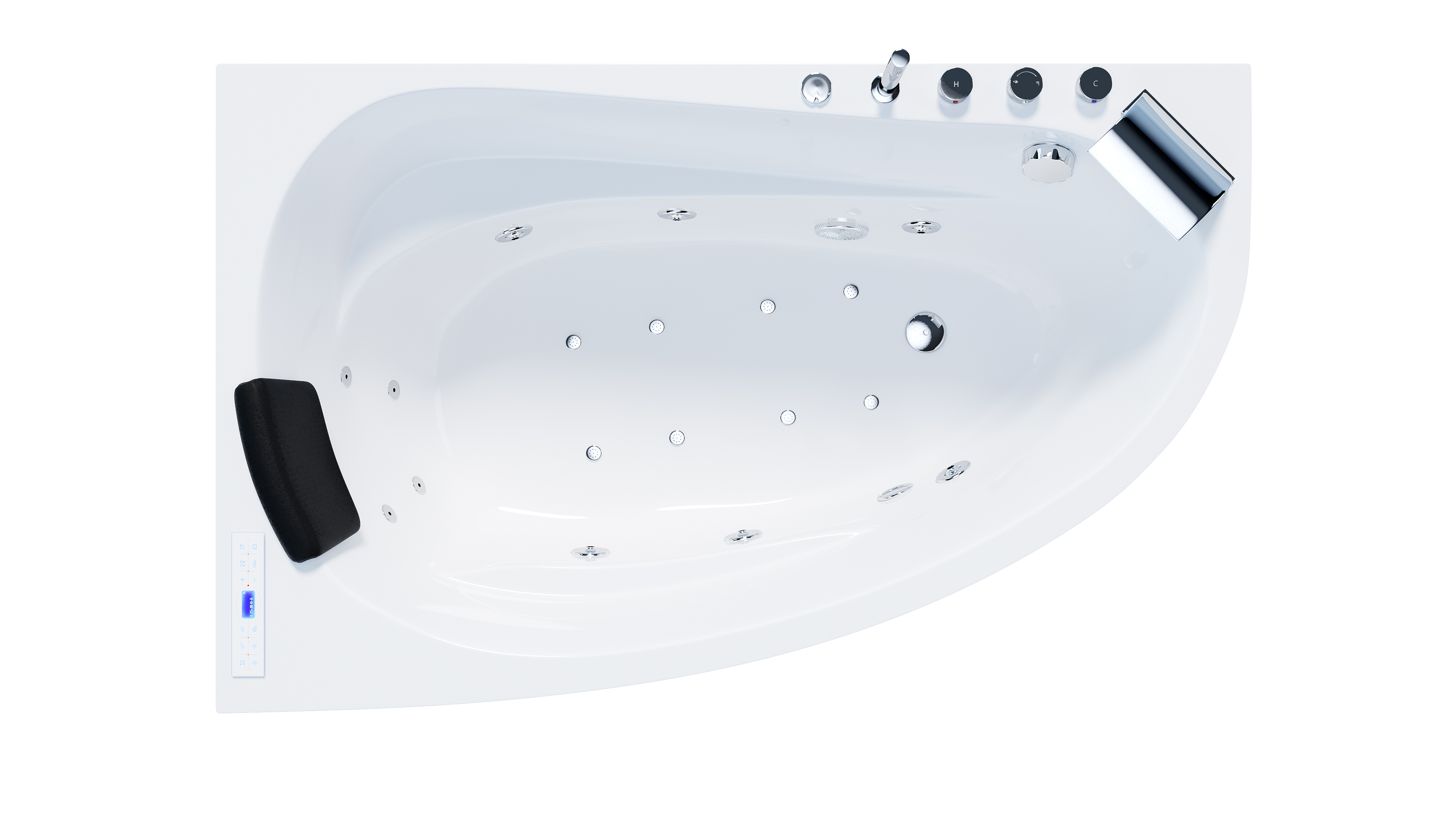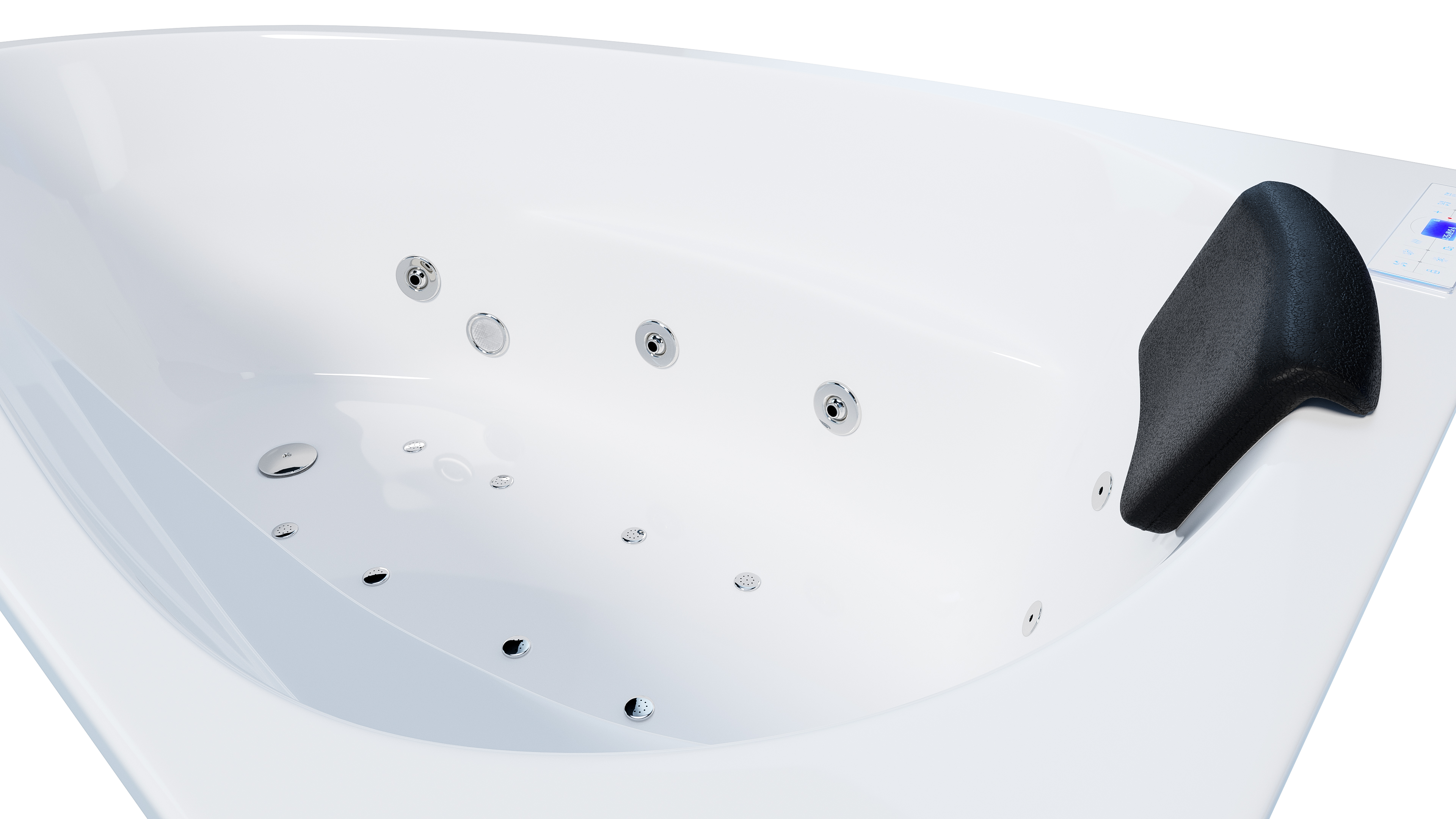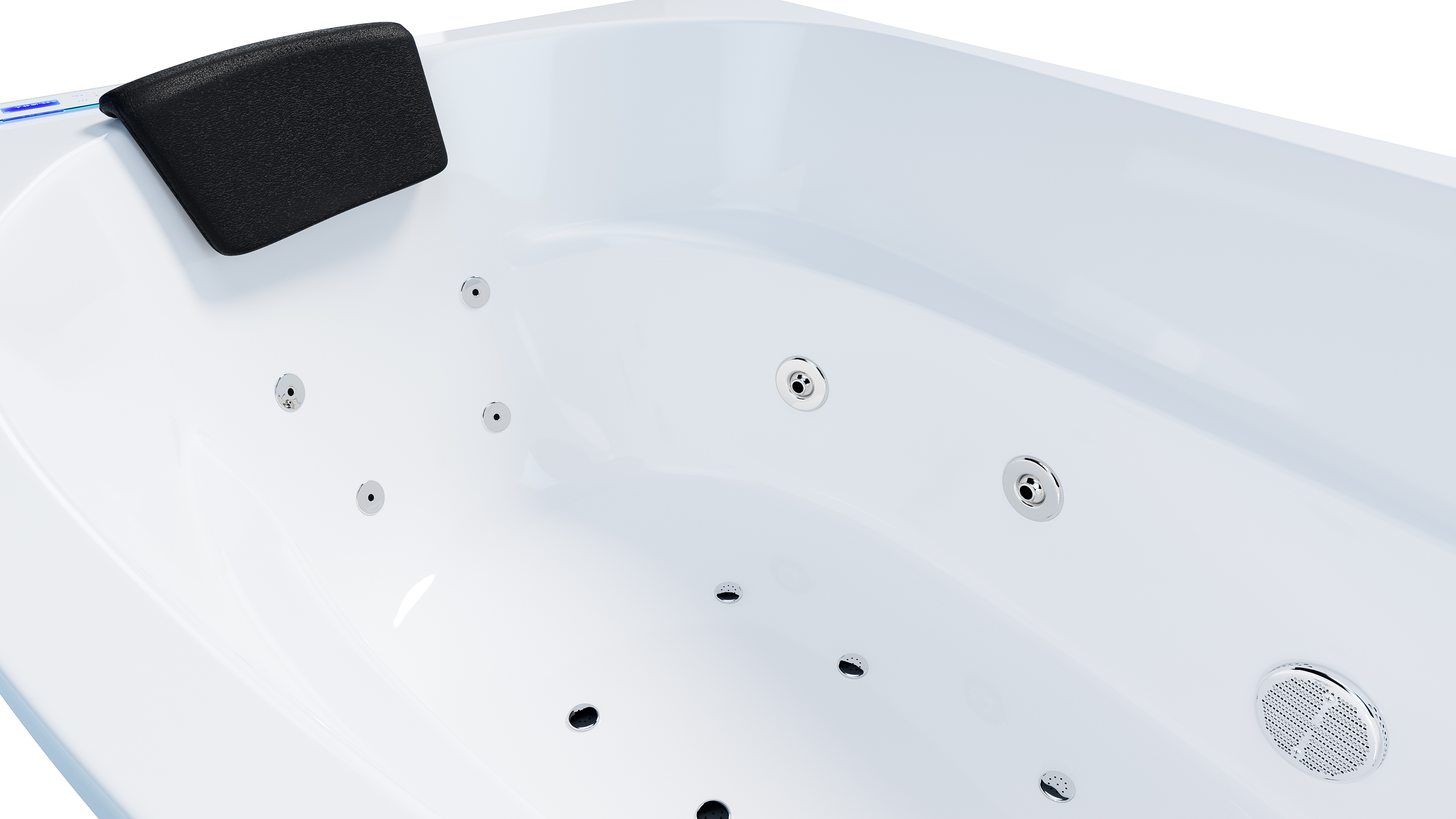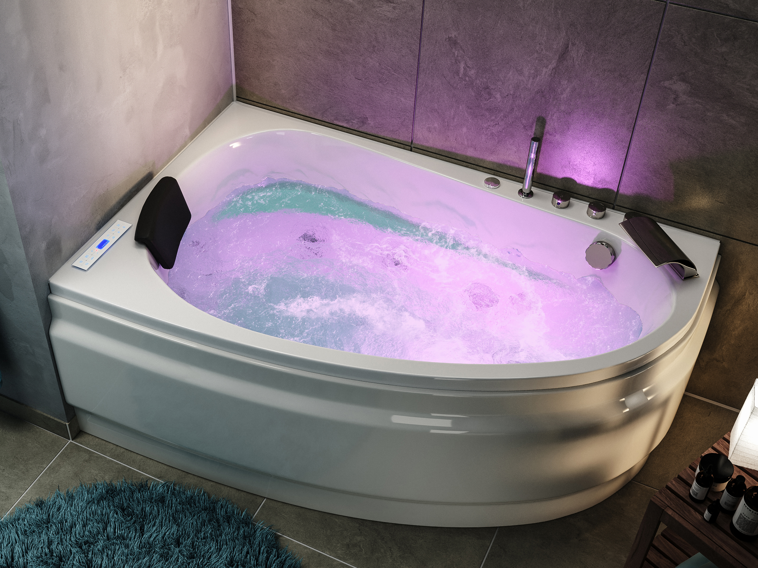 Vorteile: Dezente Strahler seitlich. Automatischer Farbwechsel mit gleichmäßiger Wasserbeleuchtung. Intensive Farben leuchten unter Wasser. Entspanntes Baden mit Chromotherapie.Massagefunktion: Düsen-Ausstattung