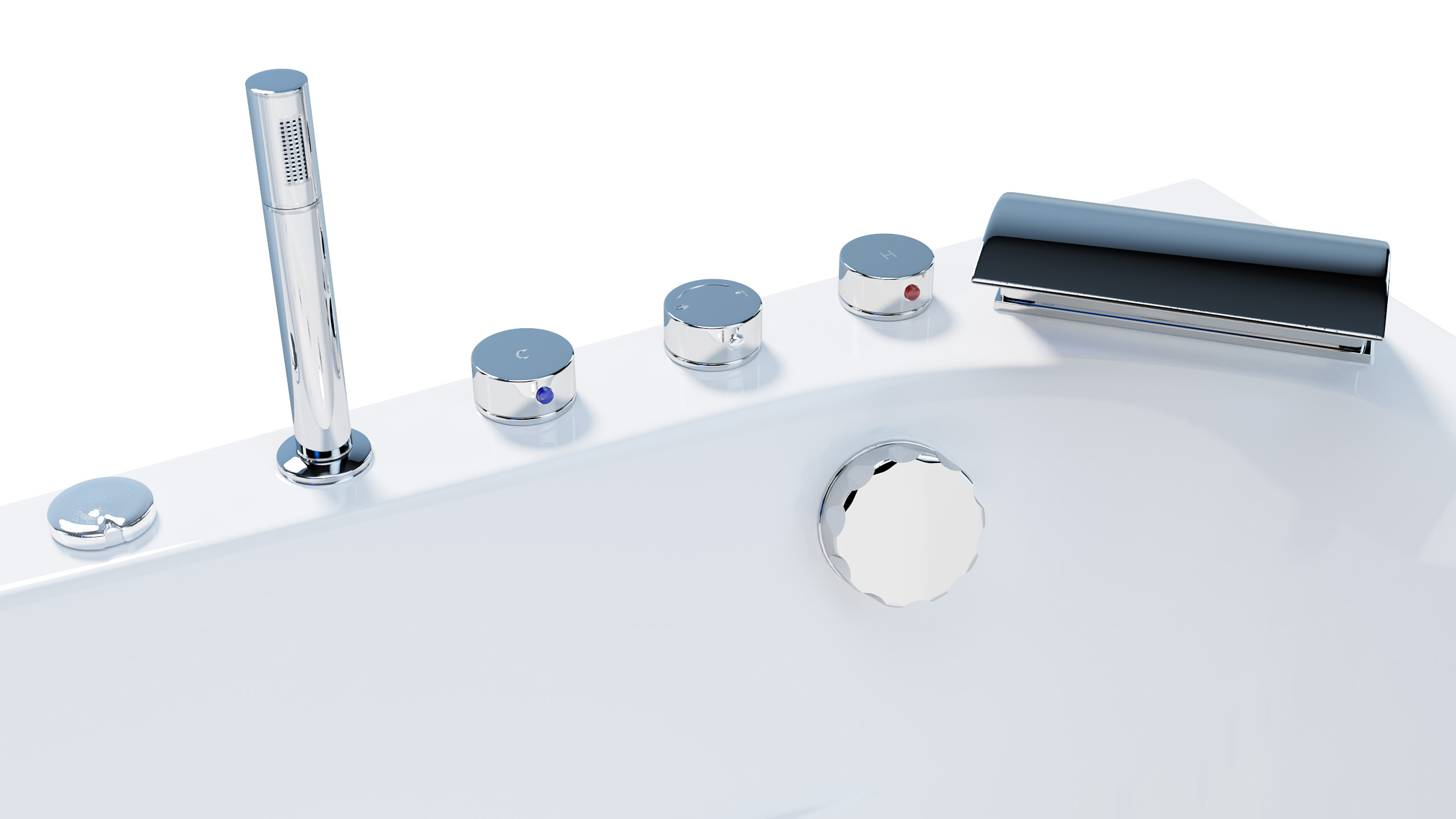 | Lieferumfang | Whirlpool-Wanne, 12 V LED-Beleuchtung, Luftbeimischventil, 3er-Armatur, Handbrause und Wasserfall-Armatur, Ab- und Überlauf |