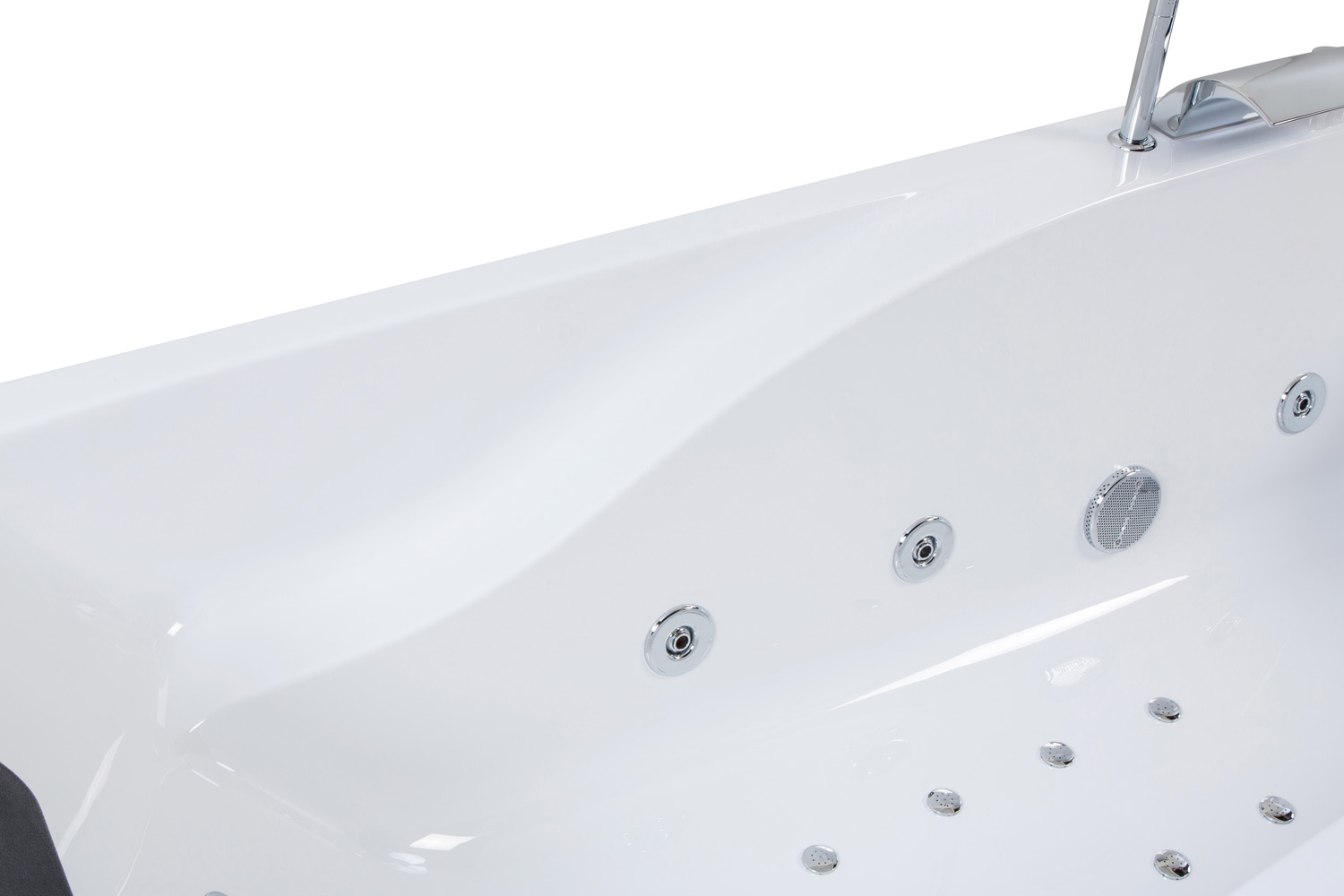 6 Stk. große Seitendüsen Hydrojets Hydromassage, 1x4 Stk. große Düsen Hydrojets Hydromassage im Rückenbereich, 8 Stk. Bodenluftdüsen Aerojets (Prickelnder Sprudel-Effekt).Material: Wanne aus Sanitäracryl auf stabilem Rahmen mit höhenverstellbaren Füßen.