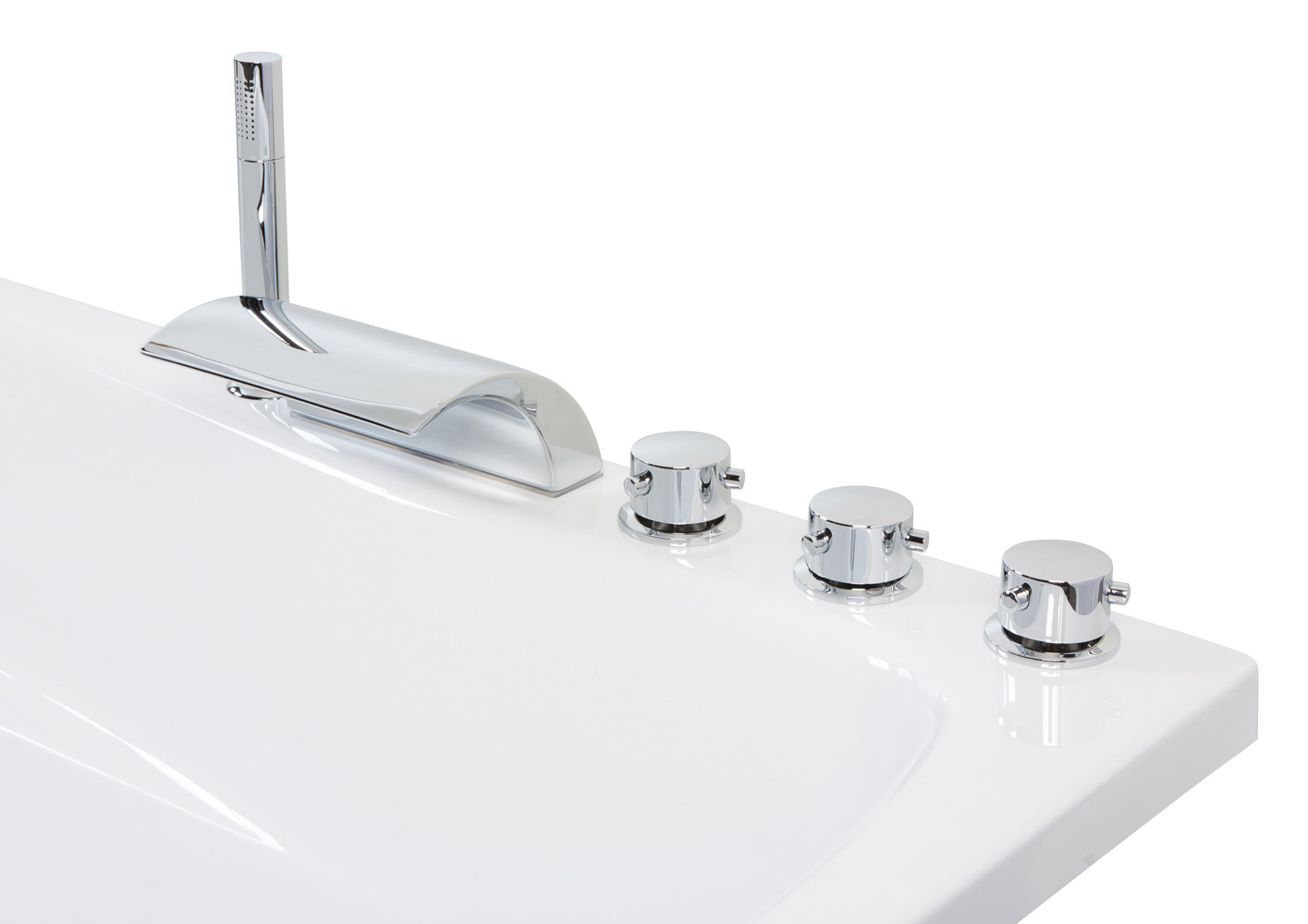 Zur kompletten Standard-Ausstattung gehören die 3er-Armatur (verchromte Messingarmatur mit Kunststoff-Kartusche), die Standard-Handbrause sowie der Wasserfall.