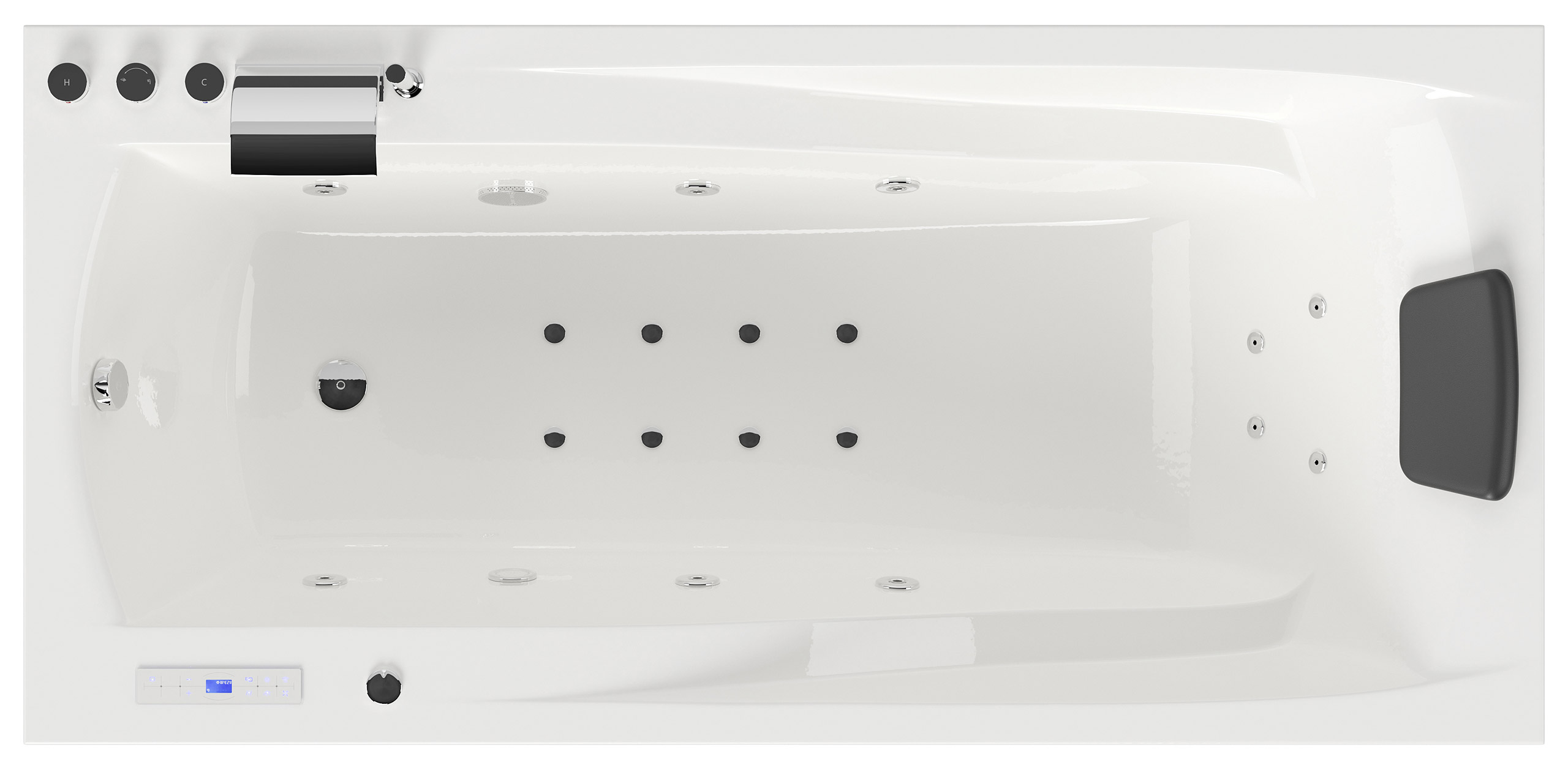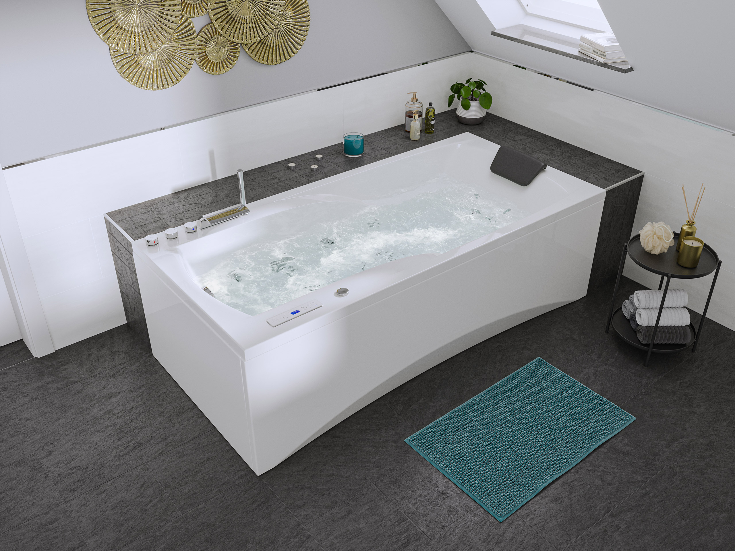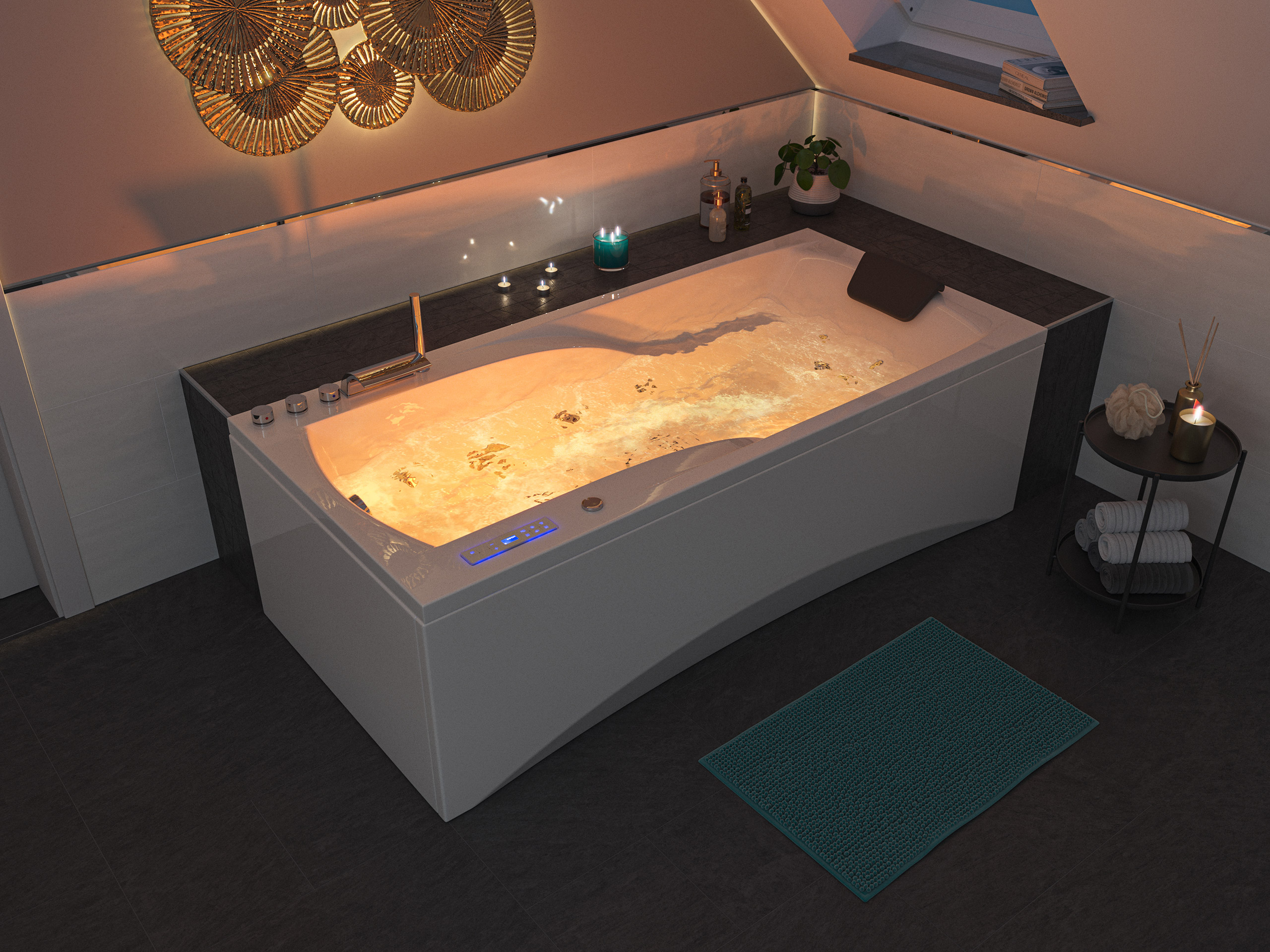 Vorteile: Dezente Strahler seitlich. Automatischer Farbwechsel mit gleichmäßiger Wasserbeleuchtung. Intensive Farben leuchten unter Wasser. Entspanntes Baden mit Chromotherapie.Massagefunktion: Düsen-Ausstattung