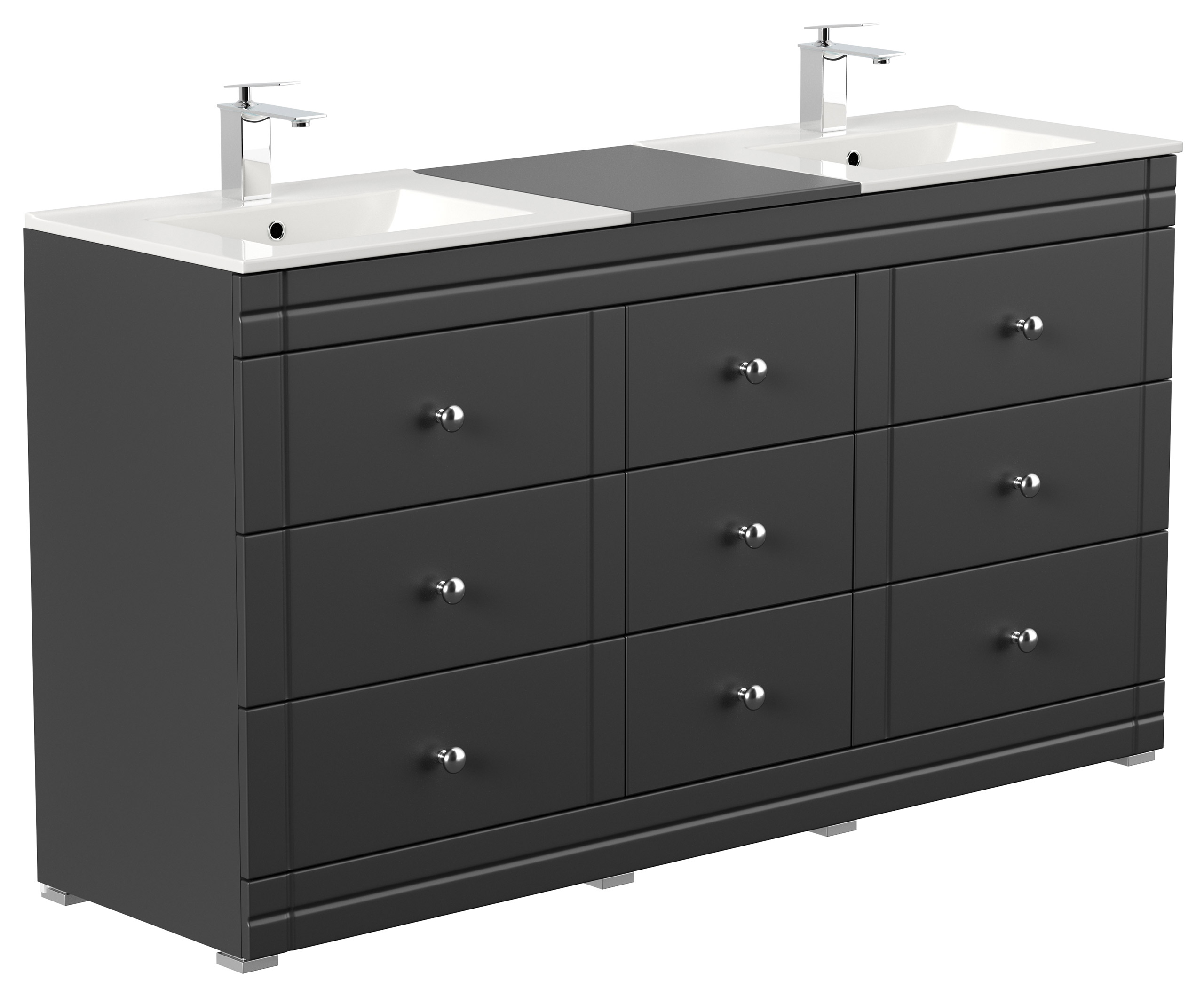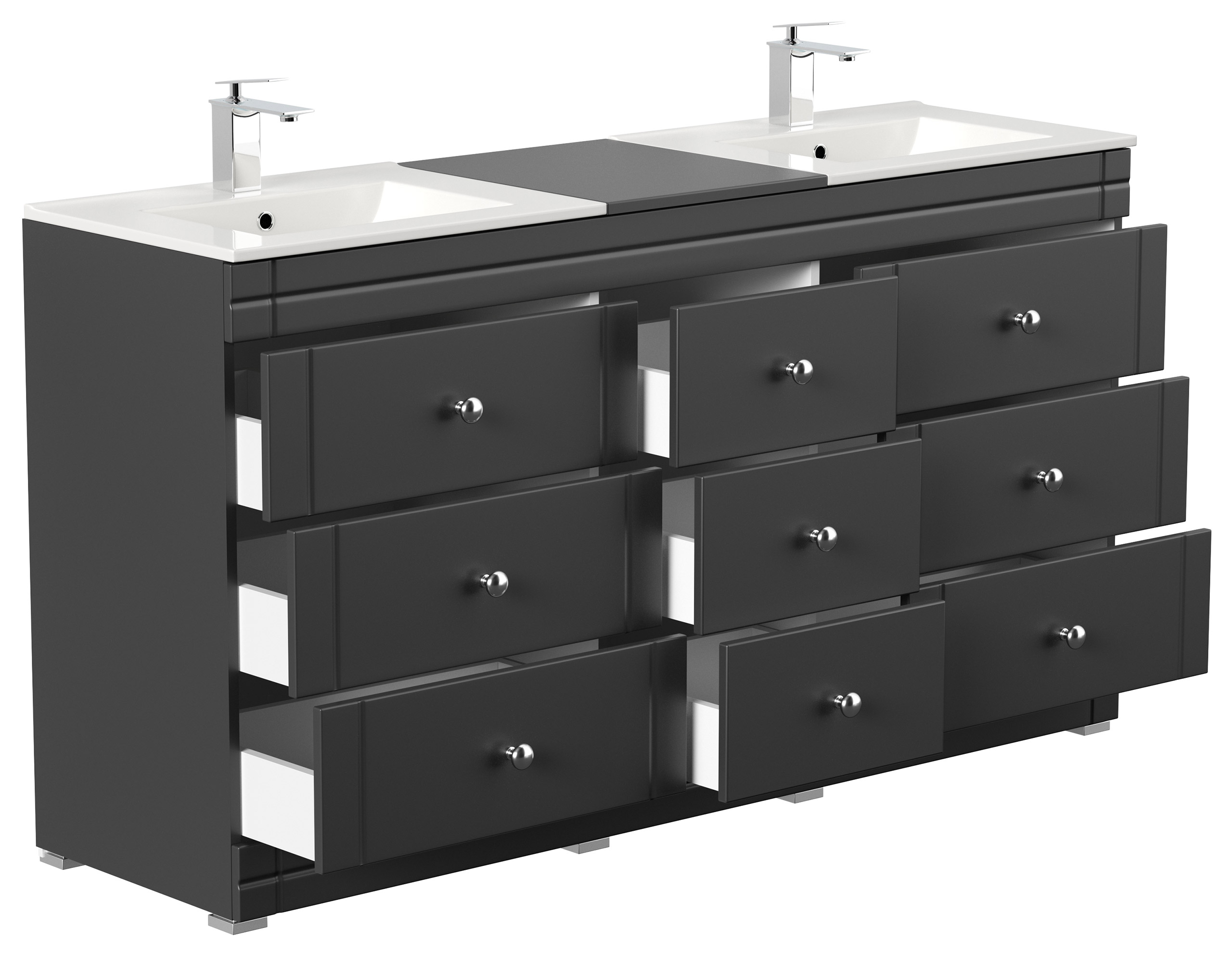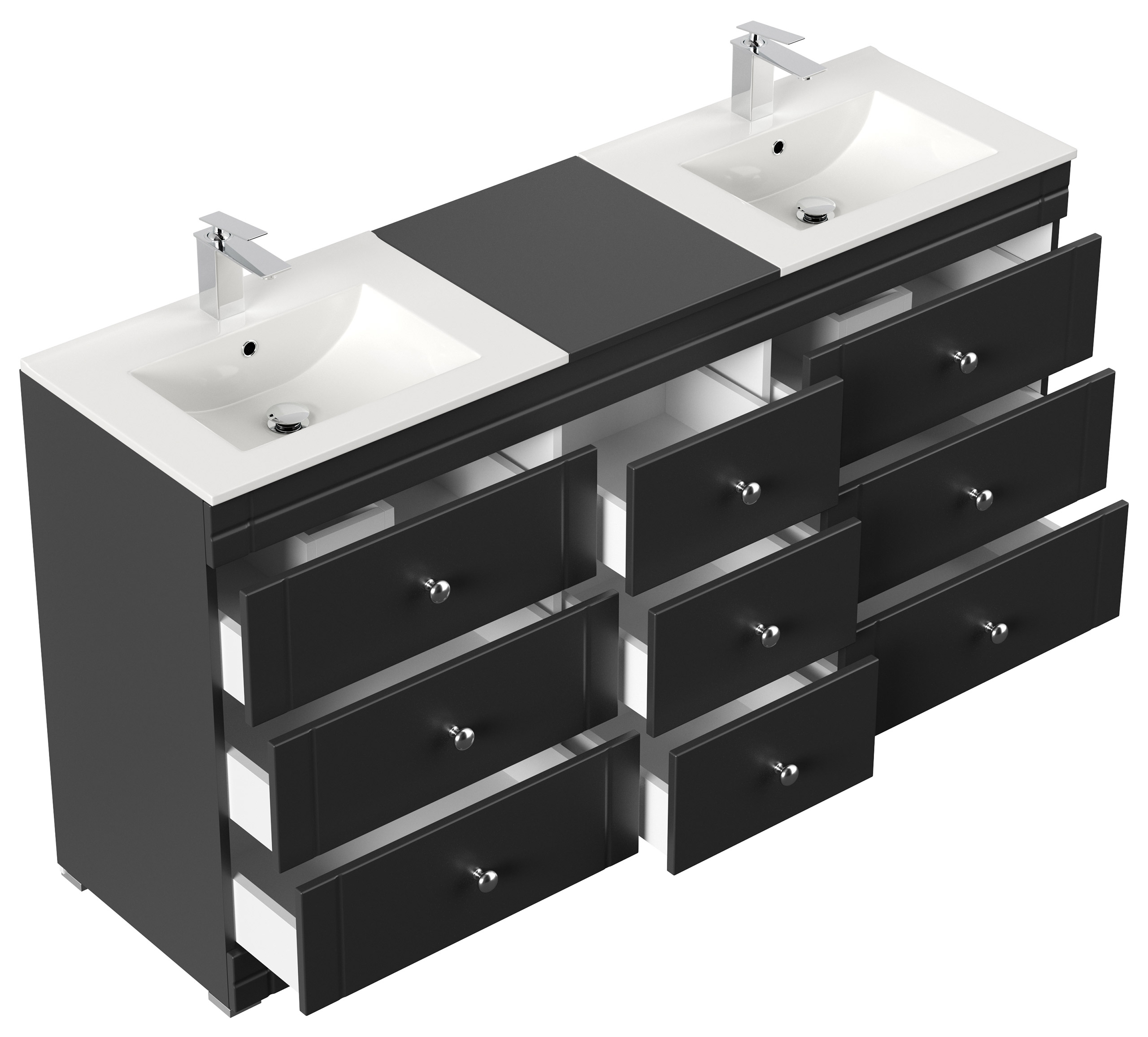 Badmöbel Doppelwaschtisch als Badezimmerblock stehend in der Farbe Schwarz seidenglanz mit sensationell großem Stauraum durch 9 Softclose-Schubladen inkl. zwei Keramikwaschbecken!
