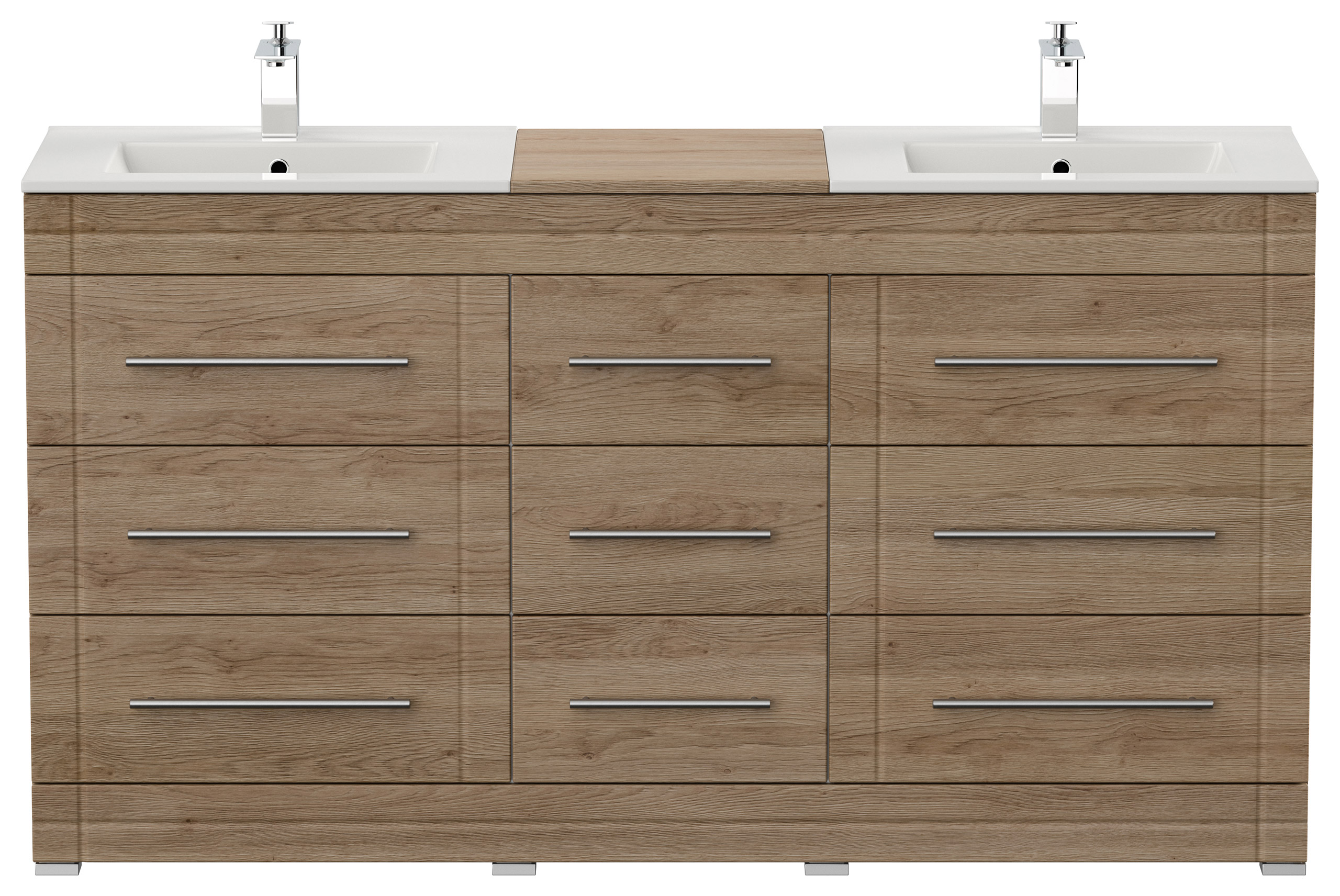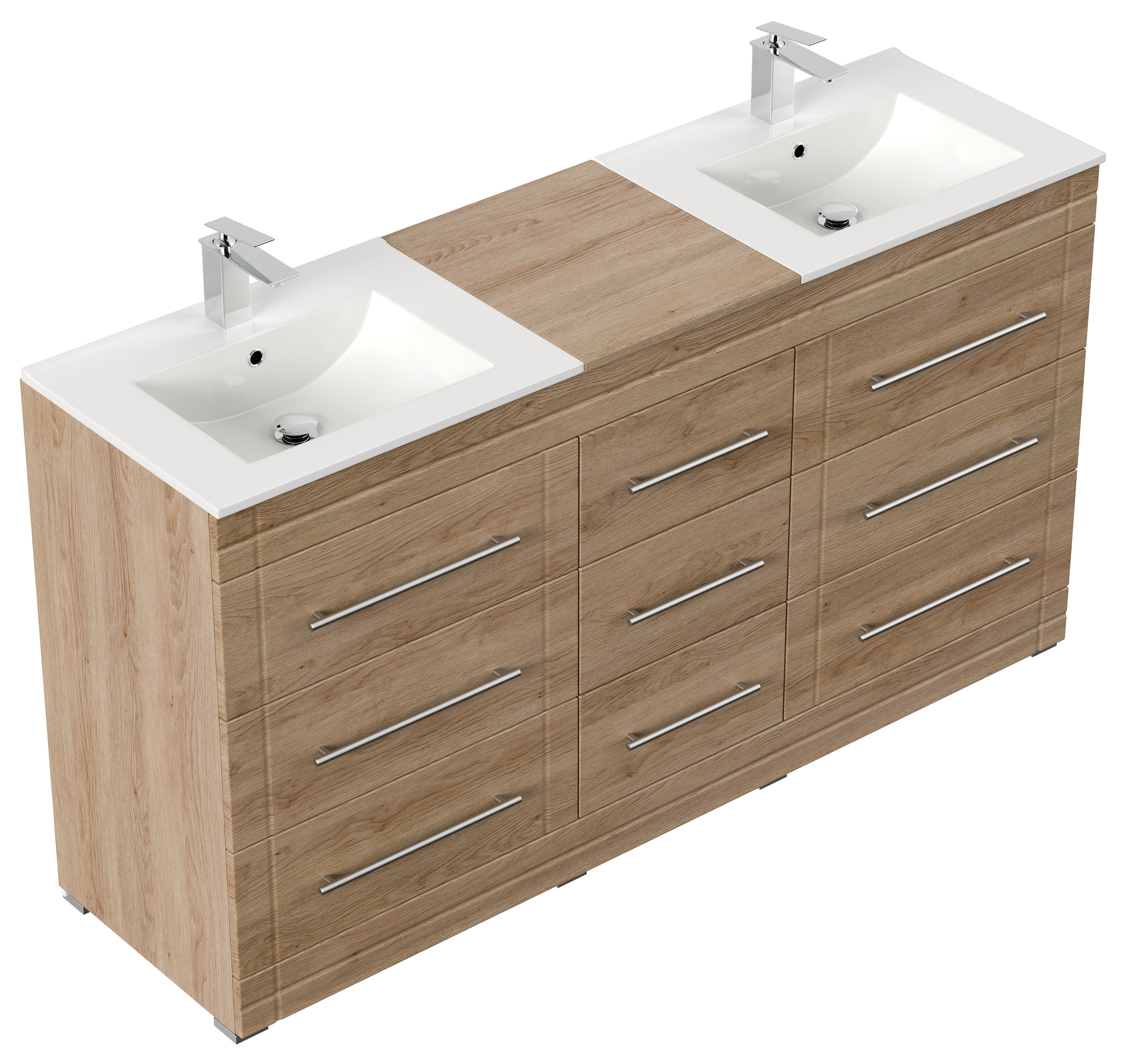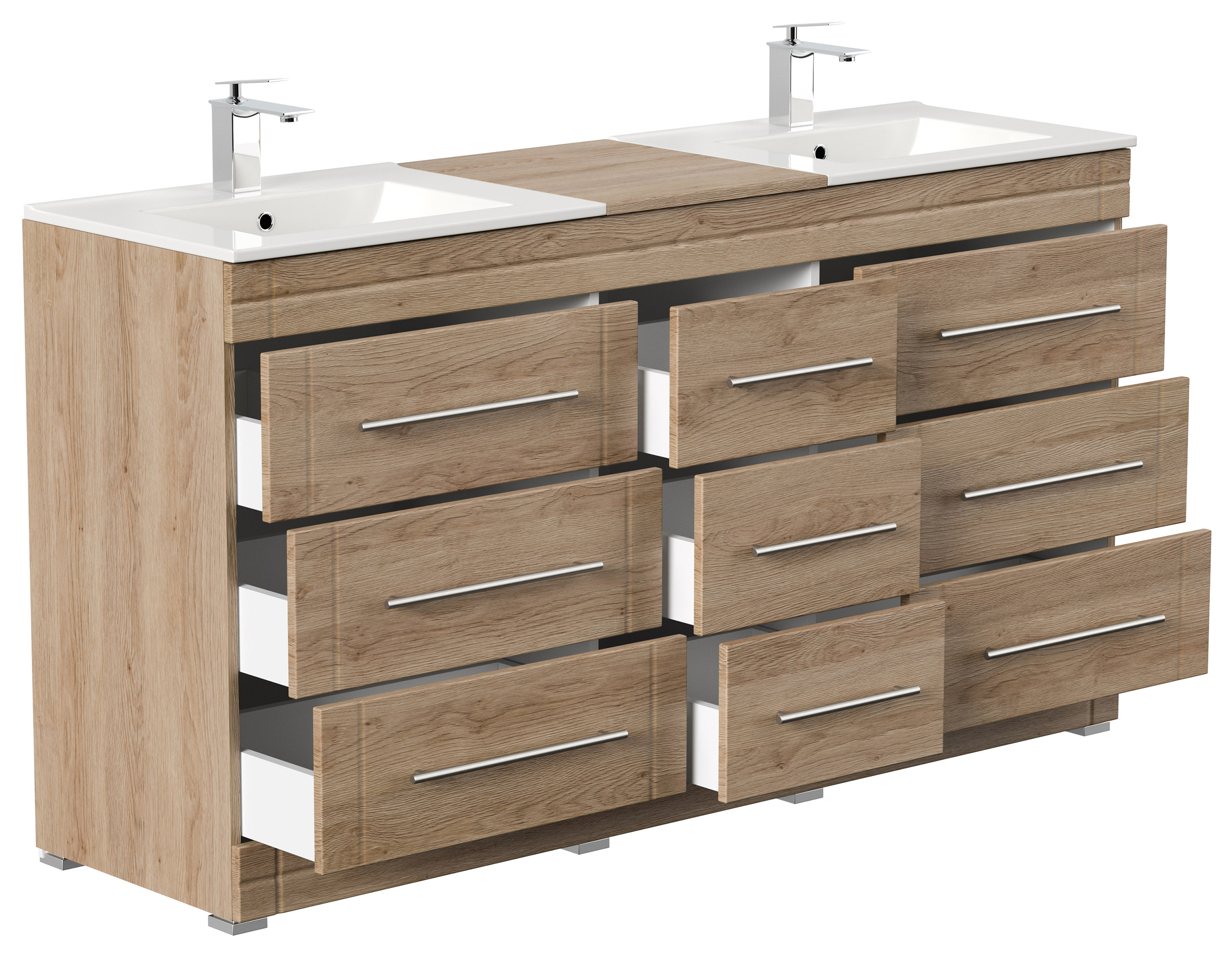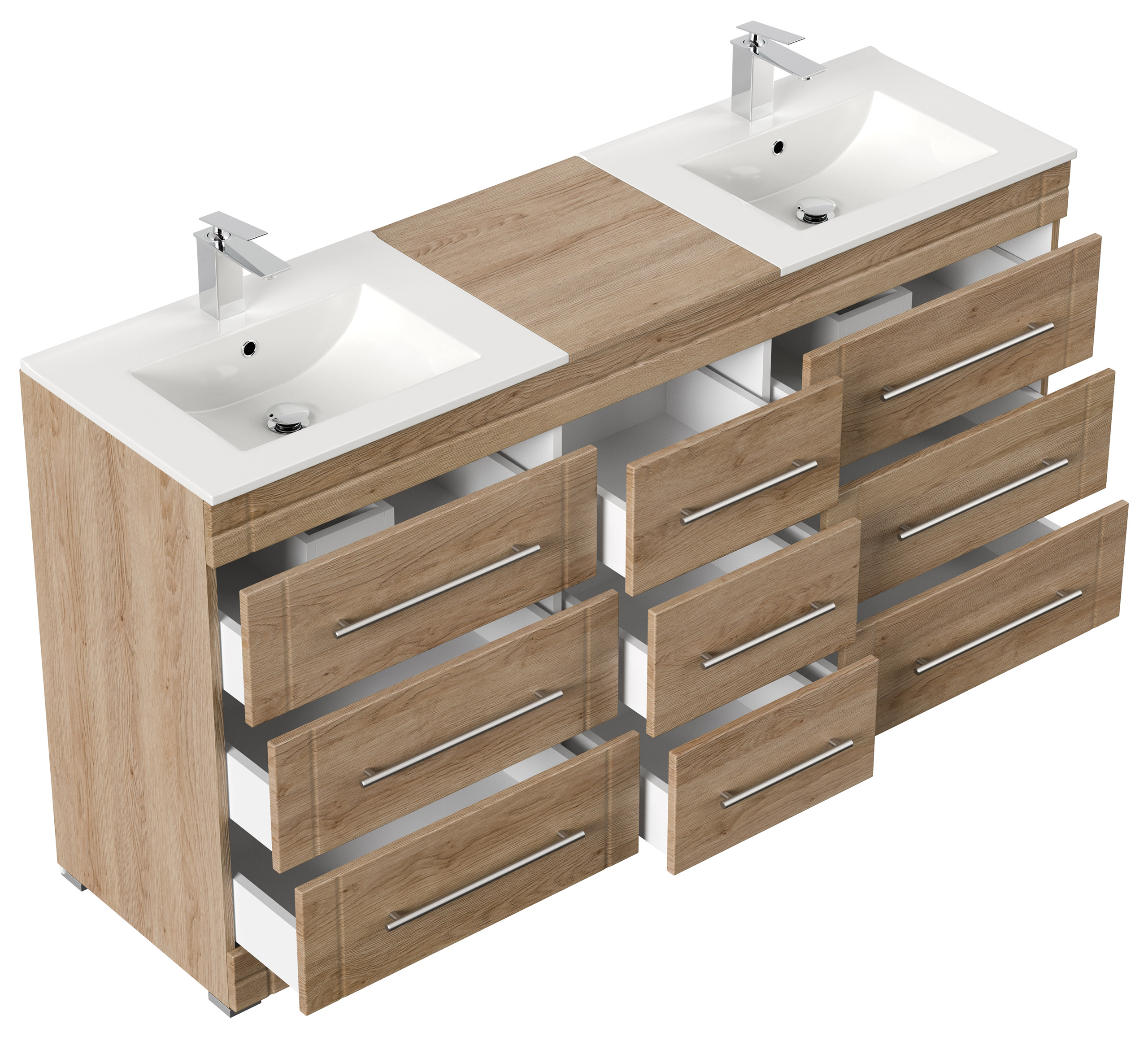 Stand Badmöbel Cosmo Modern Eiche hell Stand Badmöbel Cosmo Modern 9 Schubladen mit dekorativen Einfräsungen und aus matt gebürstetem Edelstahl gefertigten Griffen