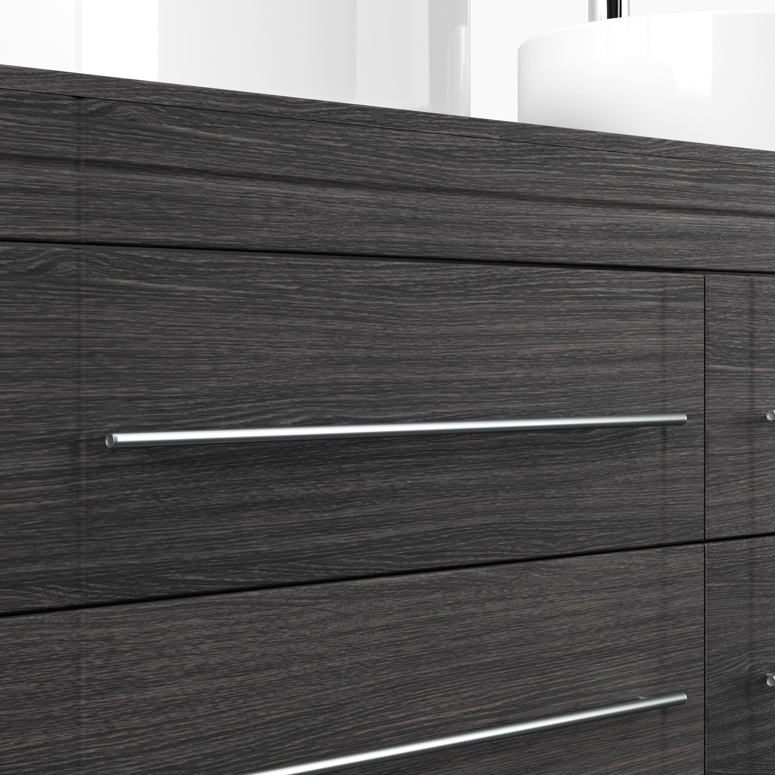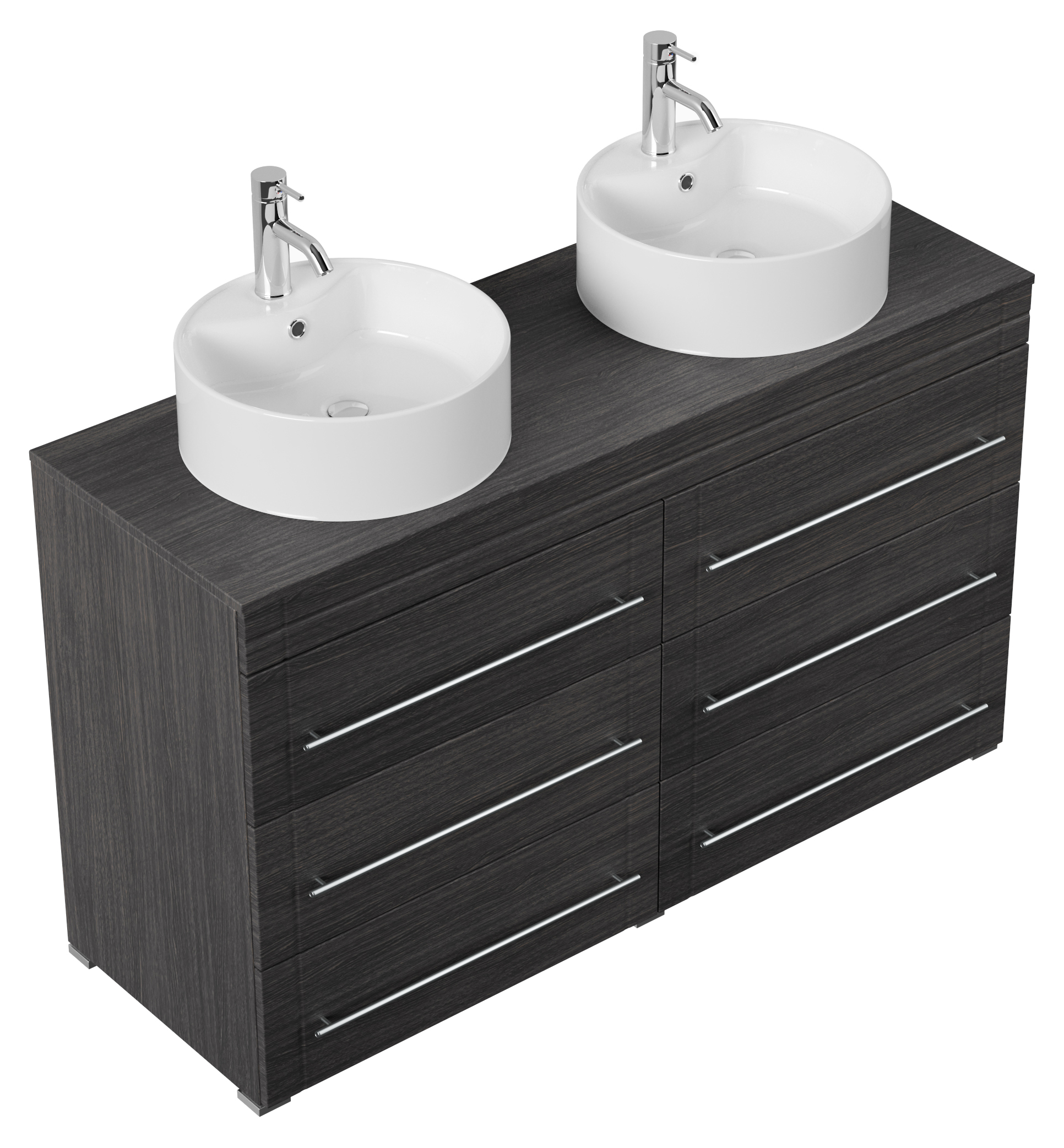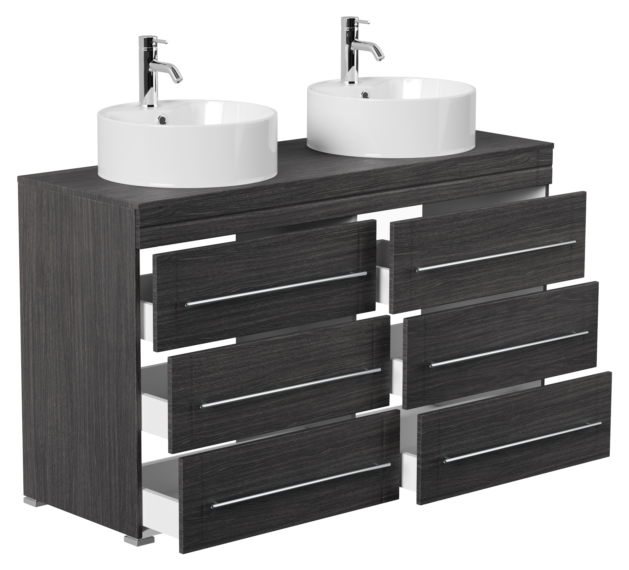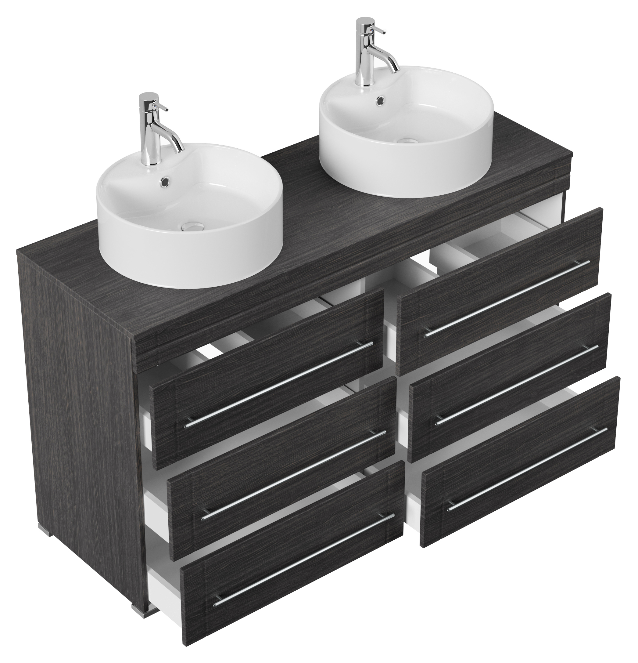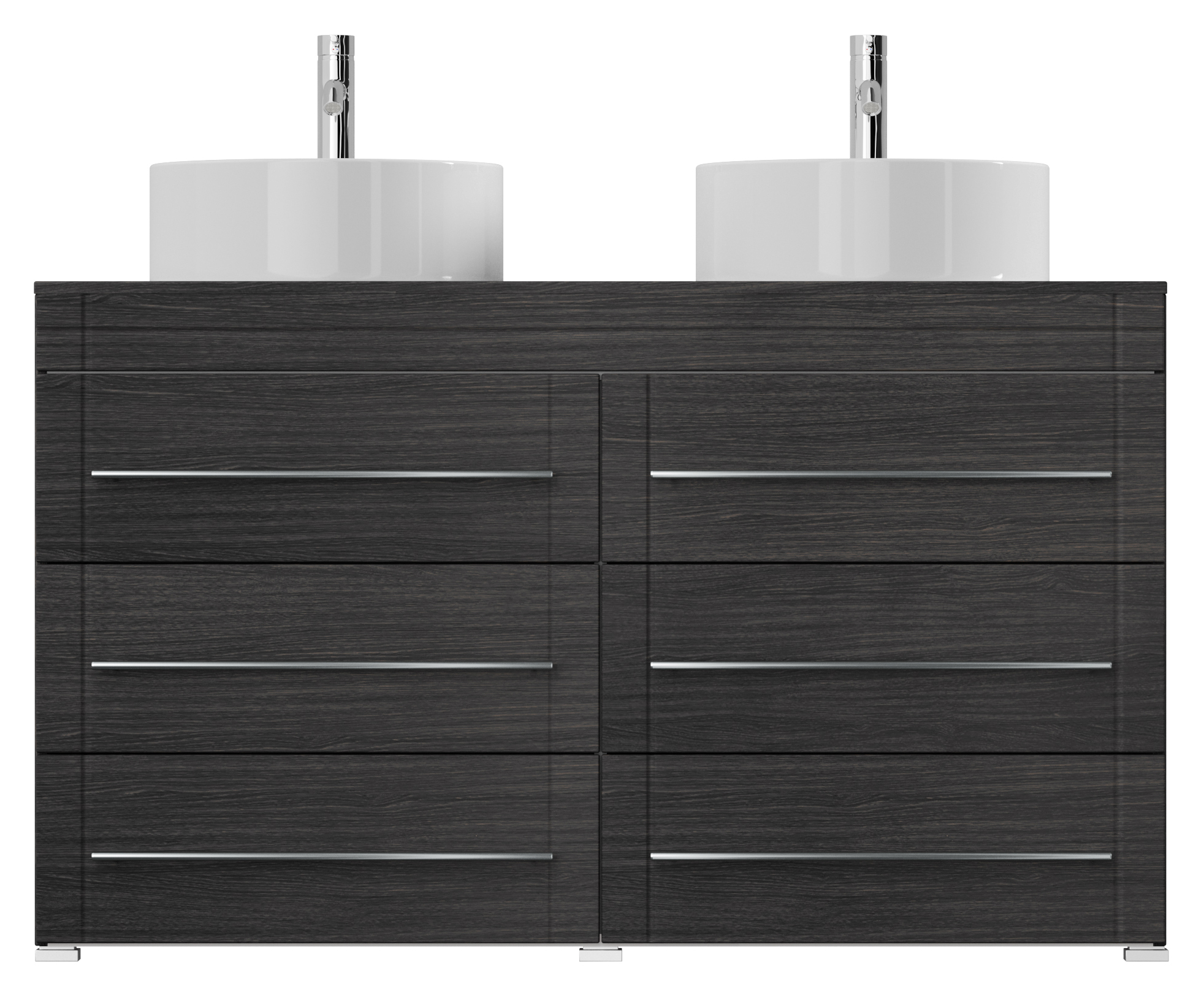 Stand Badmöbel Memoria Modern Anthrazit gemasert mit runden Aufsatzwaschbecken, 6 Softclose-Schubladen mit dekorativen Einfräsungen und aus matt gebürstetem Edelstahl gefertigten Griffen