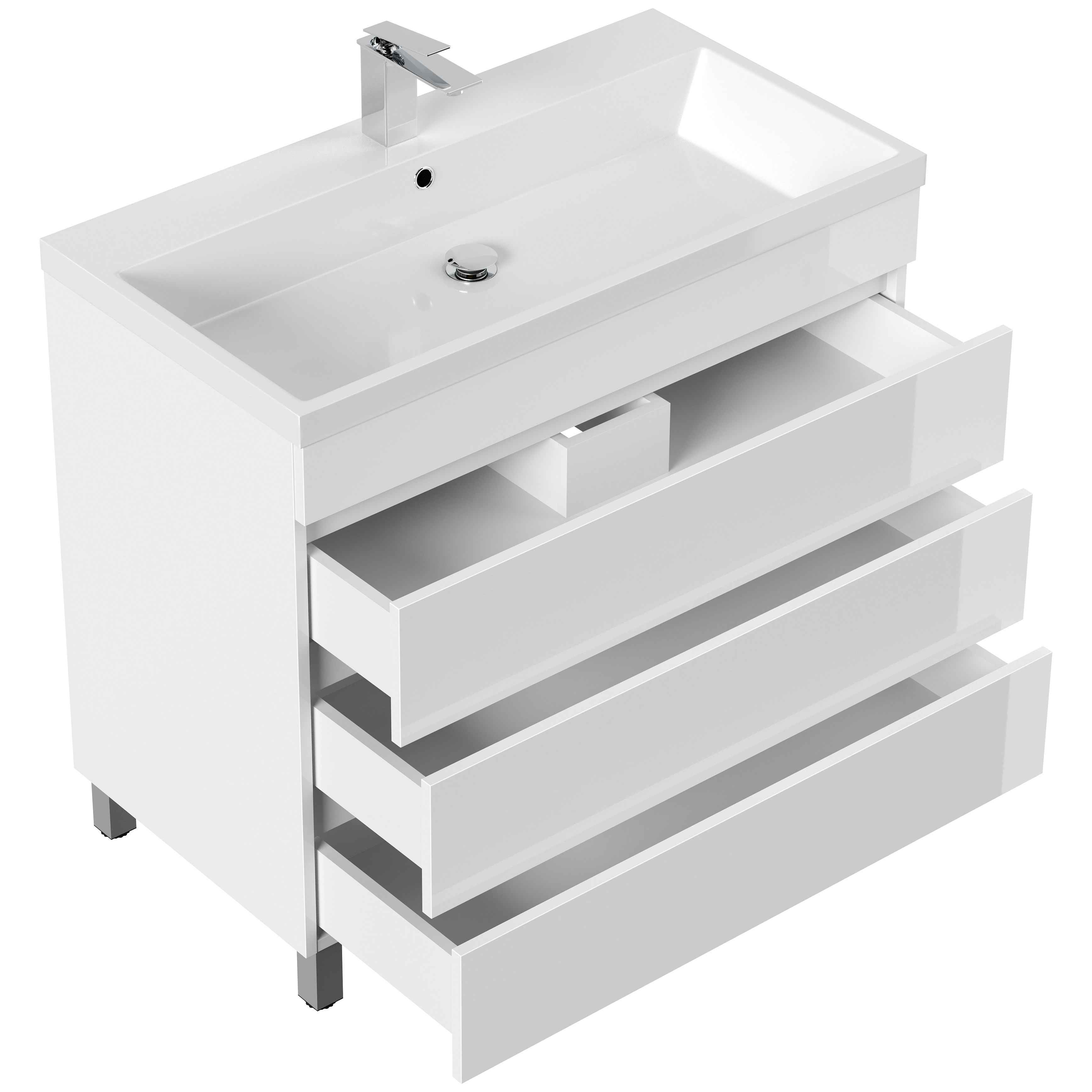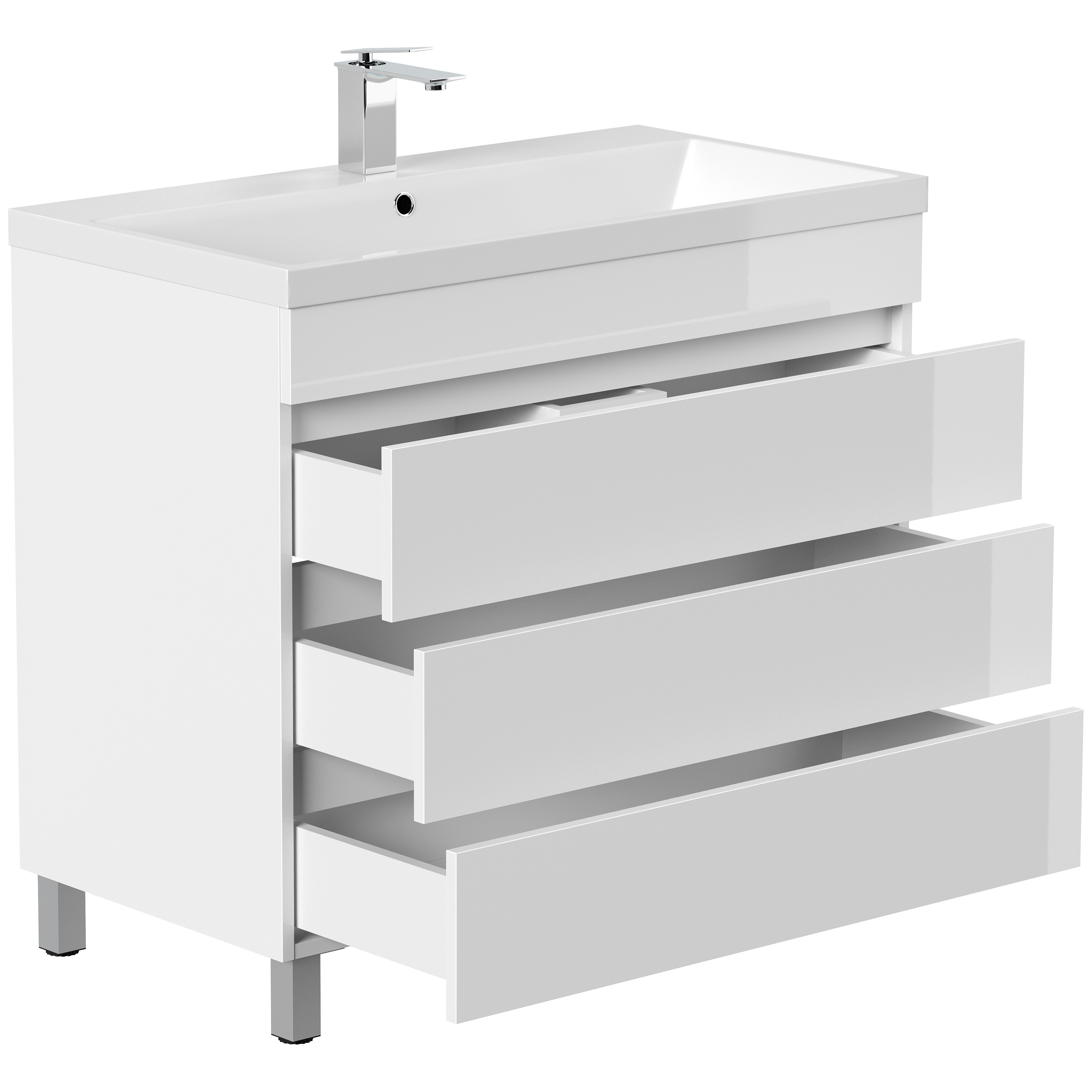 Stand Badmöbel Via 90 SoftClose weiss hochglanz mit drei grifflosen Schubladen