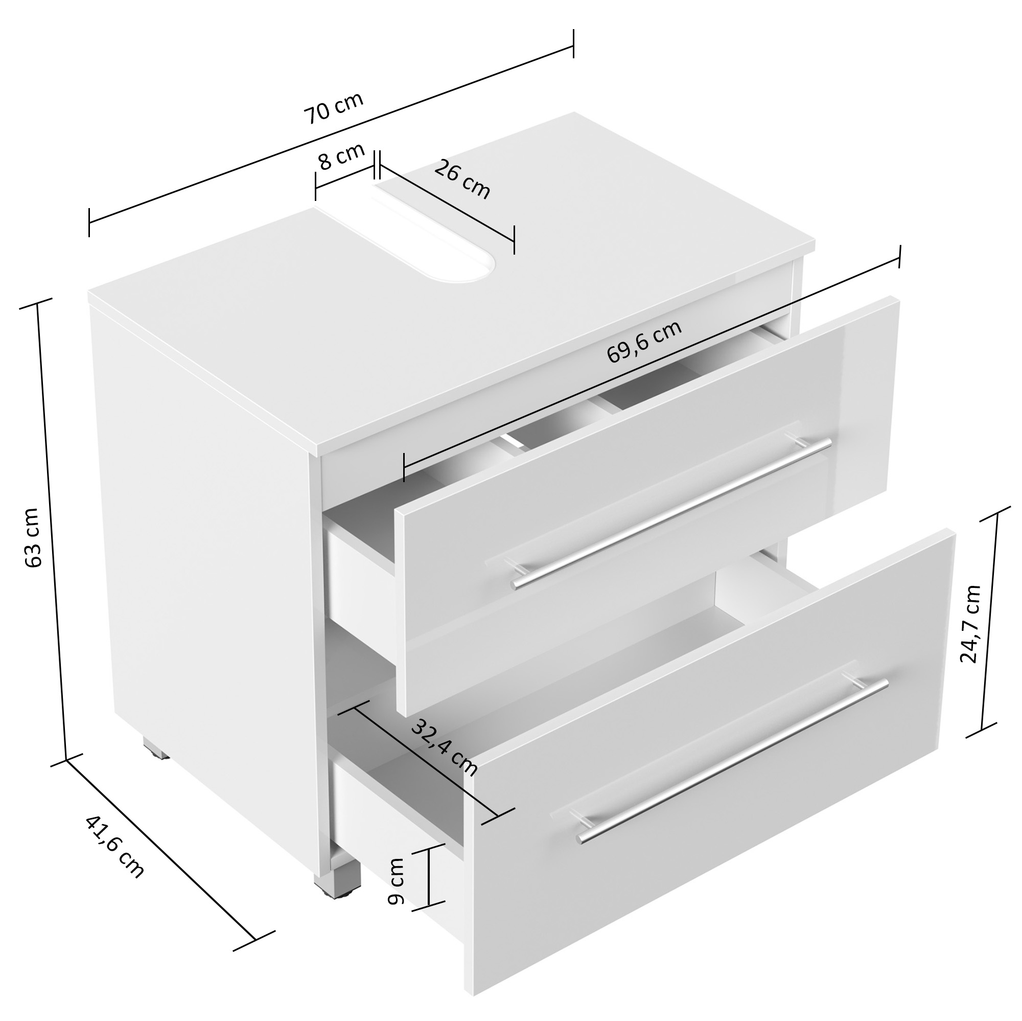 Waschtischunterschrank: (B/H/T) 70/56,6/41,6 cmHöhe mit Standfüßen 63,1 cm.