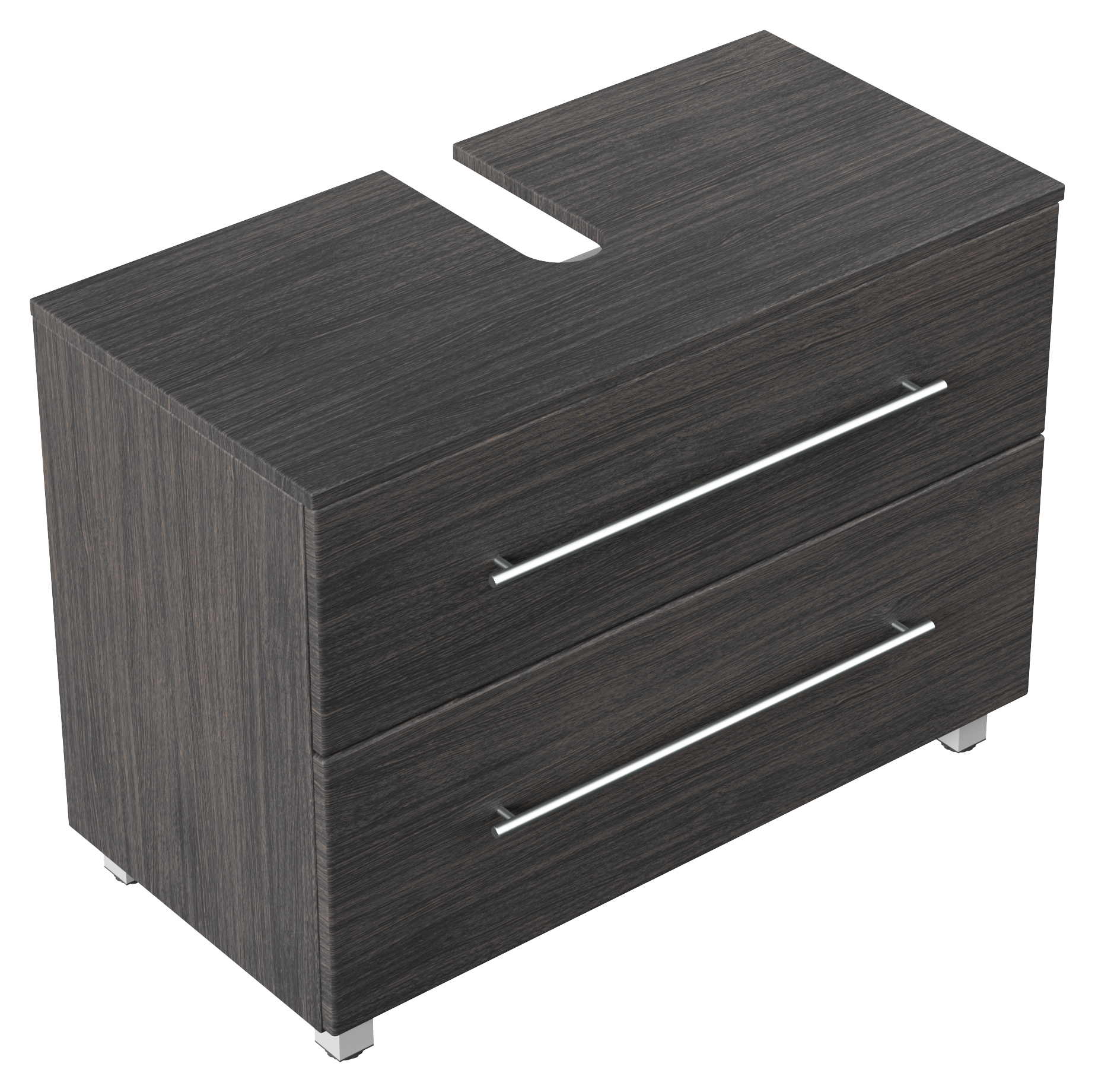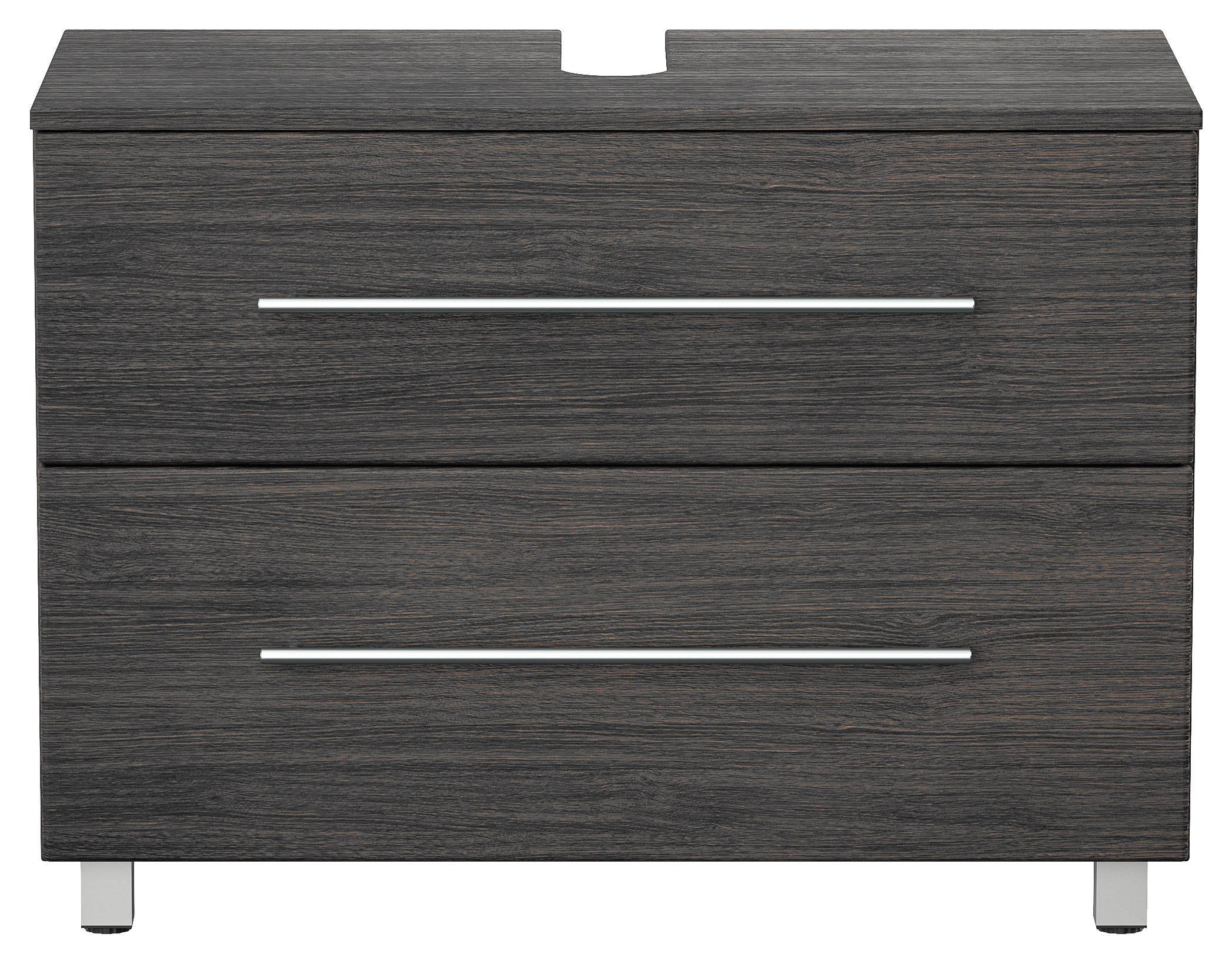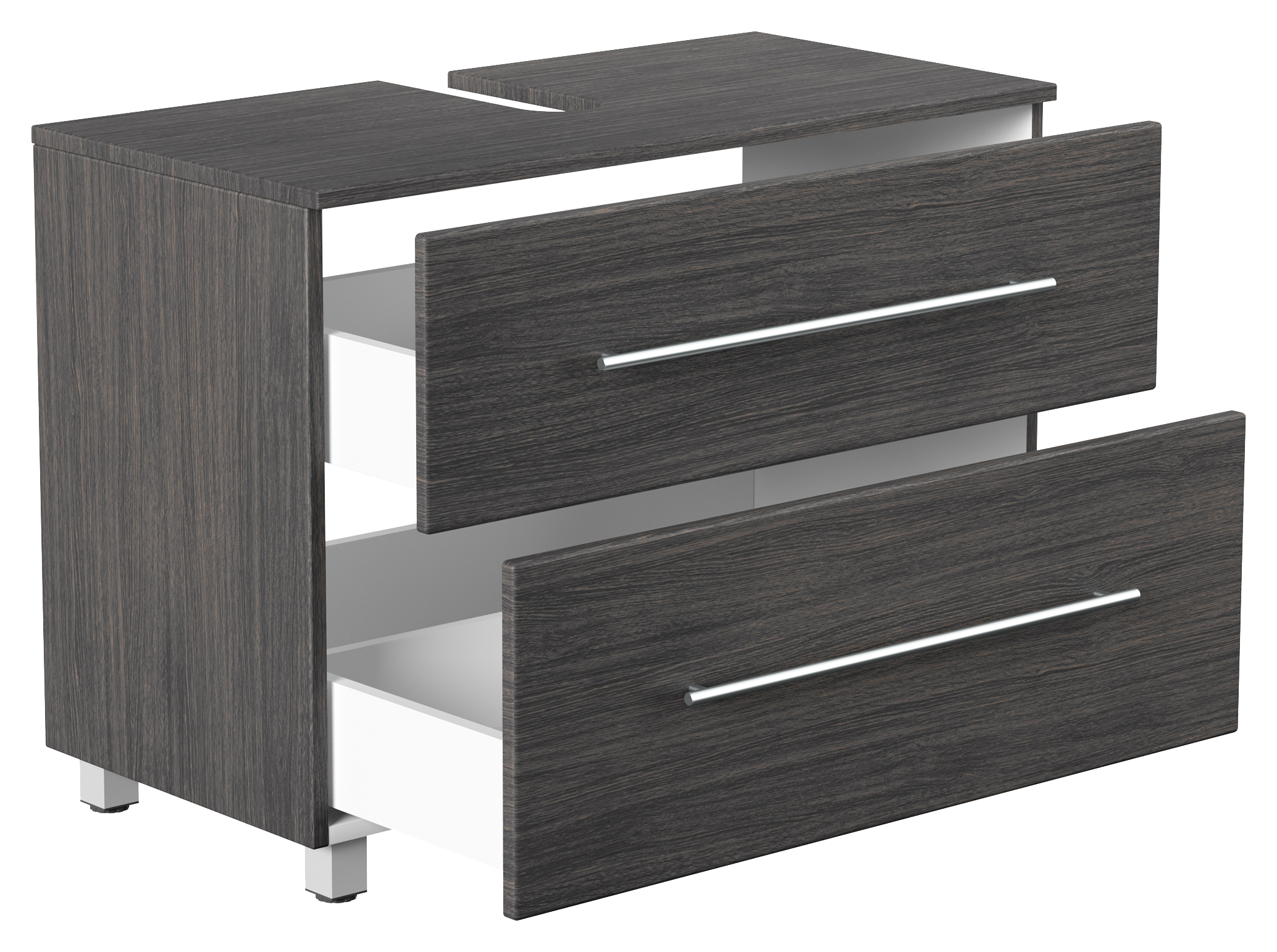 Ihr Waschbecken verwandelt sich in ein attraktives Badmöbel mit diesem Universal Unterbau. Der 85 cm breite Waschbeckenunterschrank mit den Oberflächen in der Farbe Anthrazit gemasert wurde für Waschbecken bis zu 100 cm Breite entworfen. Ihr Bad wirkt mit diesem Waschtischunterschrank sofort eleganter. Sie stellen - ohne sanitärtechnische Vorarbeiten - den Waschtischunterschrank unter Ihr Waschbecken - fertig!Der Waschbeckenunterschrank besitzt zwei Schubladen mit extra breiten Griffen aus gebürstetem Edelstahl. Das komfortable Soft-Close-System garantiert selbsttätiges, weiches Schließen der Schubfächer und gestattet deren Vollauszug. Sie werden die größere Übersicht in Ihrem Waschbeckenunterschrank schnell zu schätzen wissen. Das Badmöbel ohne Waschbecken wird als Universal Unterbau in zerlegter Form geliefert. Gestalten Sie Ihr Bad mit wenig Aufwand neu - machen Sie mit diesem Waschbeckenunterschrank aus Ihrem Waschbecken ein elegantes Badmöbel!Nicht im Lieferumfang enthalten sind das Waschbecken, Deko, Spiegel, Armatur, Zuleitungen zum Wasserhahn, Siphon sowie in der Regel ebenfalls nicht der Waschbeckenverschluss Popup. Diese Artikel können gesondert bei uns erworben werden.