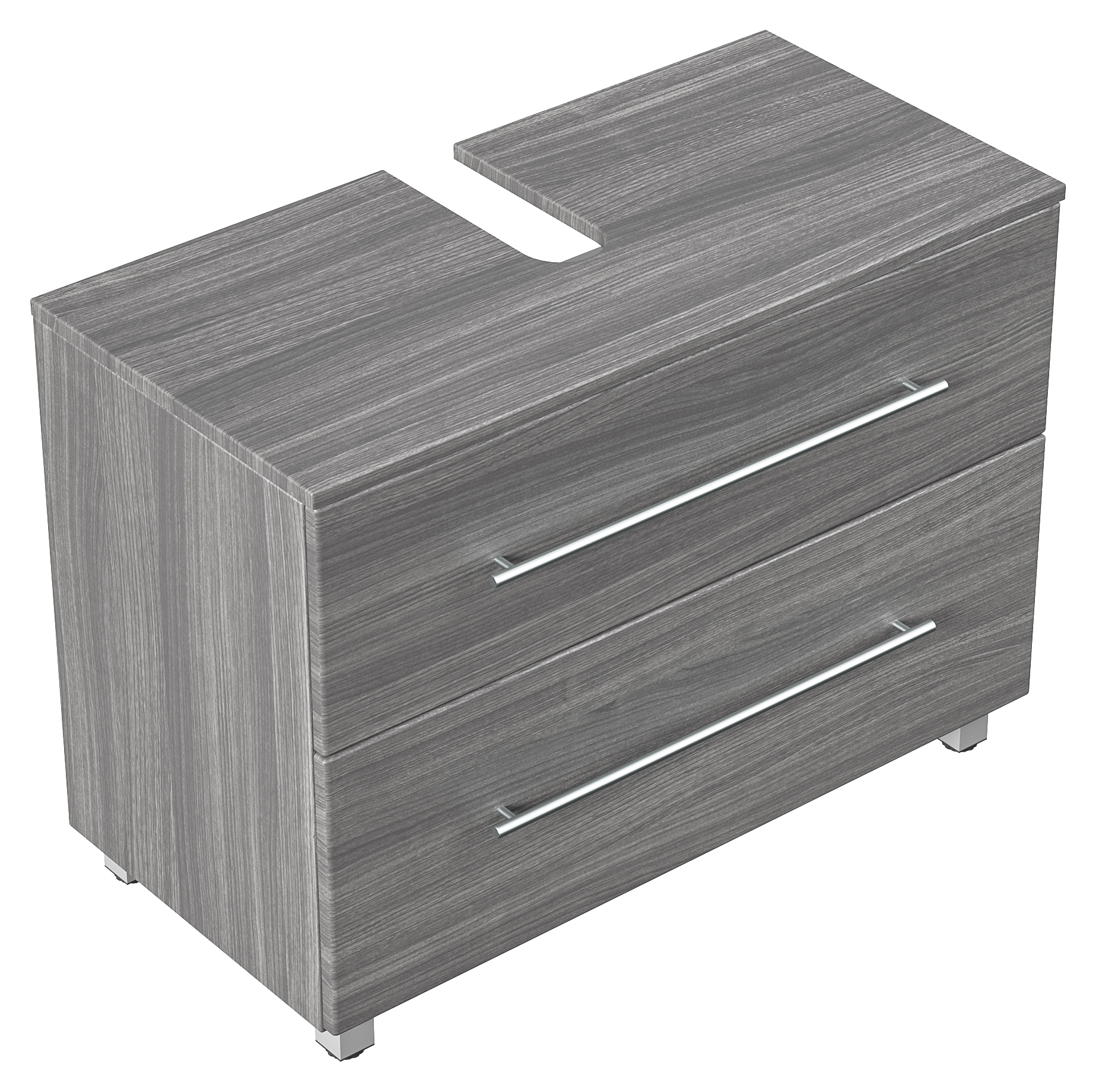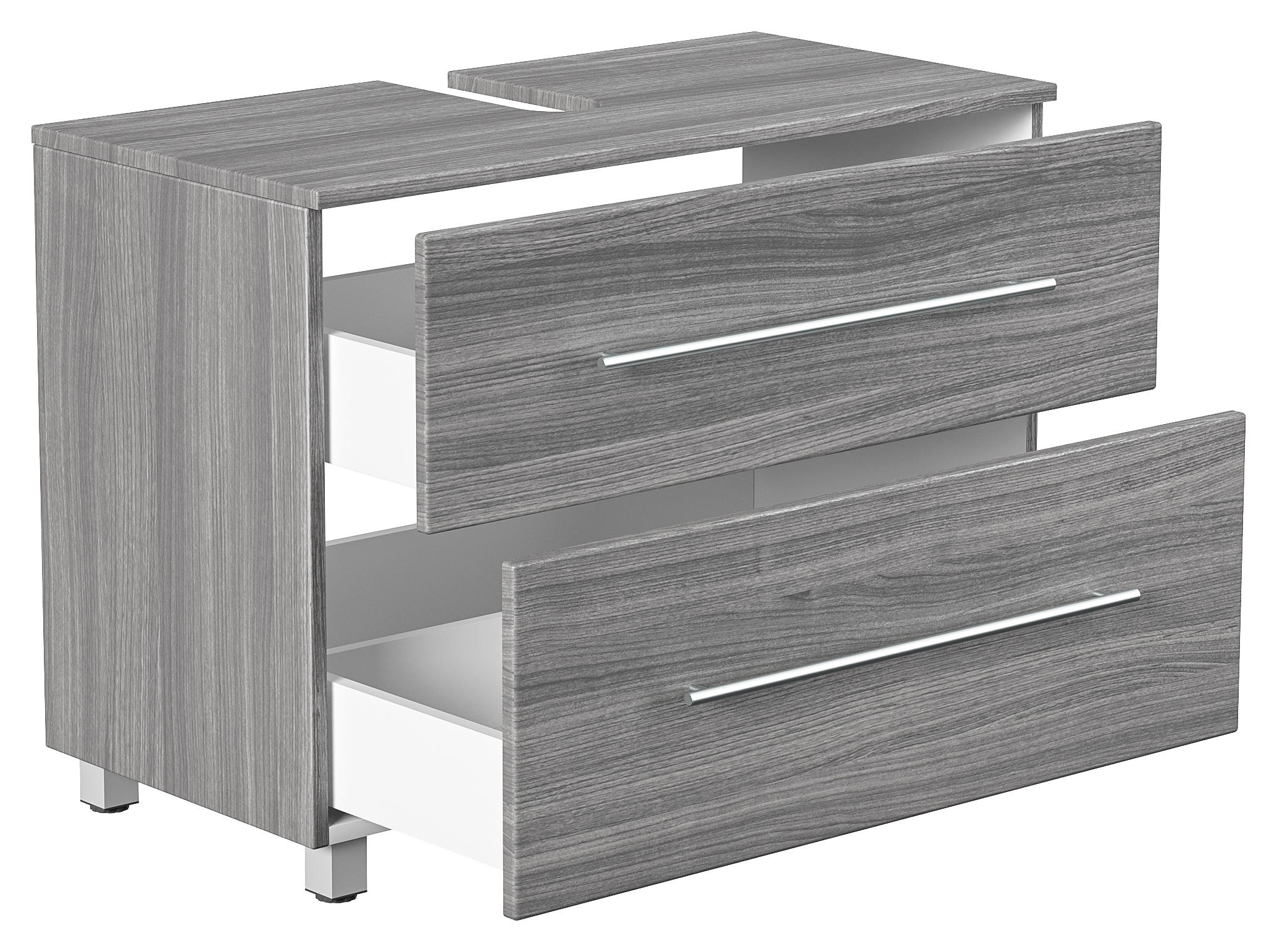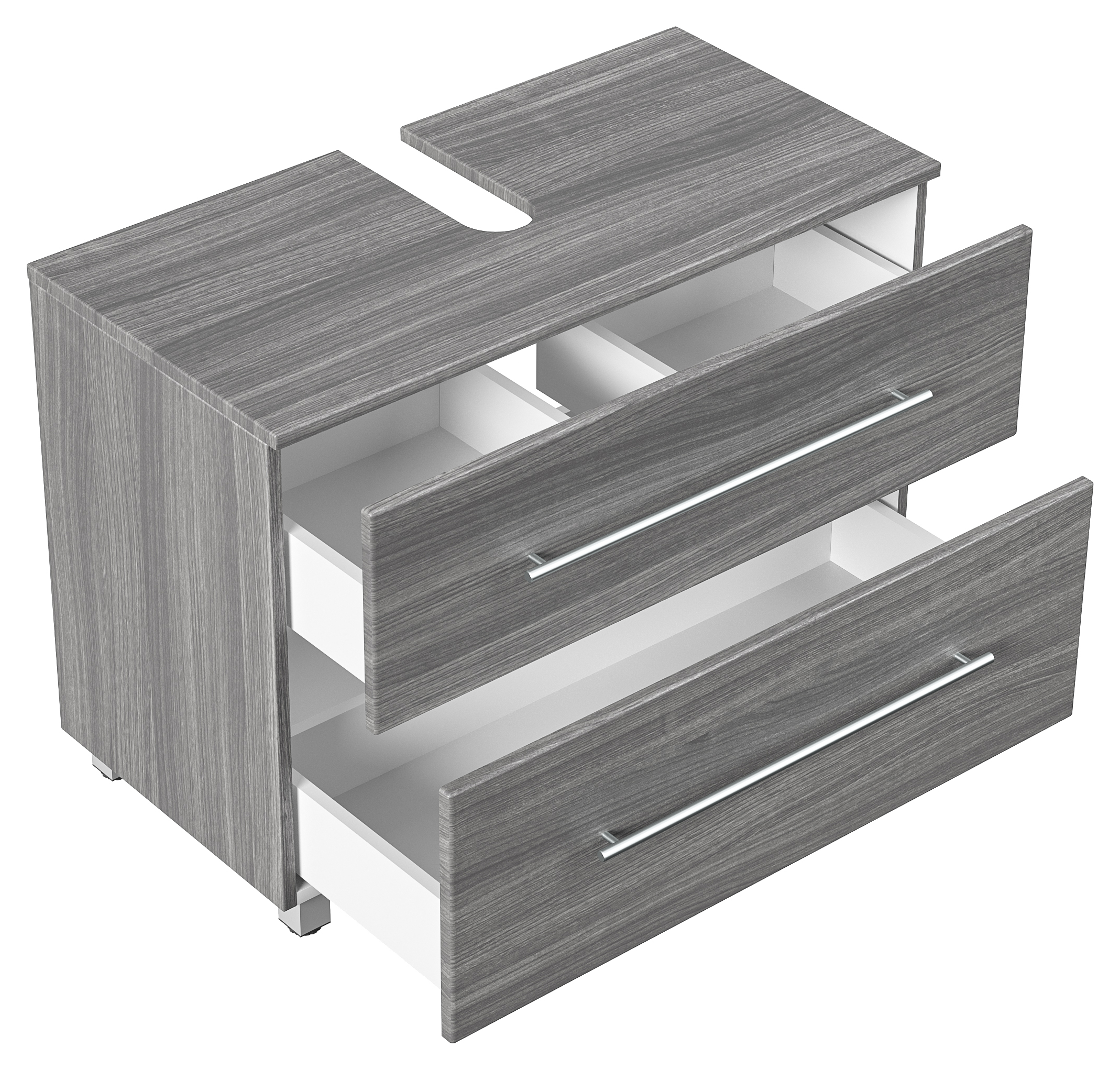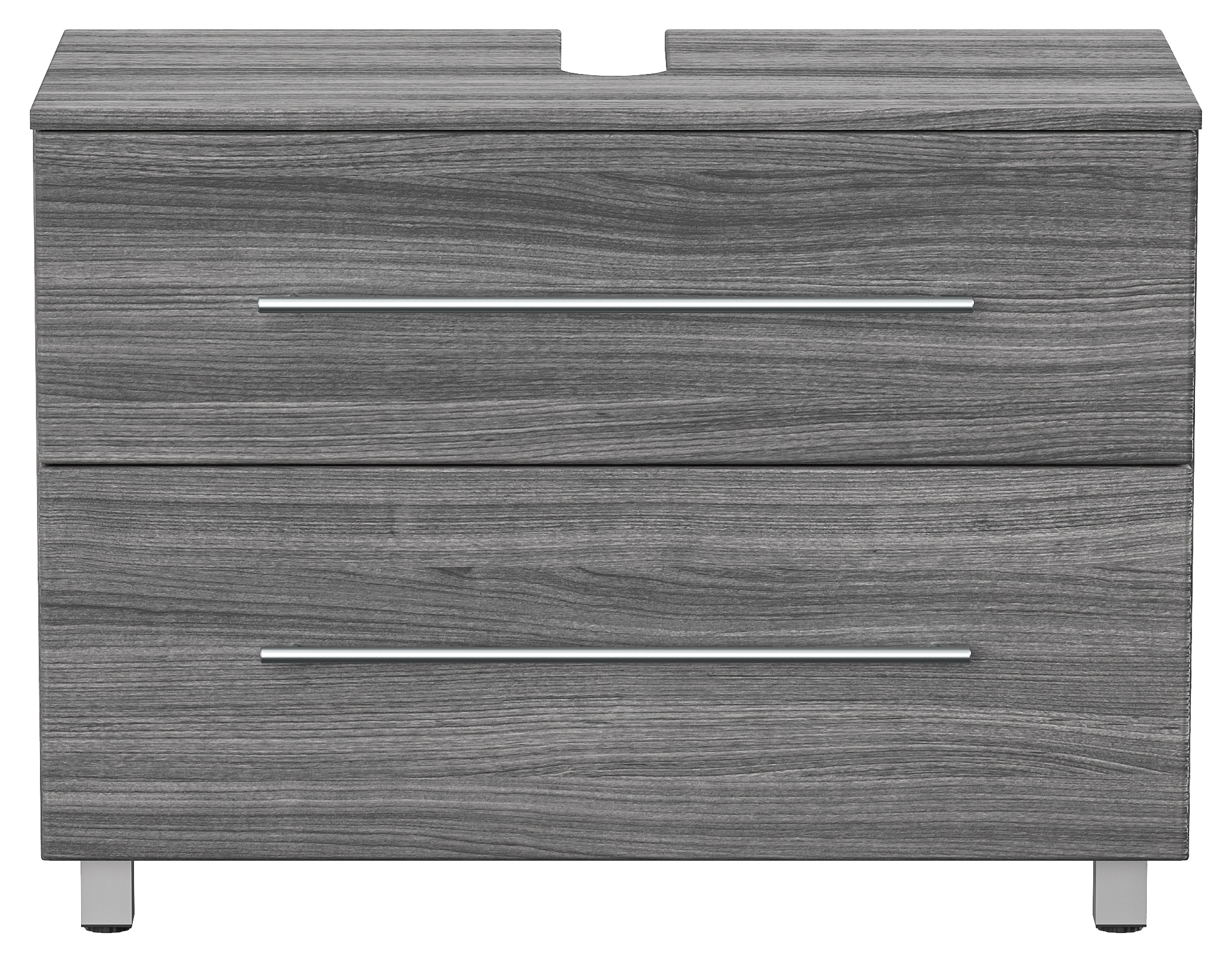 Ihr Waschbecken verwandelt sich in ein attraktives Badmöbel mit diesem Universal Unterbau. Der 85 cm breite Waschbeckenunterschrank mit den Oberflächen in der Farbe Silbereiche wurde für Waschbecken bis zu 100 cm Breite entworfen. Ihr Bad wirkt mit diesem Waschtischunterschrank sofort eleganter. Sie stellen - ohne sanitärtechnische Vorarbeiten - den Waschtischunterschrank unter Ihr Waschbecken - fertig!Der Waschbeckenunterschrank besitzt zwei Schubladen mit extra breiten Griffen aus gebürstetem Edelstahl. Das komfortable Soft-Close-System garantiert selbsttätiges, weiches Schließen der Schubfächer und gestattet deren Vollauszug. Sie werden die größere Übersicht in Ihrem Waschbeckenunterschrank schnell zu schätzen wissen. Das Badmöbel ohne Waschbecken wird als Universal Unterbau in zerlegter Form geliefert. Gestalten Sie Ihr Bad mit wenig Aufwand neu - machen Sie mit diesem Waschbeckenunterschrank aus Ihrem Waschbecken ein elegantes Badmöbel!Nicht im Lieferumfang enthalten sind das Waschbecken, Deko, Spiegel, Armatur, Zuleitungen zum Wasserhahn, Siphon sowie in der Regel ebenfalls nicht der Waschbeckenverschluss Popup. Diese Artikel können gesondert bei uns erworben werden.