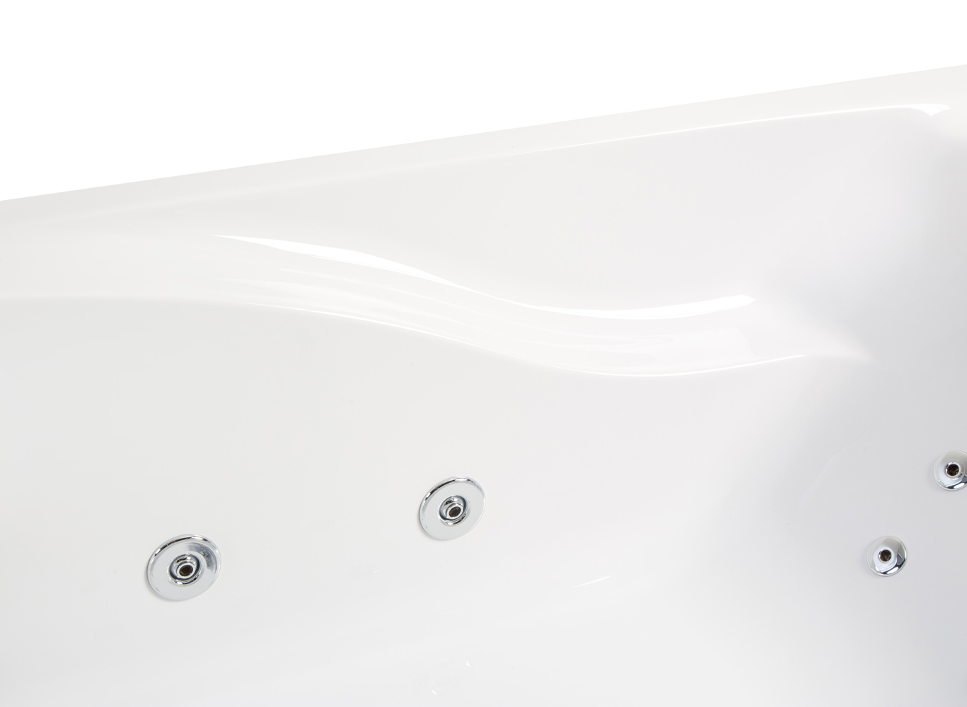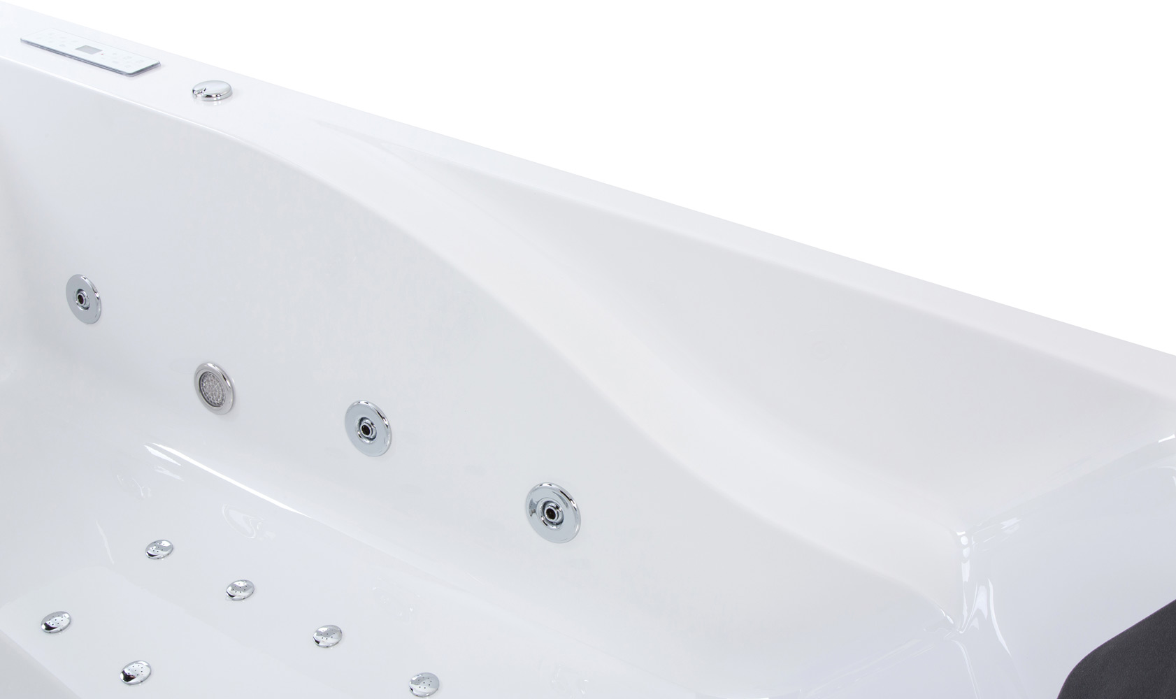 6 Stk. große Seitendüsen Hydrojets Hydromassage, 1x4 Stk. große Düsen Hydrojets Hydromassage im Rückenbereich, 8 Stk. Bodenluftdüsen Aerojets (Prickelnder Sprudel-Effekt).Material: Wanne aus Sanitäracryl auf stabilem Rahmen mit höhenverstellbaren Füßen.